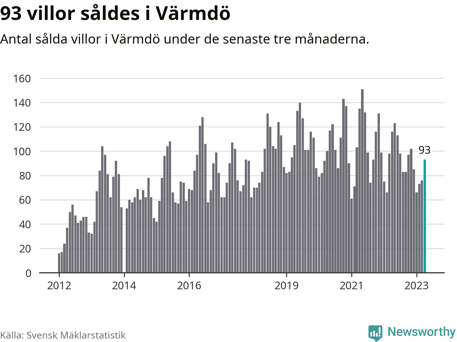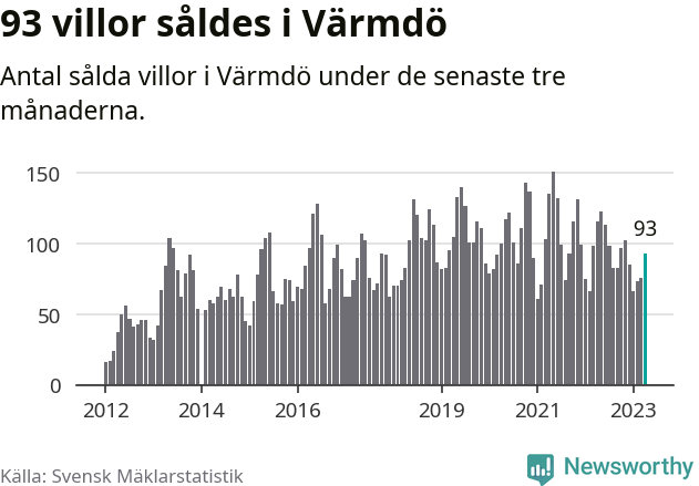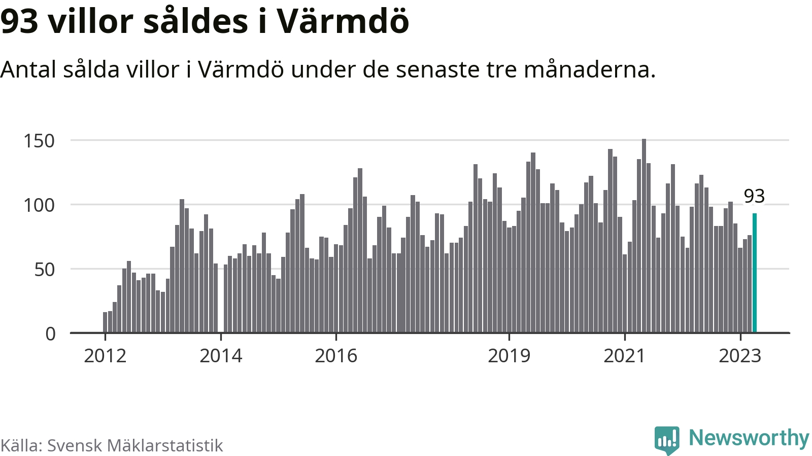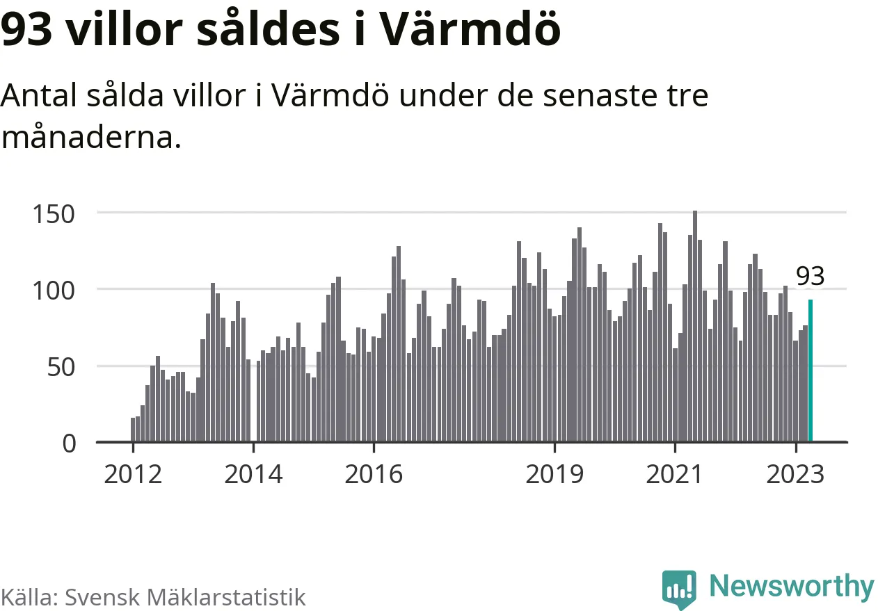 Sammanlagt såldes 93 villor i Värmdö kommun mellan februari och april till ett genomsnittligt pris på 6,0 miljoner kronor. I fjol gjordes 116 affärer vid den här tiden på året.