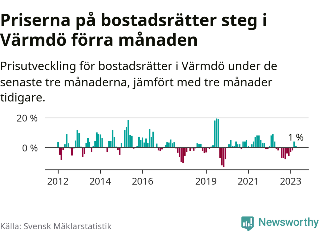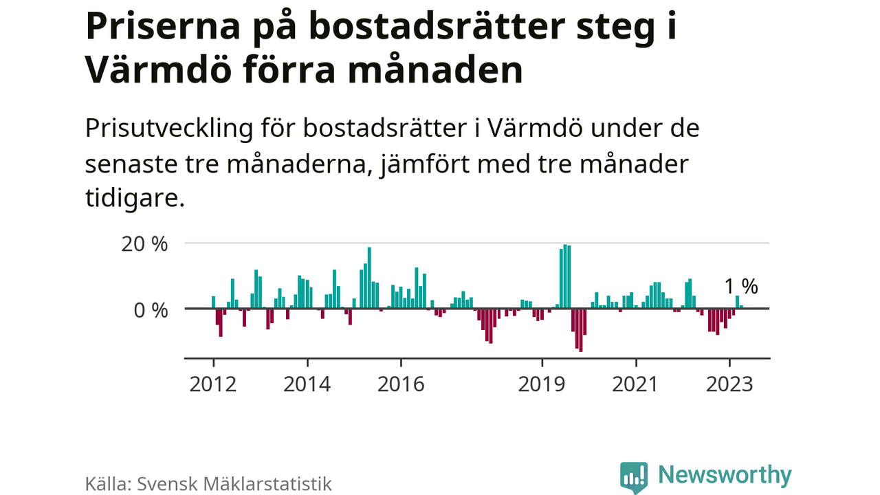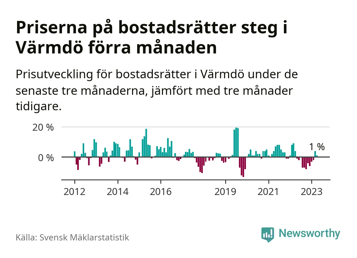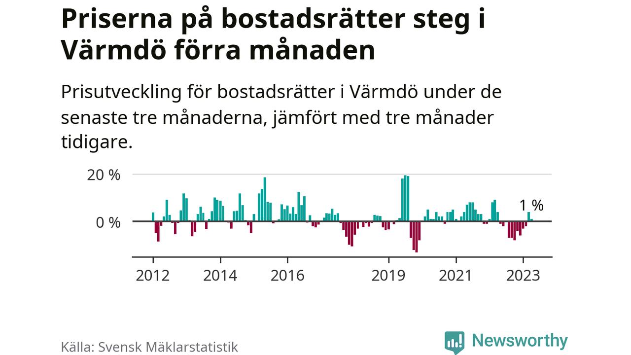 Priserna på bostadsrätter har gått upp i Värmdö kommun. Medelpriset på försäljningarna under de senaste tre månaderna visar på en uppgång med 1 procent.