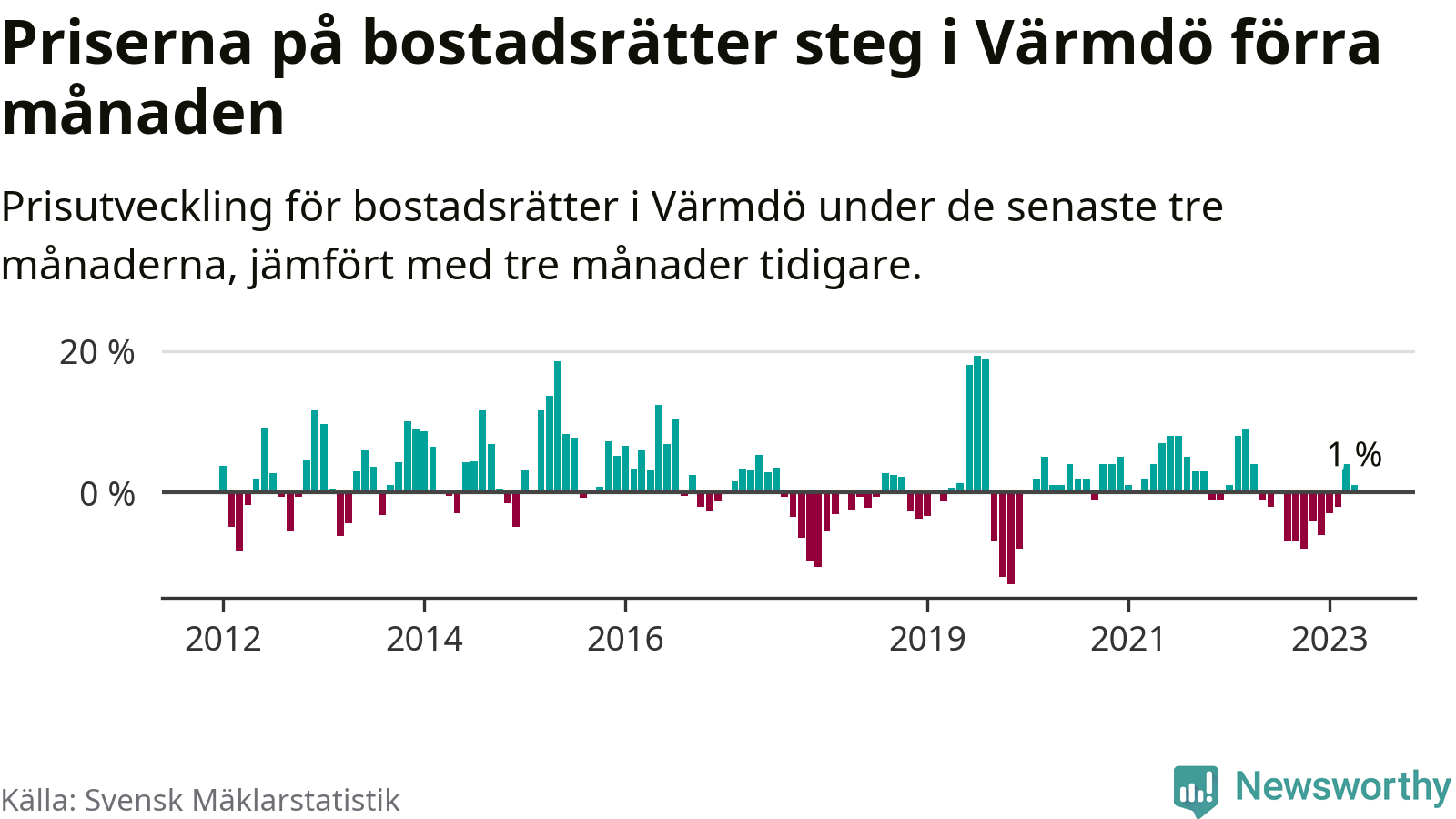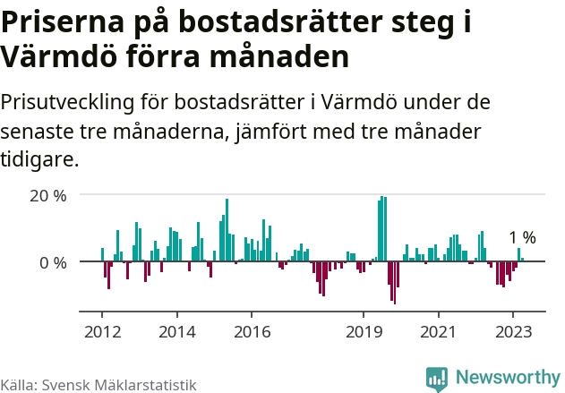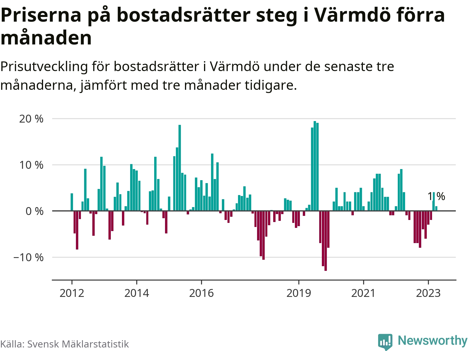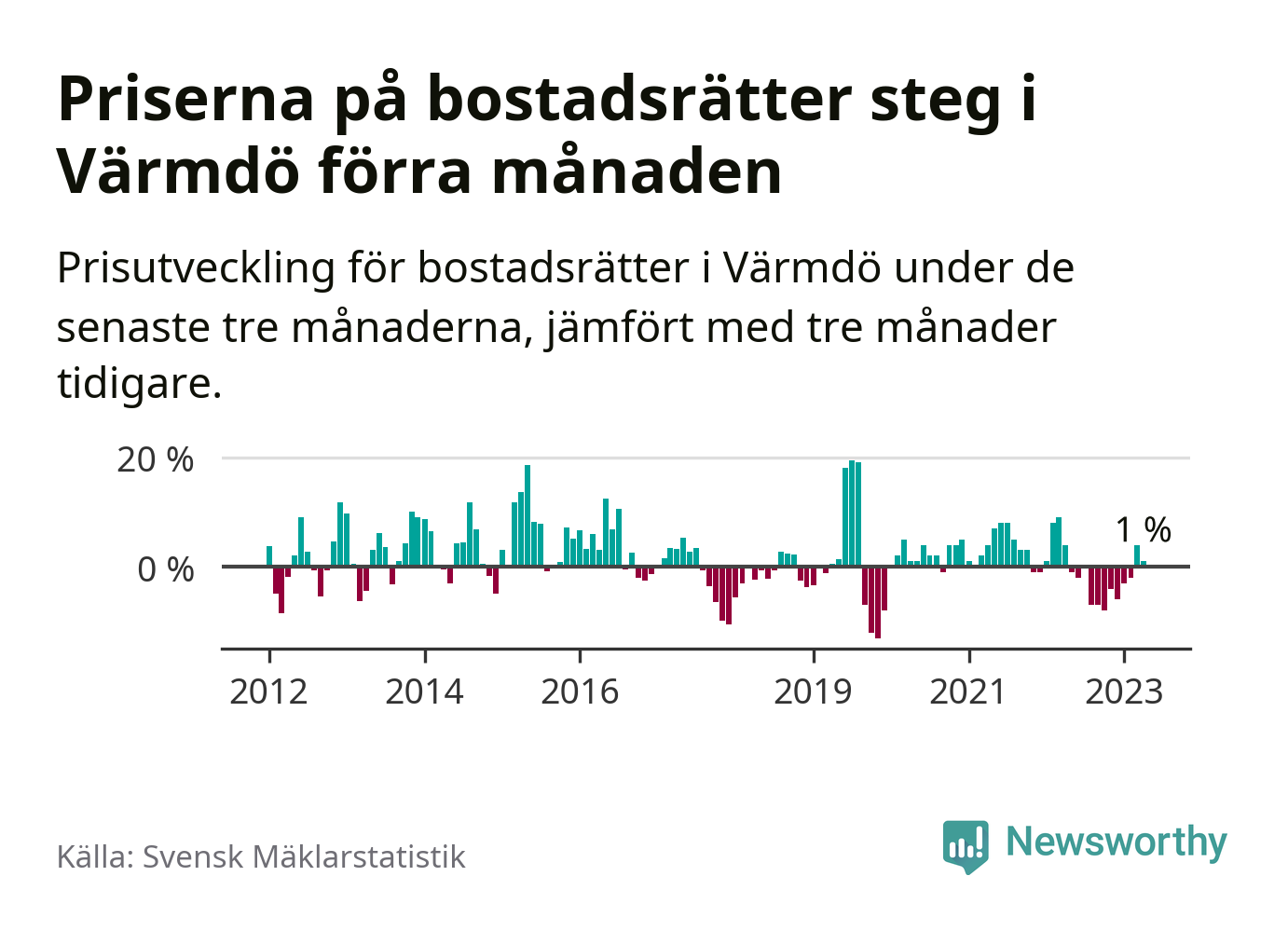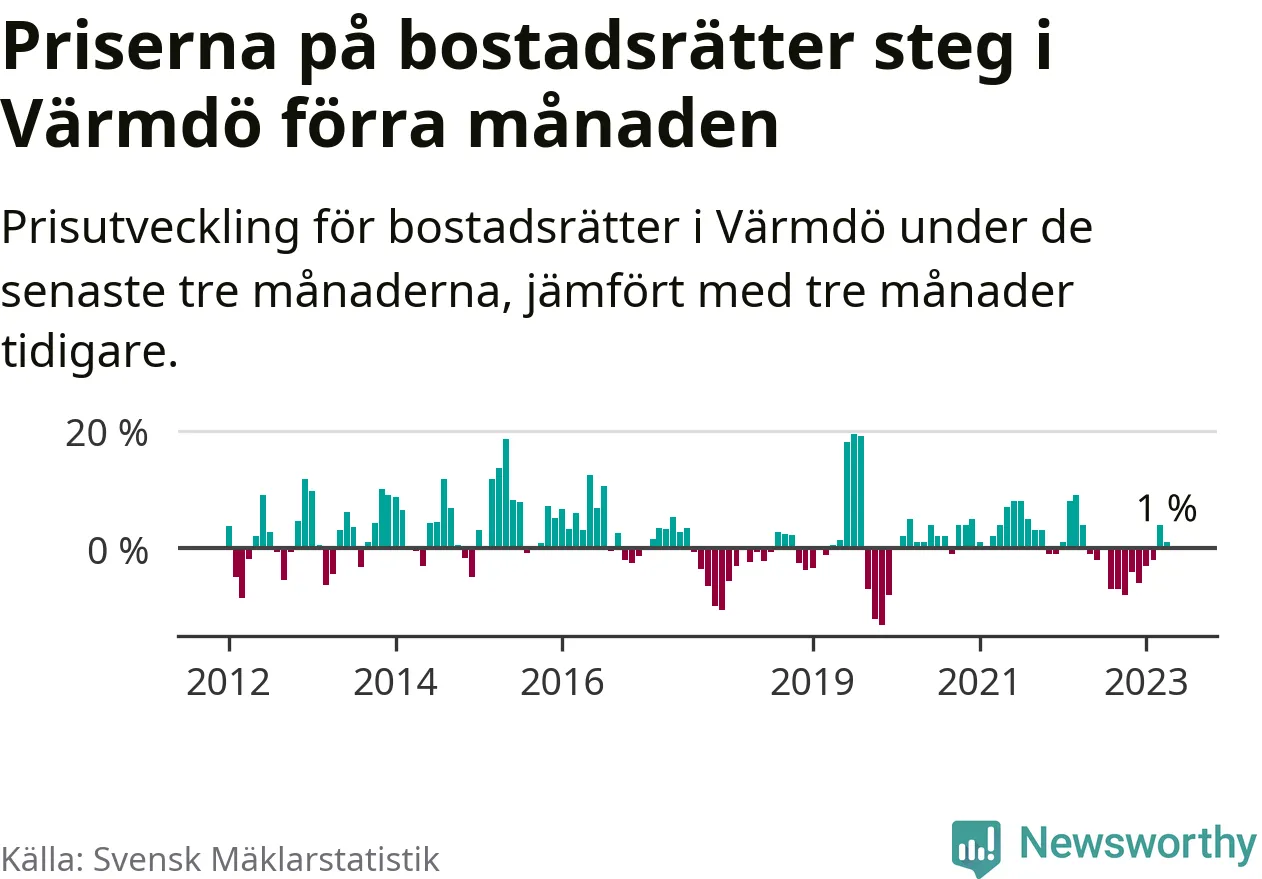 Priserna på bostadsrätter har gått upp i Värmdö kommun. Medelpriset på försäljningarna under de senaste tre månaderna visar på en uppgång med 1 procent.