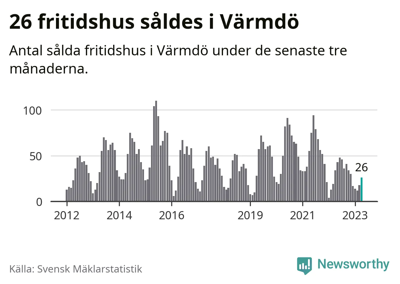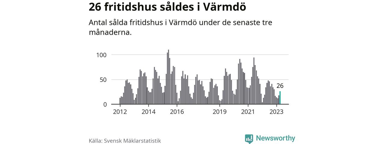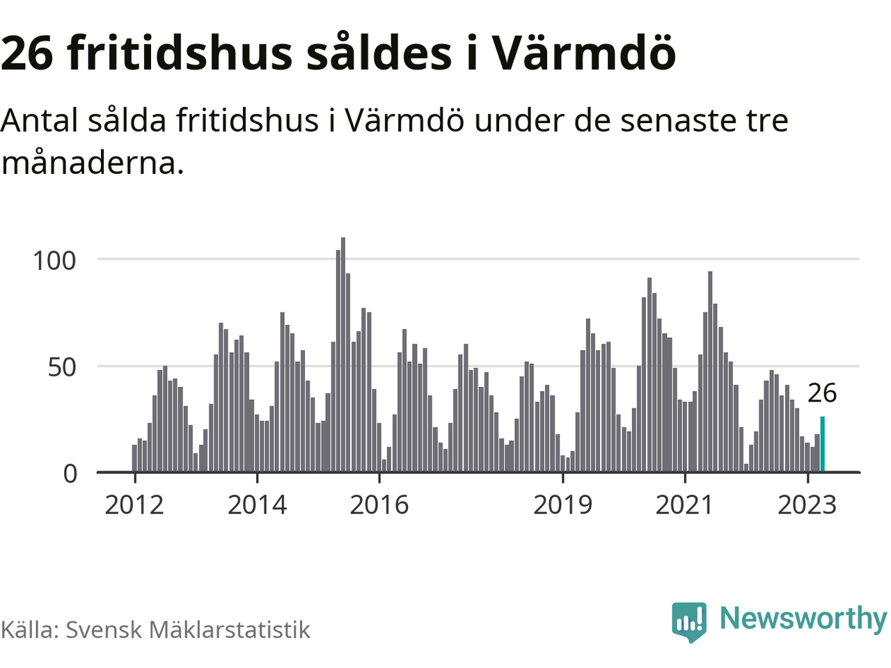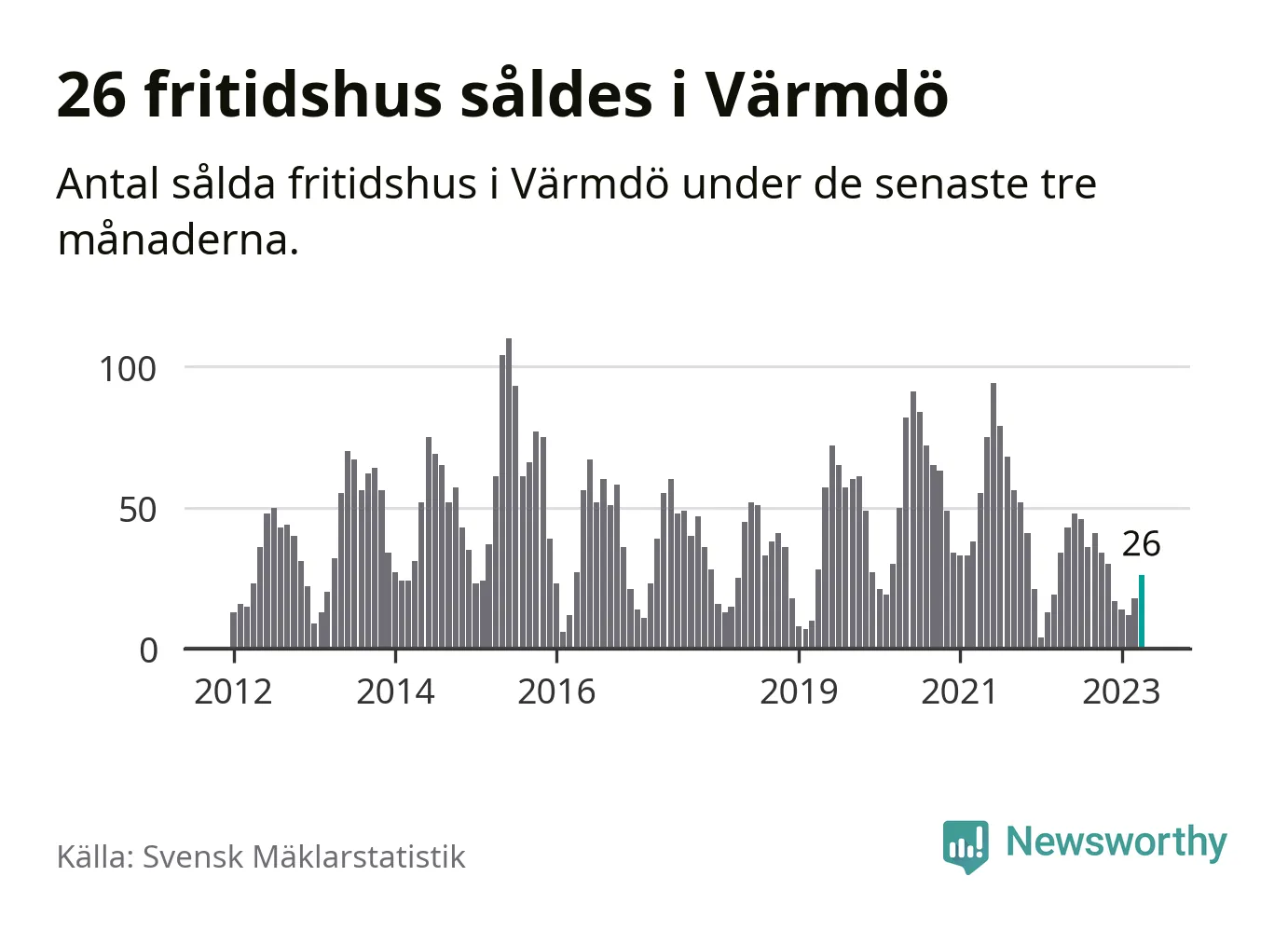 Sammanlagt såldes 26 fritidshus i Värmdö kommun mellan februari och april till ett genomsnittligt pris på 5,4 miljoner kronor. I fjol gjordes 34 affärer vid den här tiden på året.
