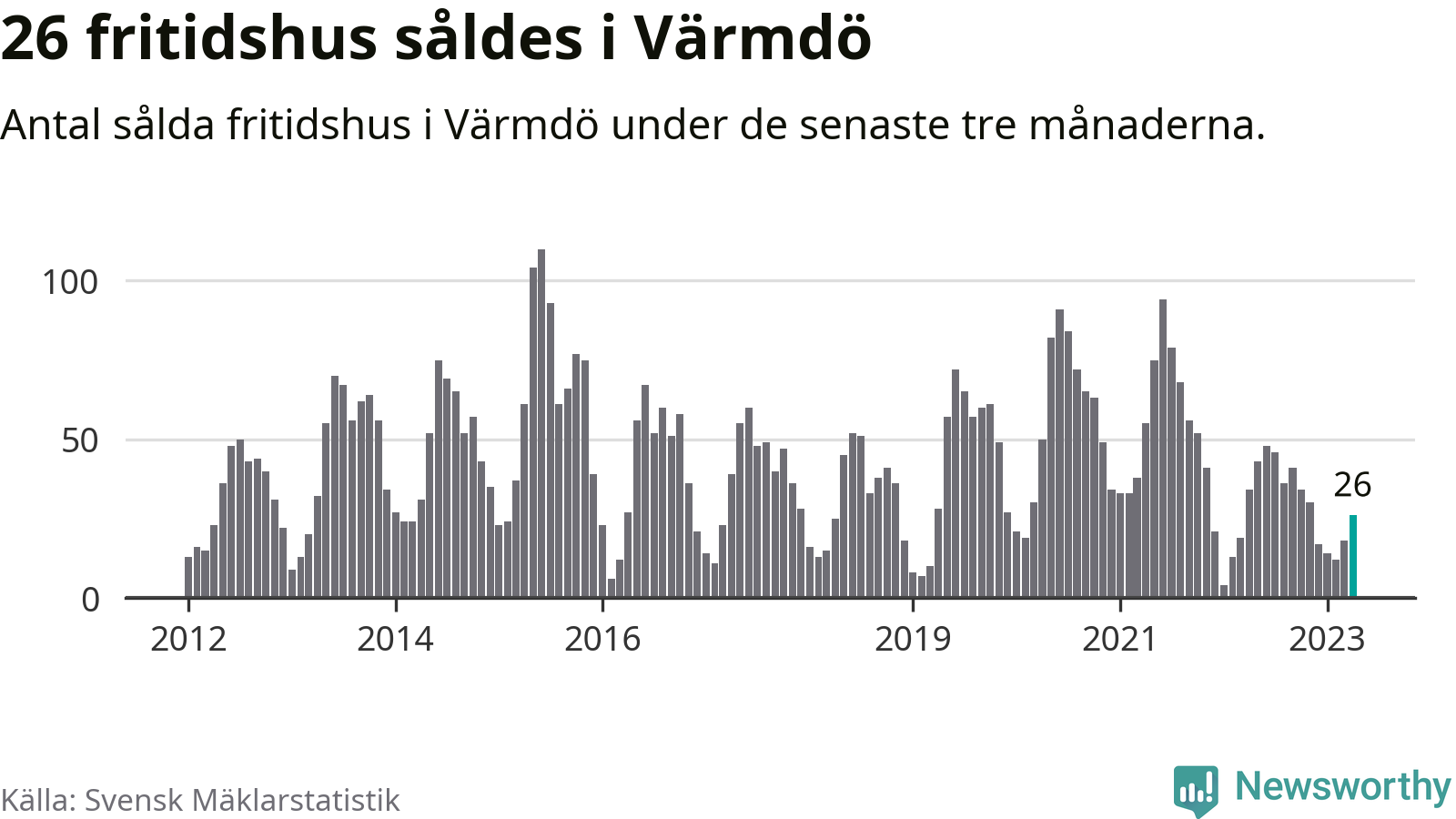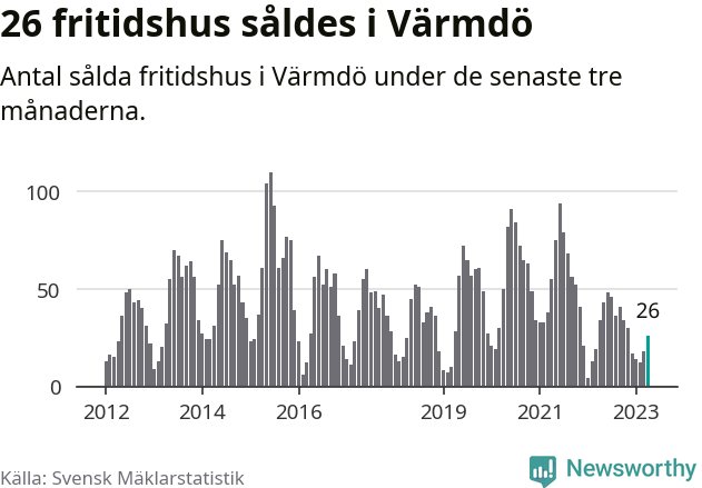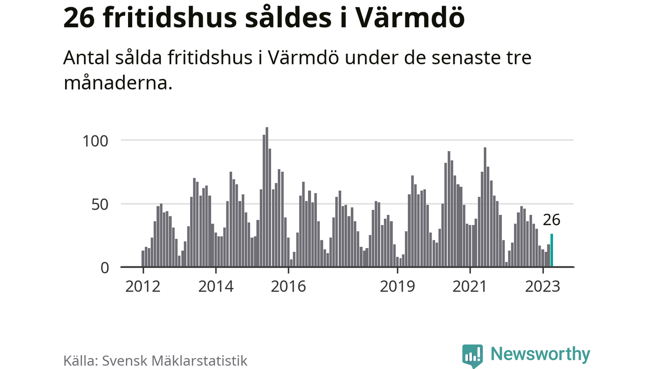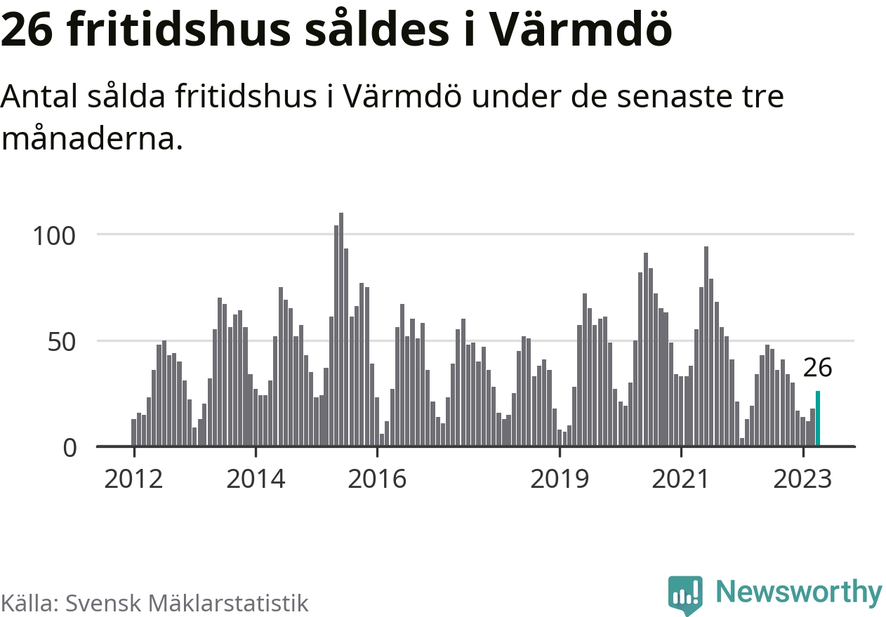 Sammanlagt såldes 26 fritidshus i Värmdö kommun mellan februari och april till ett genomsnittligt pris på 5,4 miljoner kronor. I fjol gjordes 34 affärer vid den här tiden på året.