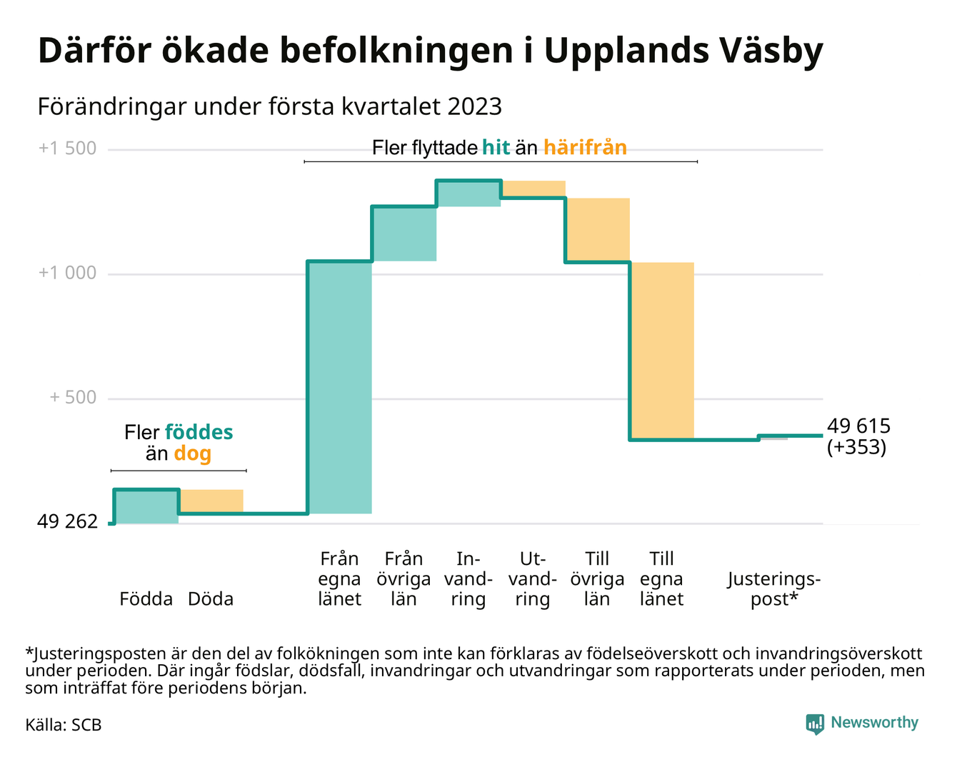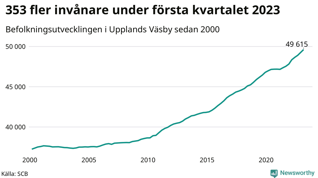 Fler föddes än dog i Upplands Väsby kommun under första kvartalet 2023 och fler flyttade till än från kommunen. Befolkningen ökade med 353 personer jämfört med kvartalet innan. Därmed har Upplands Väsby 49 615 invånare.