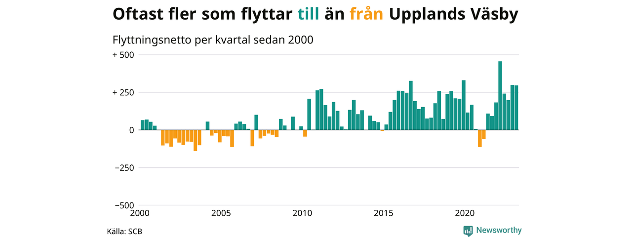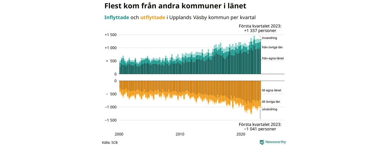Under det första kvartalet flyttade 1 337 personer till Upplands Väsby medan 1 041 flyttade ut. Kommunen hade med andra ord ett positivt flyttnetto.