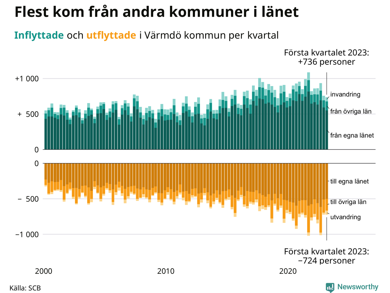 Under det första kvartalet flyttade 736 personer till Värmdö medan 724 flyttade ut. Kommunen hade med andra ord ett positivt flyttnetto.
