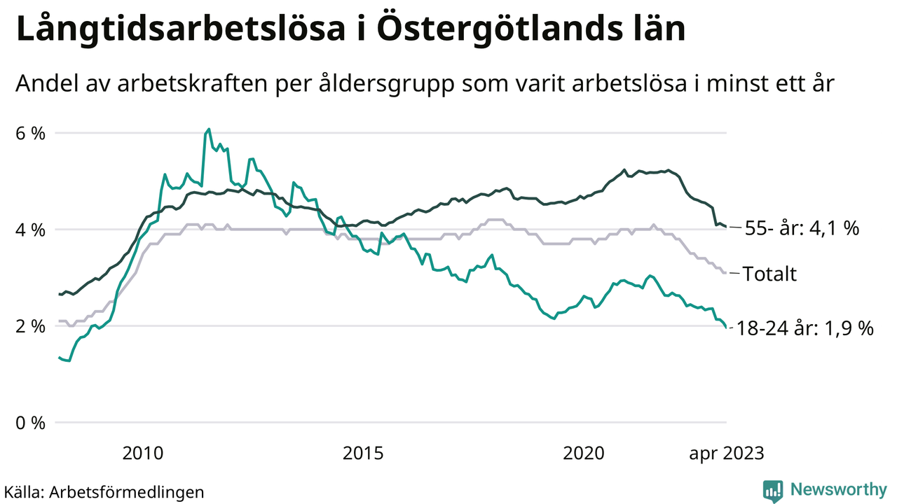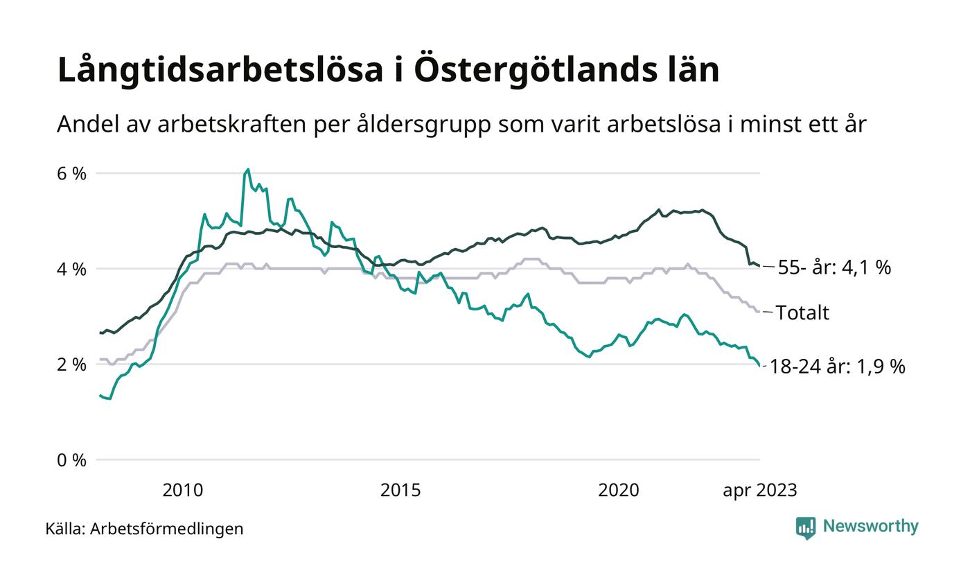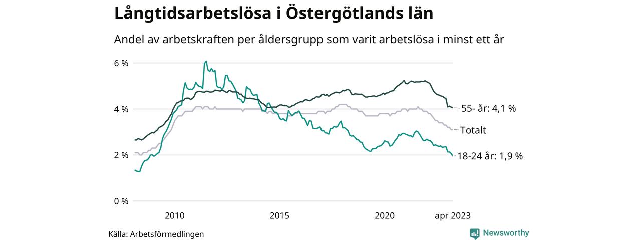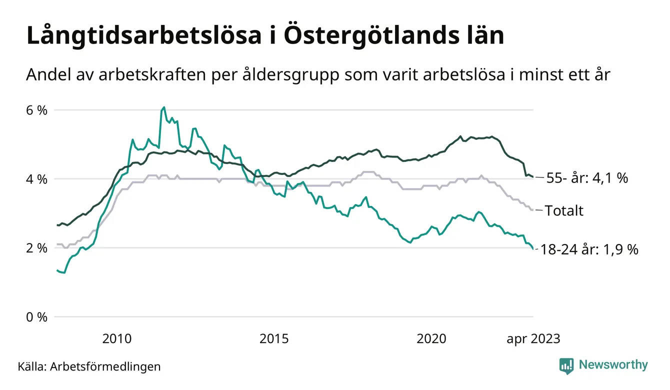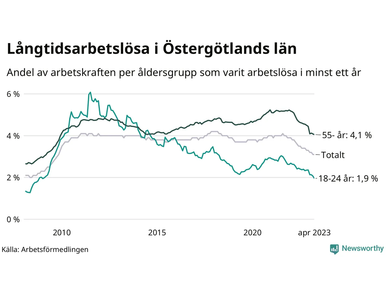 Av de 7 190 personerna som varit arbetslösa i mer än ett år i Östergötlands län är 1 929 personer mellan 55 och 651 år och 464 är mellan 18 och 24 år. För den äldre gruppen är andelen arbetslösa 4,1 procent medan den i den yngre gruppen är 1,9 procent. Även i riket som helhet är långtidsarbetslösheten högre i gruppen äldre.