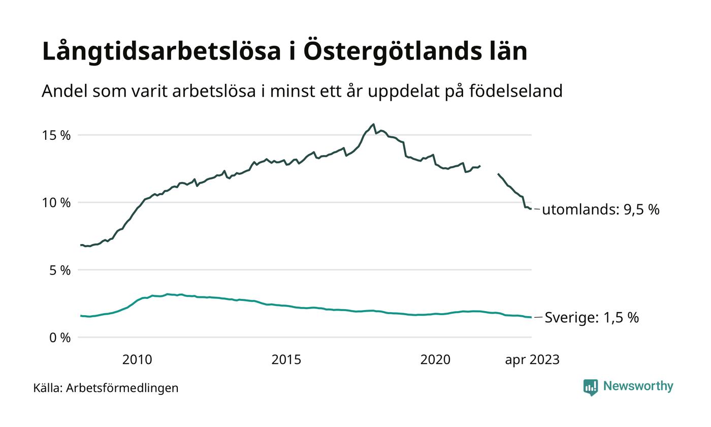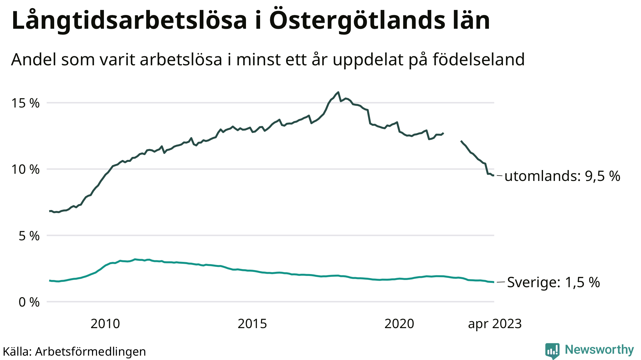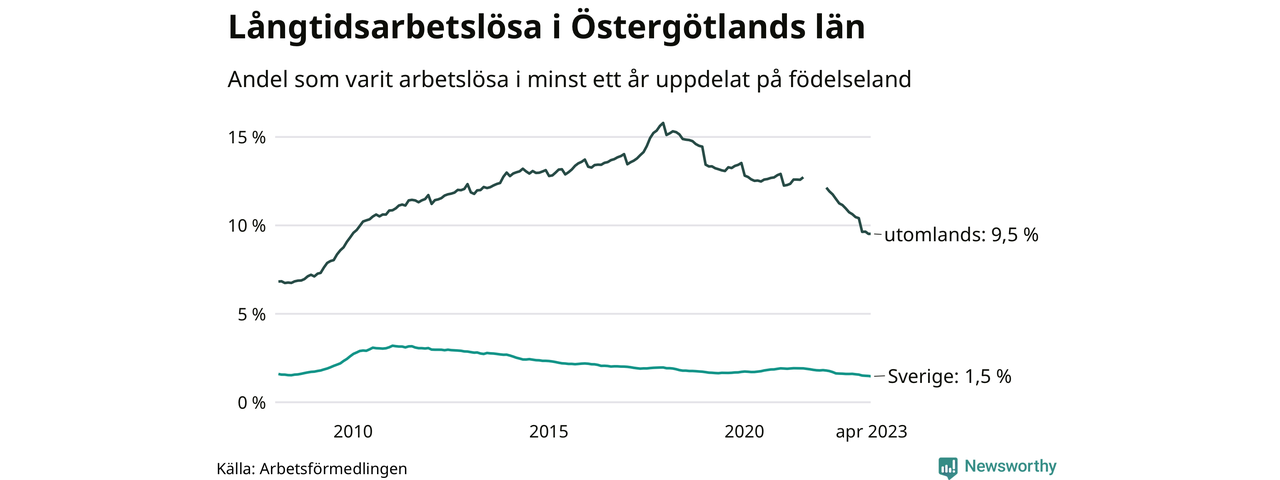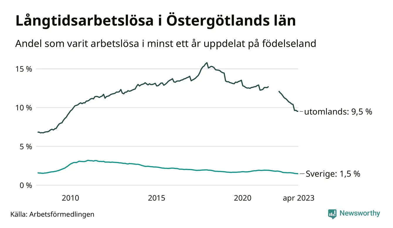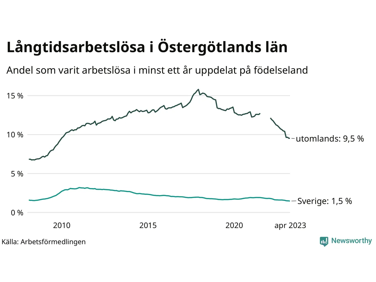 2 702 av de långtidsarbetslösa i Östergötland är födda i Sverige, medan 4 488 är födda utomlands. Det innebär att långtidsarbetslösheten bland Sverigefödda är 1,5 procent, medan den är sex gånger så hög – 9,5 procent – bland födda utomlands. Även i riket som helhet är arbetslösheten högre bland utrikesfödda.