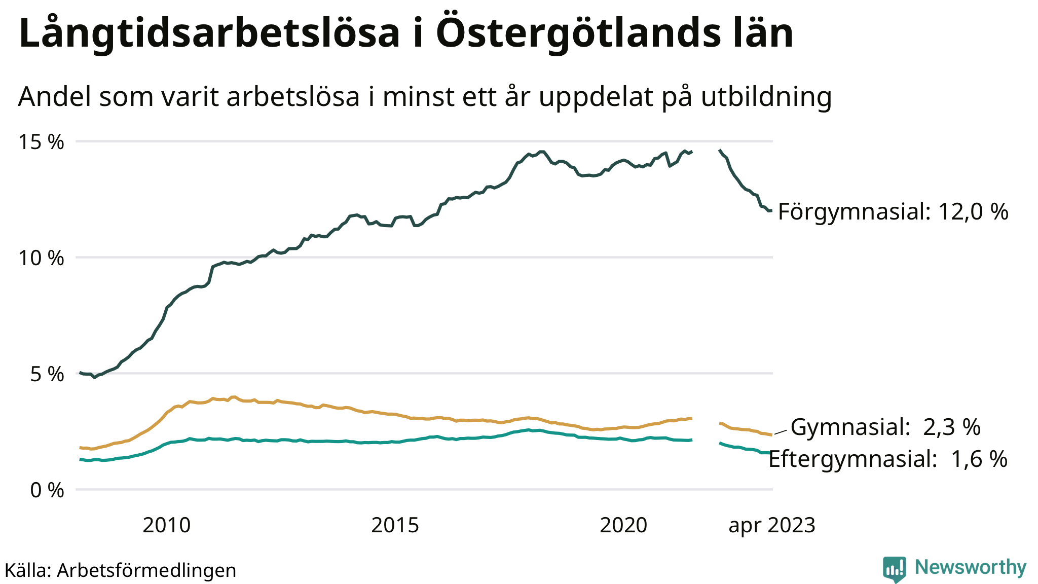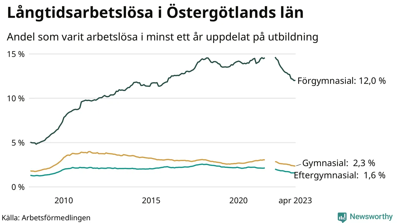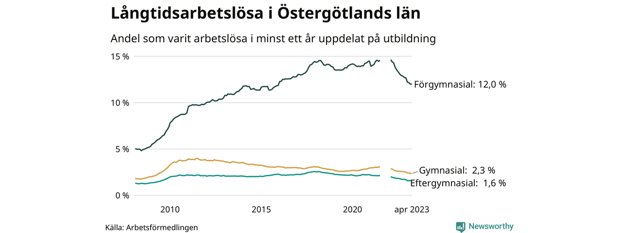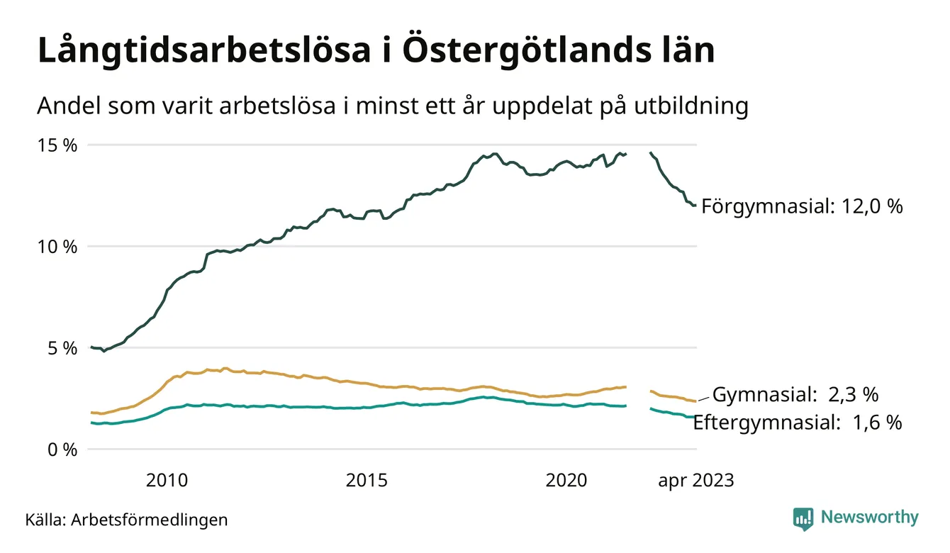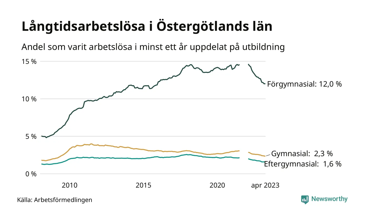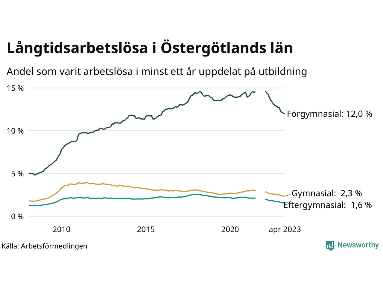 Även när det gäller utbildningsnivå är skillnaderna stora. 3 179 av de som varit arbetslösa i minst ett år har inte någon gymnasieutbildning, vilket motsvarar en långtidsarbetslöhet på 12,0 procent i den gruppen. Det kan jämföras med 2,3 procent bland dem som gått ut gymnasiet och 1,6 procent bland dem som studerat vidare efter gymnasiet.