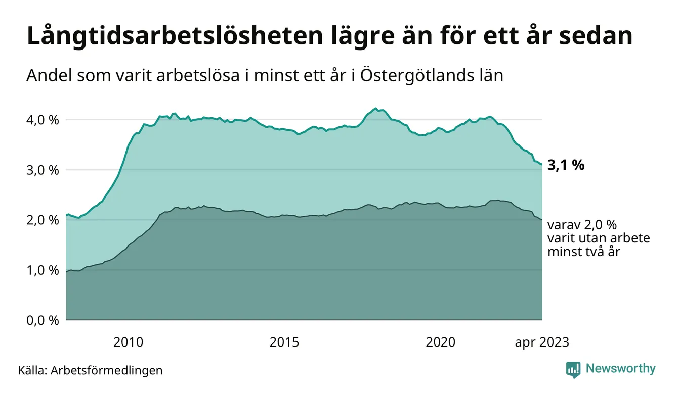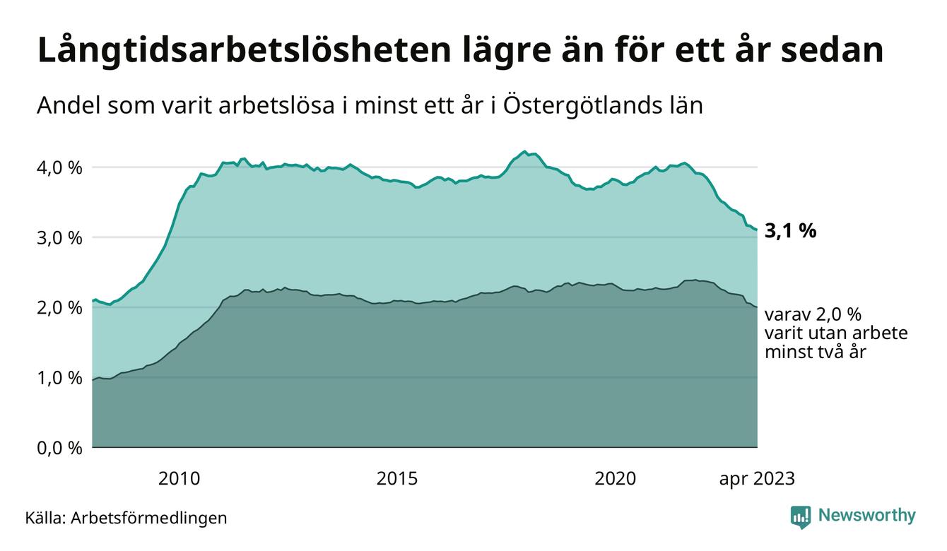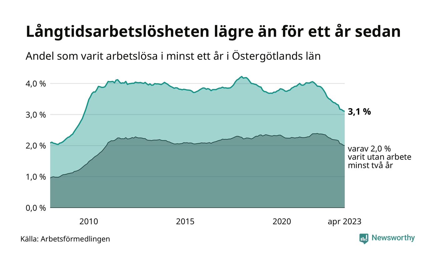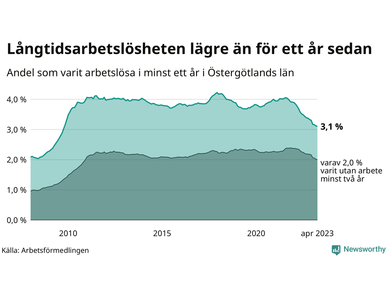 I april hade 7 190 Östgötabor varit arbetslösa i minst ett år, vilket är 59 färre än månaden innan. Det är den tjugonde månaden i rad med minskande antal långtidsarbetslösa. 7 190 personer motsvarar 3,1 procent av arbetskraften i länet – andelen långtidsarbetslösa är 0,6 procentenheter lägre än samma månad för ett år sedan.