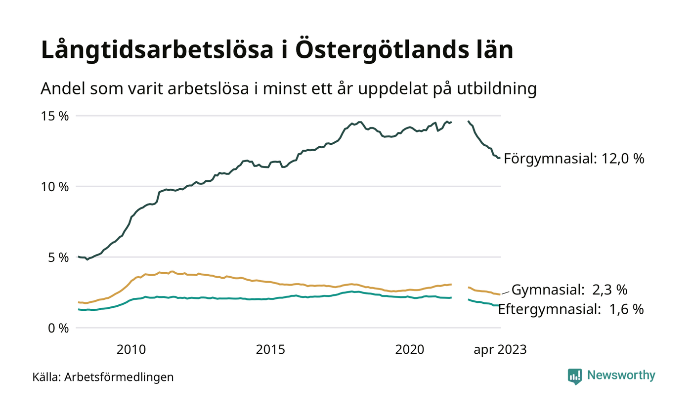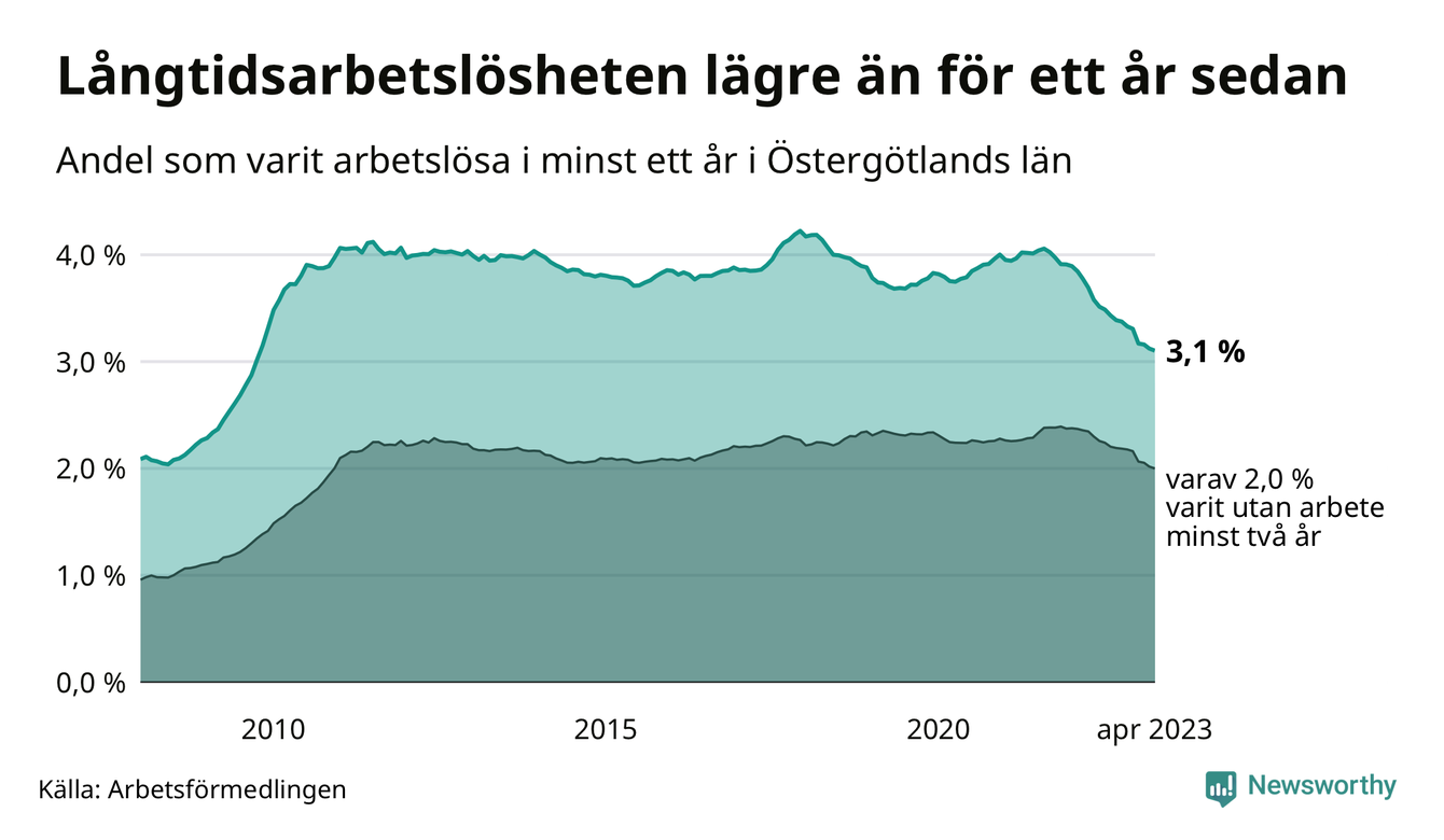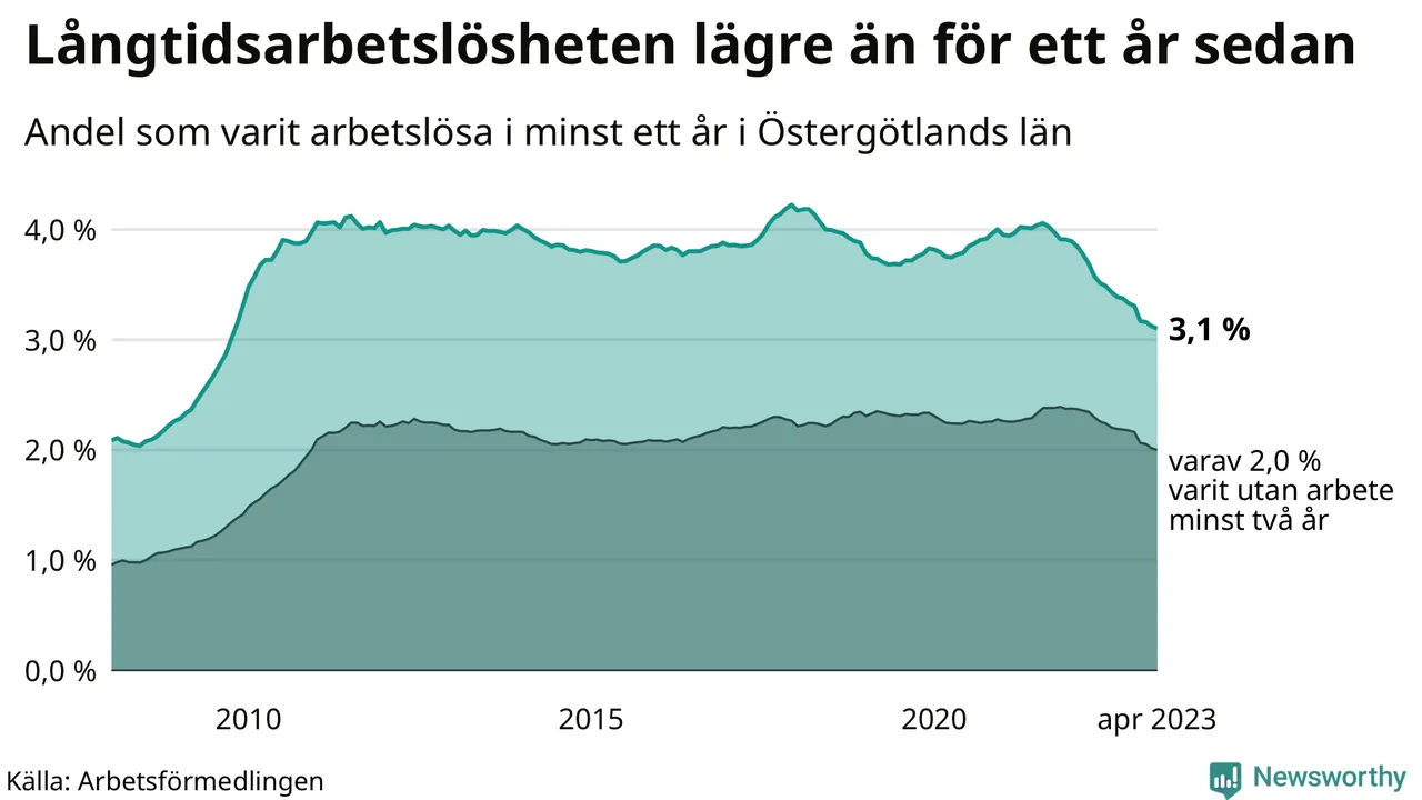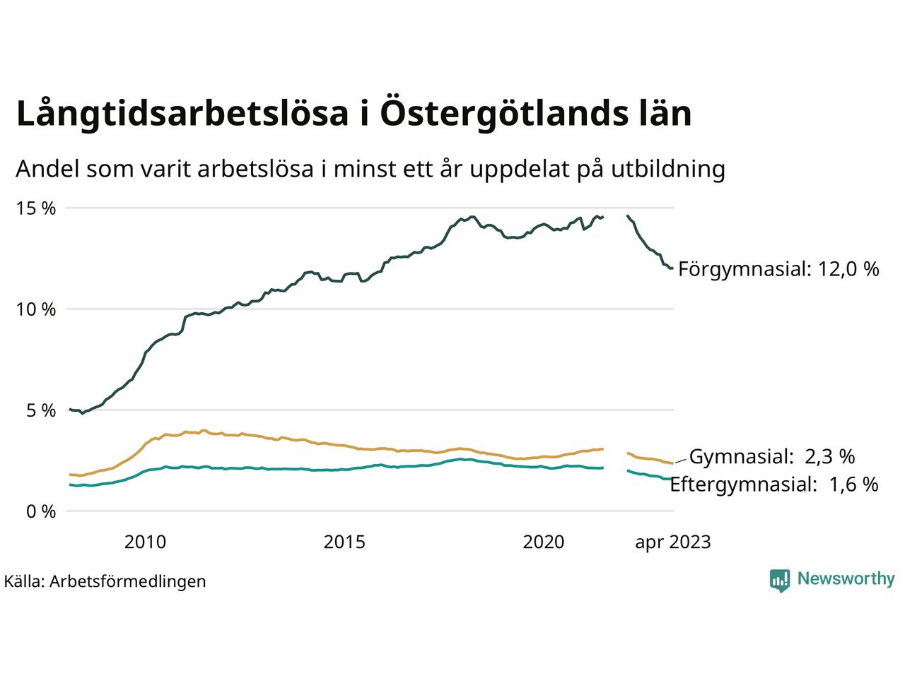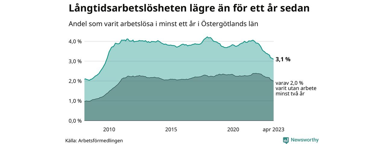 I april hade 7 190 Östgötabor varit arbetslösa i minst ett år, vilket är 59 färre än månaden innan. Det är den tjugonde månaden i rad med minskande antal långtidsarbetslösa. 7 190 personer motsvarar 3,1 procent av arbetskraften i länet – andelen långtidsarbetslösa är 0,6 procentenheter lägre än samma månad för ett år sedan.
