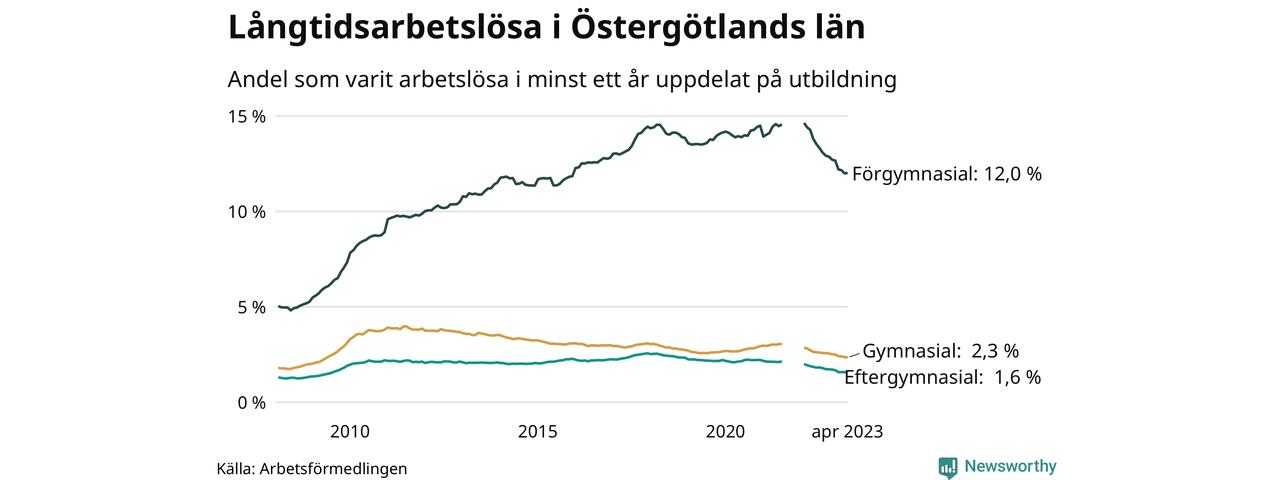 Högst andel långtidsarbetslösa bland kommunerna i Östergötland hade Norrköping, 4,3 procent, i april. Lägst andel fanns i Ydre (1,3 procent).