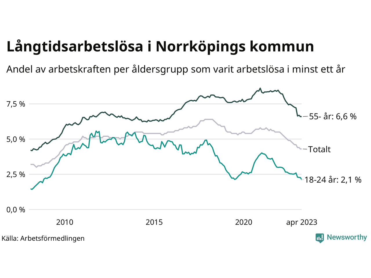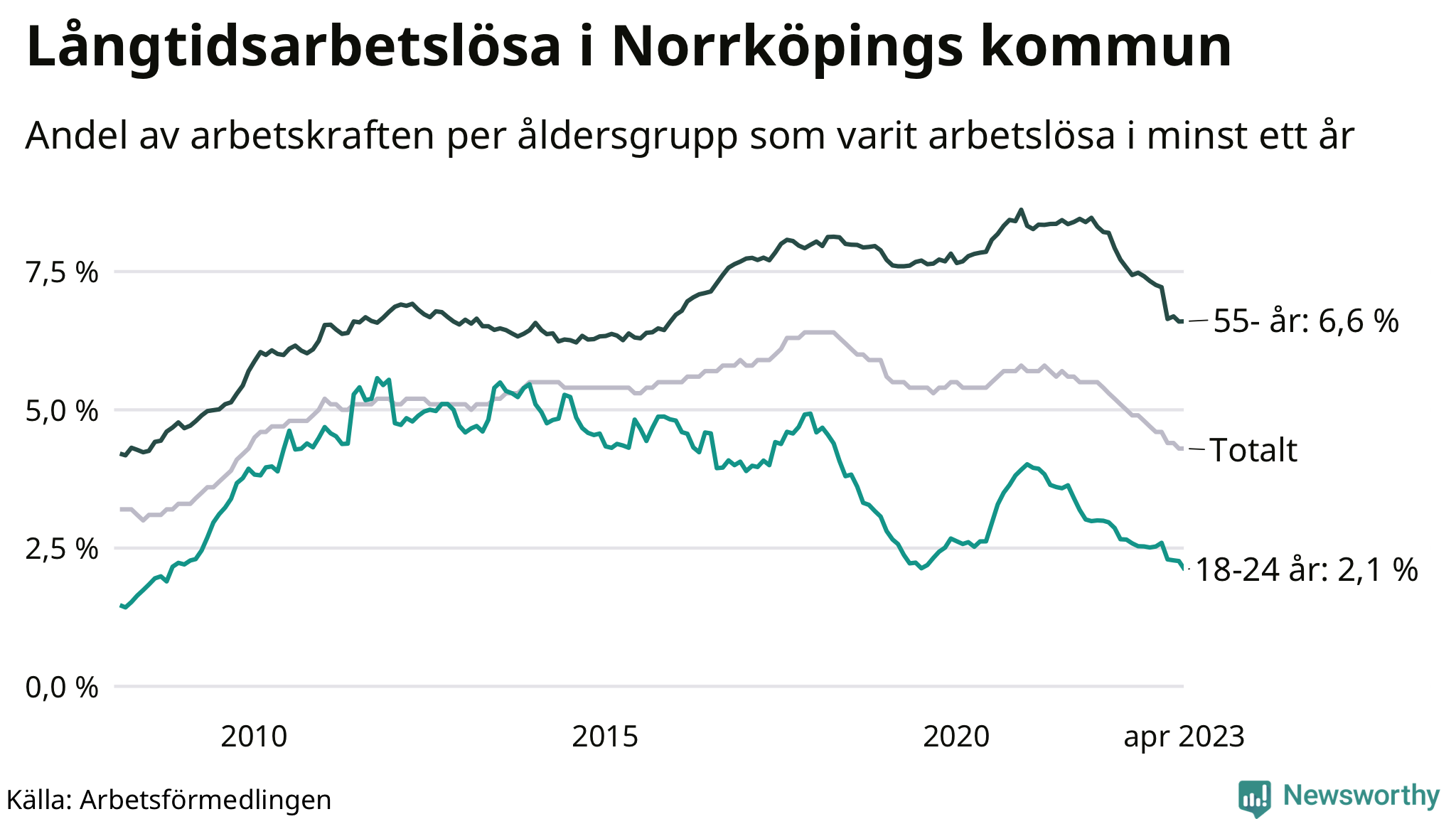 Graf: Andel arbetslösa uppdelat i åldersgrupper i Norrköping