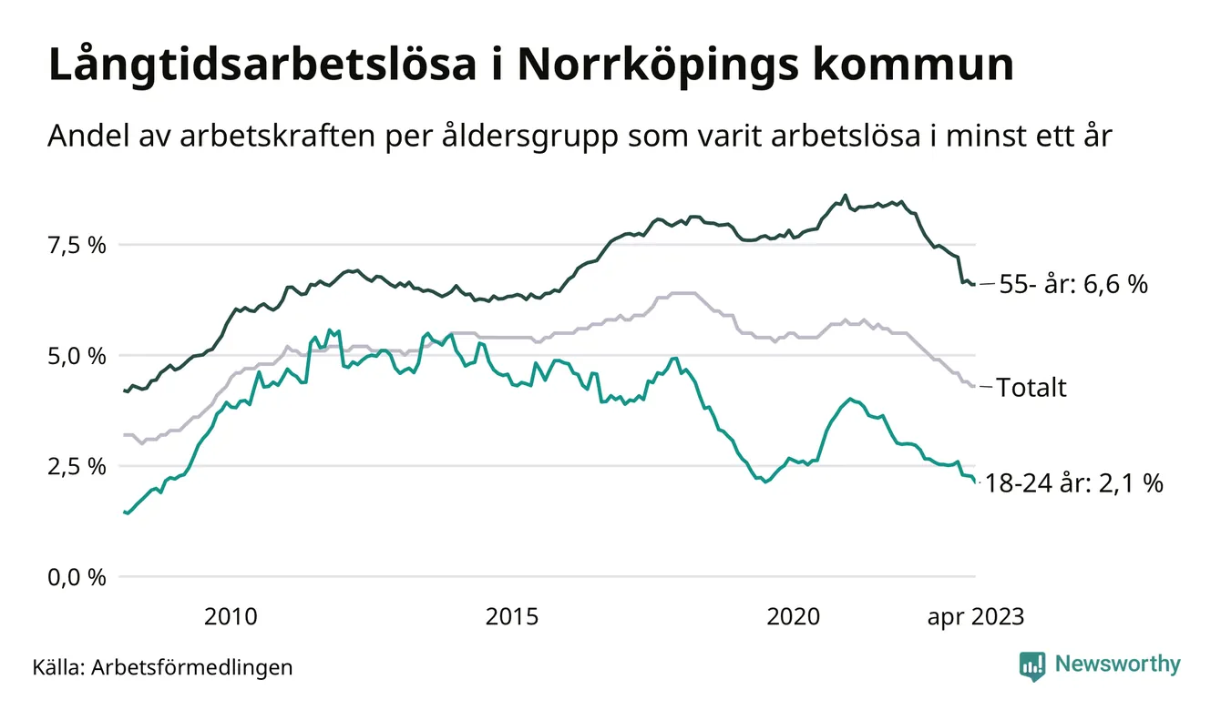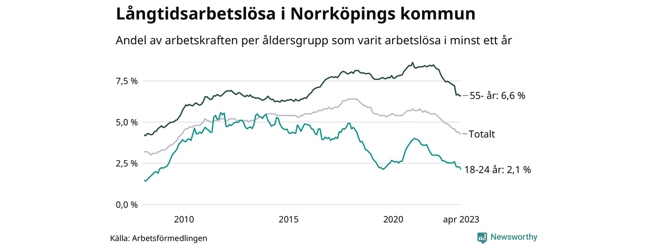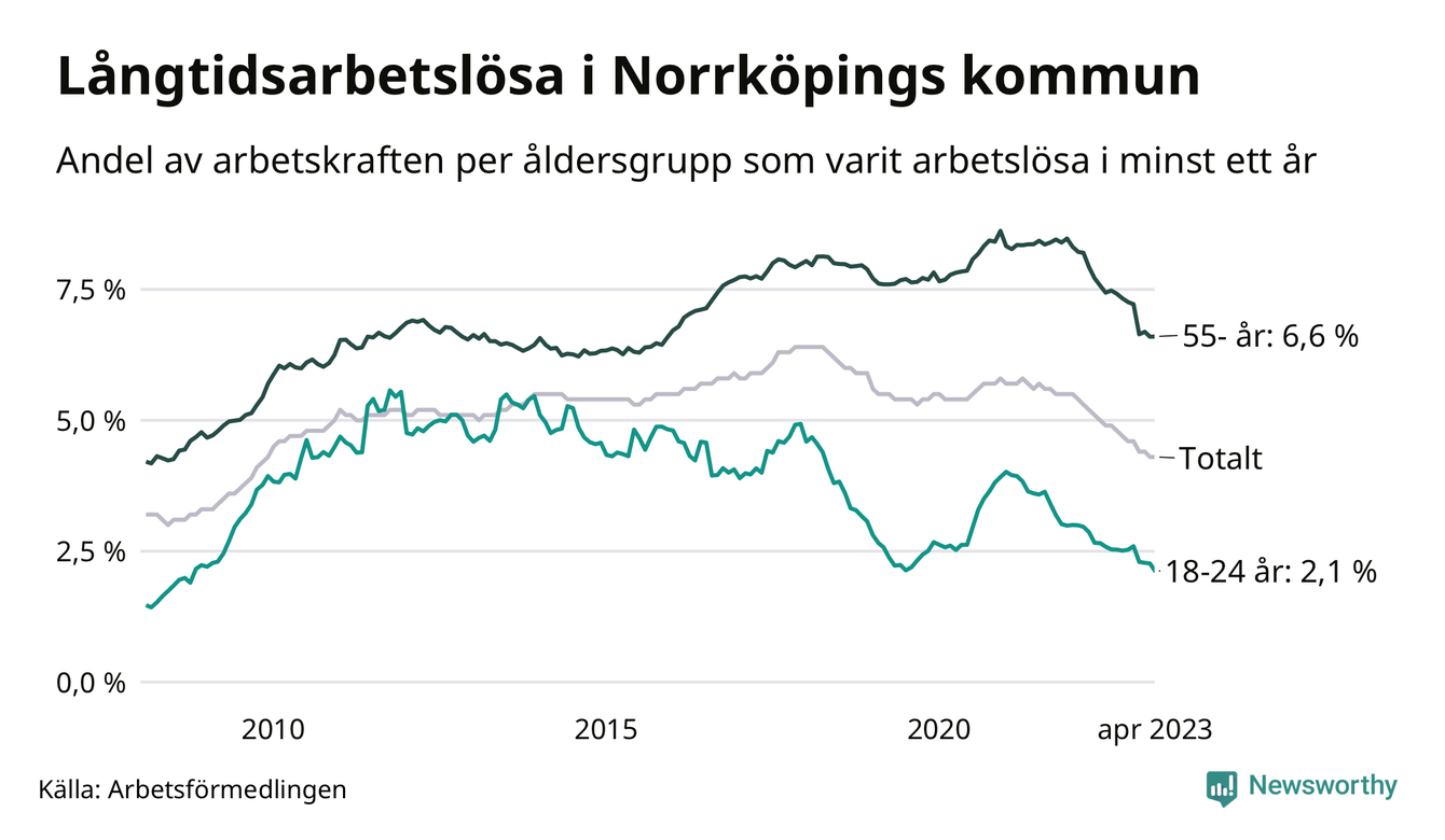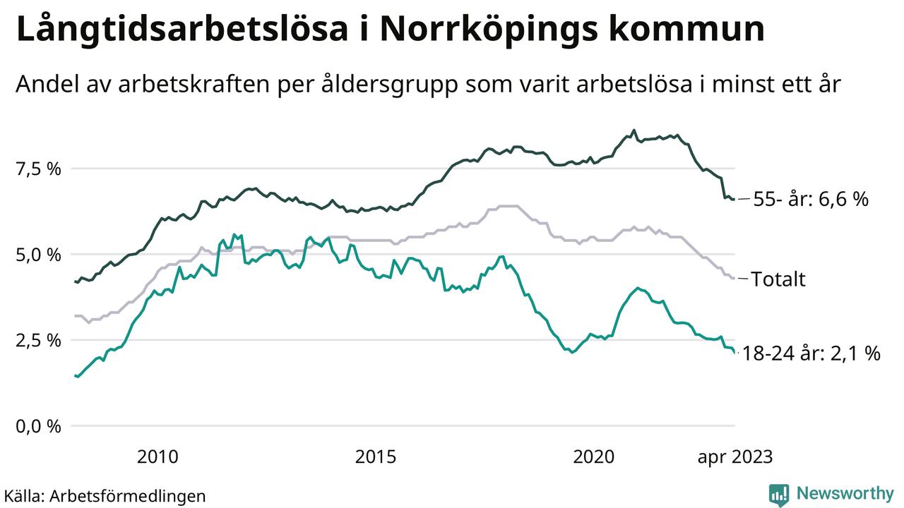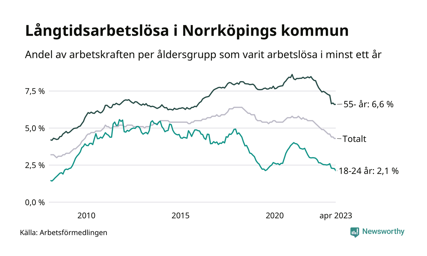 Av de 3 139 personerna som varit arbetslösa i mer än ett år i Norrköpings kommun är 945 personer mellan 55 och 651 år och 163 är mellan 18 och 24 år. För den äldre gruppen är andelen arbetslösa 6,6 procent medan den i den yngre gruppen är 2,1 procent. Även i riket som helhet är långtidsarbetslösheten högre i gruppen äldre.
