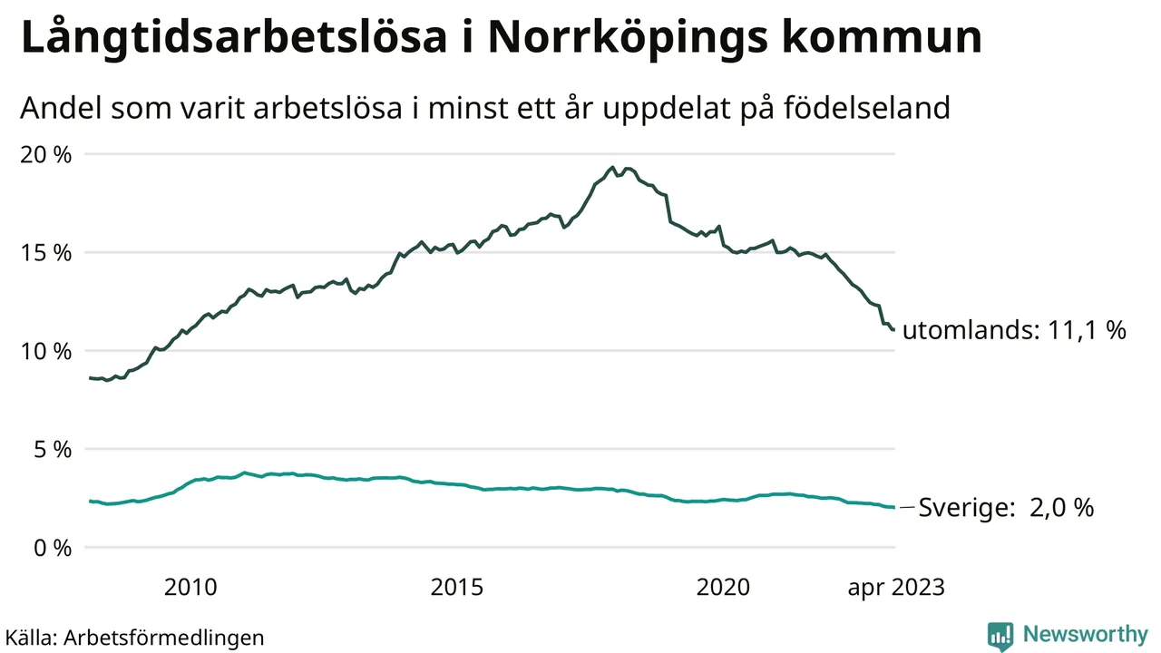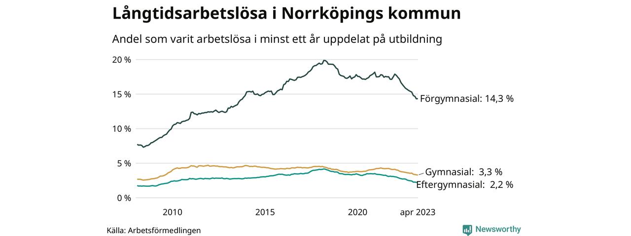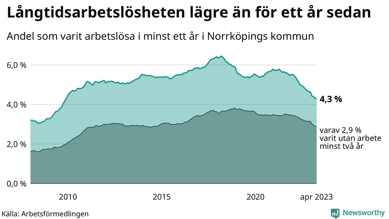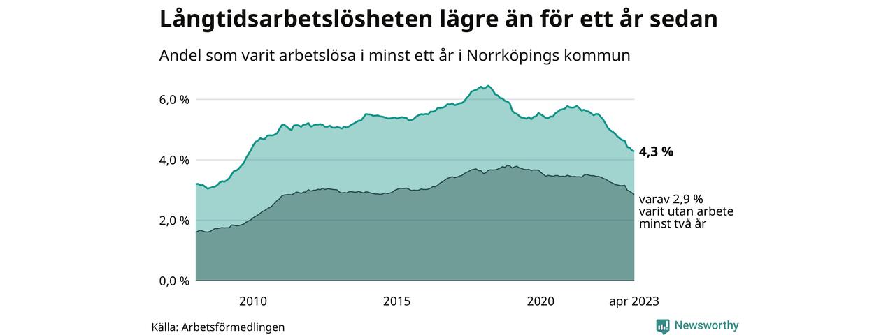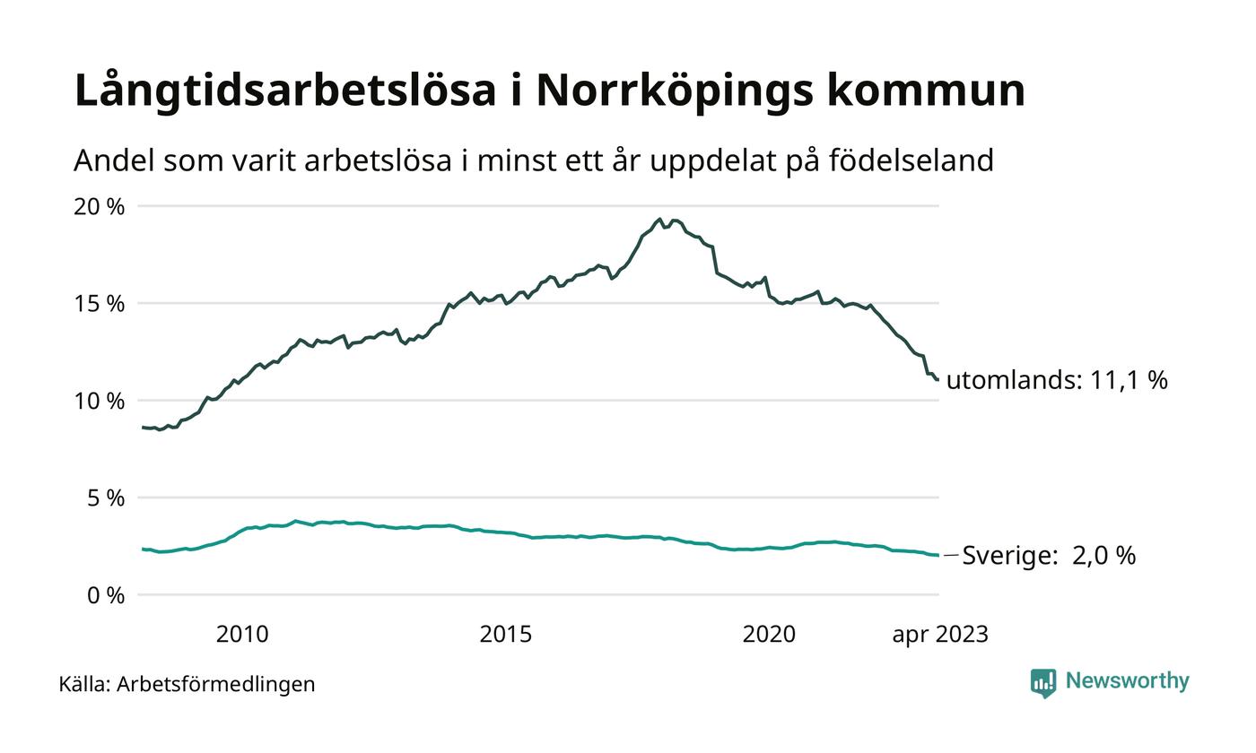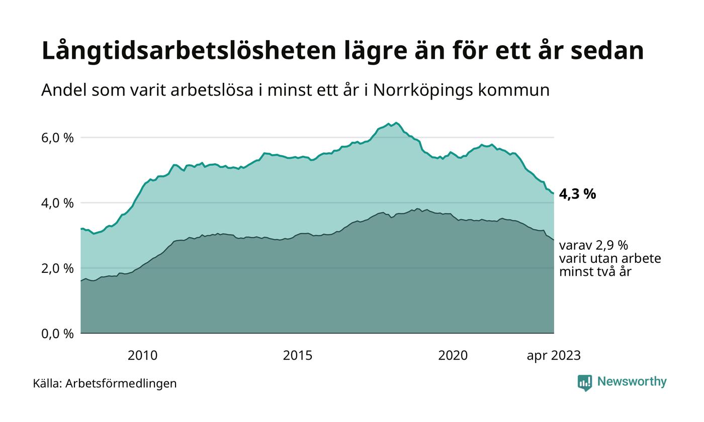 I april hade 3 139 Norrköpingsbor varit arbetslösa i minst ett år, vilket är 35 färre än månaden innan. Det är den sextonde månaden i rad med minskande antal långtidsarbetslösa. 3 139 personer motsvarar 4,3 procent av arbetskraften i kommunen – andelen långtidsarbetslösa är 0,9 procentenheter lägre än samma månad för ett år sedan. Norrköping tillhör de kommuner med högst andel långtidsarbetslösa i hela landet just nu.