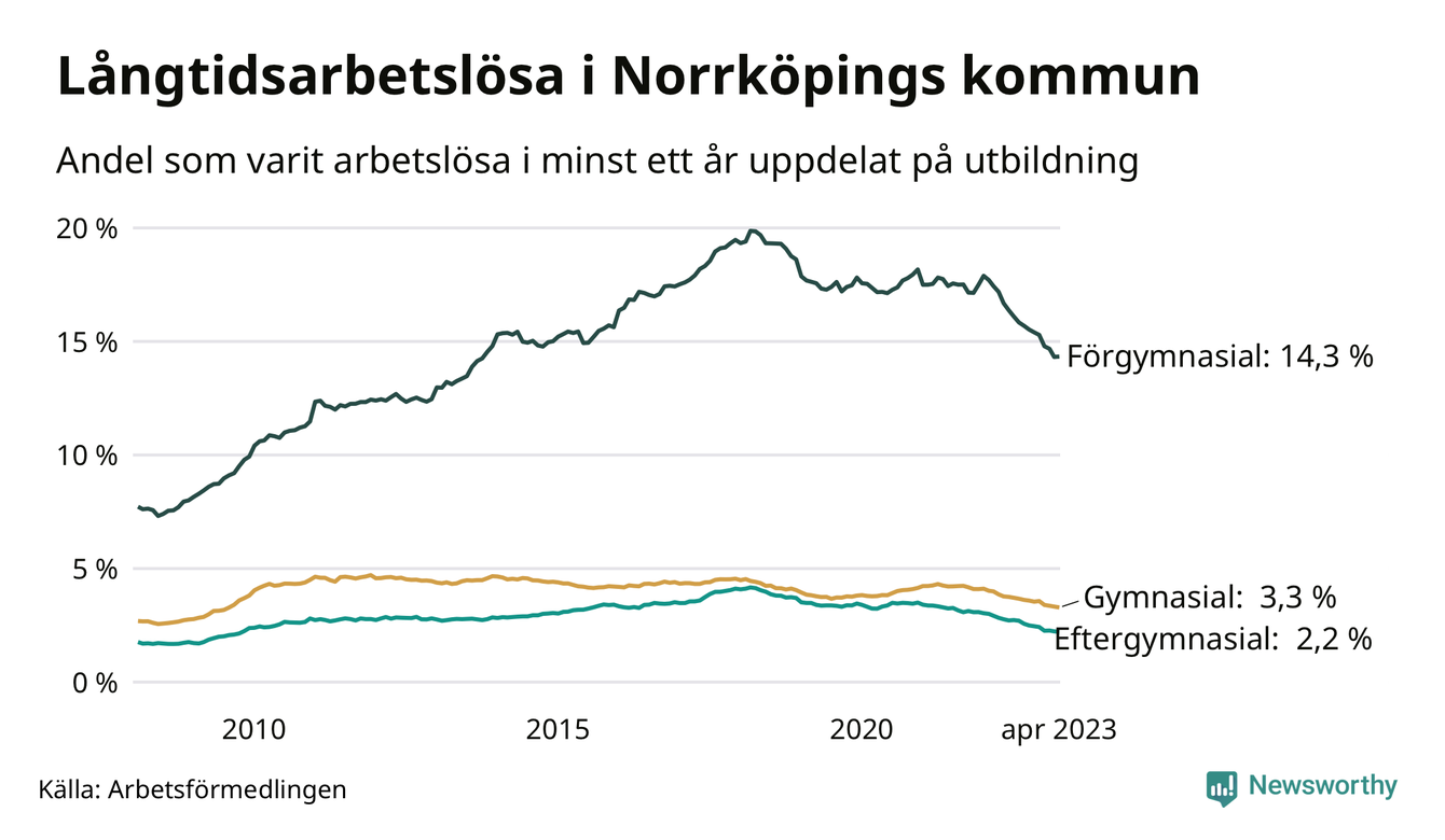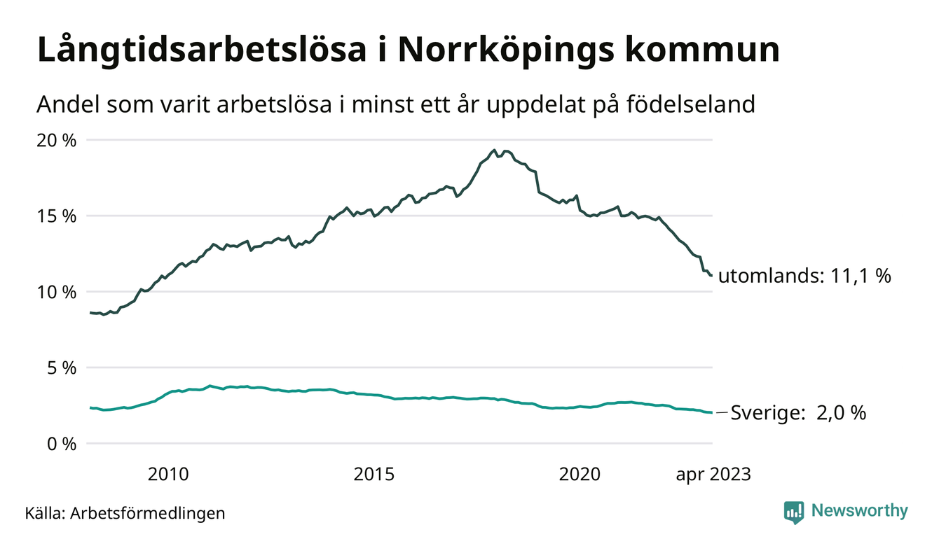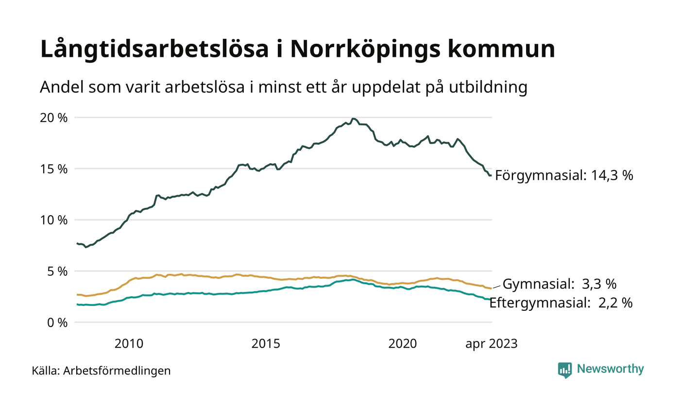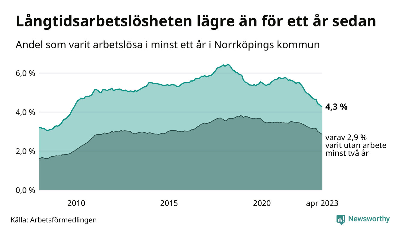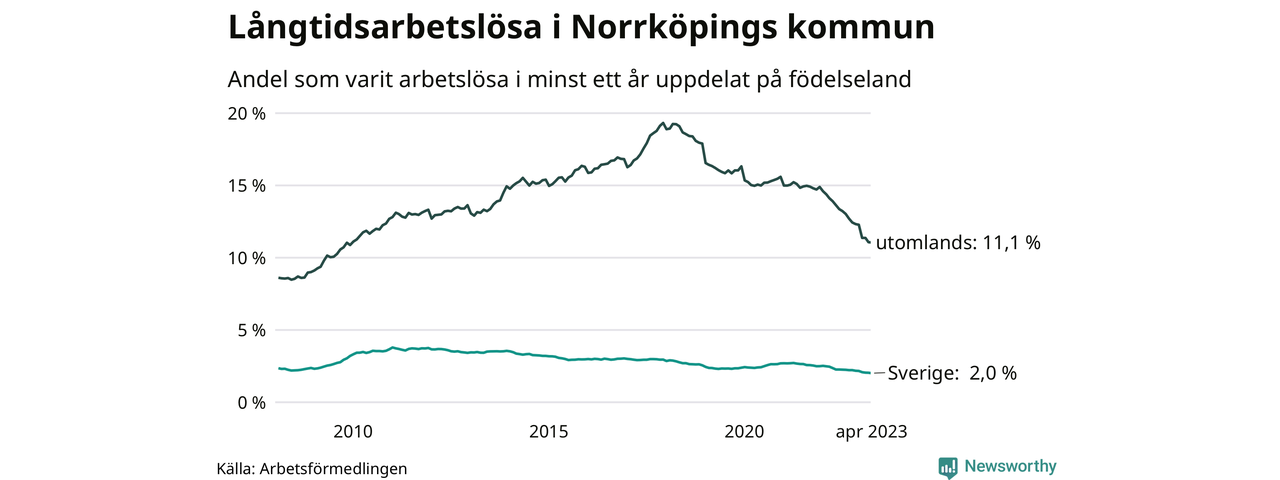 I april hade 3 139 Norrköpingsbor varit arbetslösa i minst ett år, vilket är 35 färre än månaden innan. Det är den sextonde månaden i rad med minskande antal långtidsarbetslösa. 3 139 personer motsvarar 4,3 procent av arbetskraften i kommunen – andelen långtidsarbetslösa är 0,9 procentenheter lägre än samma månad för ett år sedan. Norrköping tillhör de kommuner med högst andel långtidsarbetslösa i hela landet just nu.