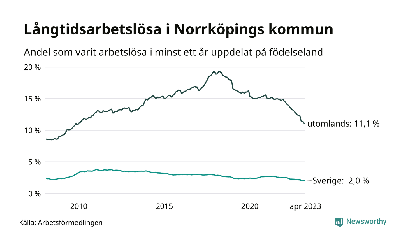 1 103 av de långtidsarbetslösa i Norrköping är födda i Sverige, medan 2 036 är födda utomlands. Det innebär att långtidsarbetslösheten bland Sverigefödda är 2,0 procent, medan den är sex gånger så hög – 11,1 procent – bland födda utomlands. Även i riket som helhet är arbetslösheten högre bland utrikesfödda.