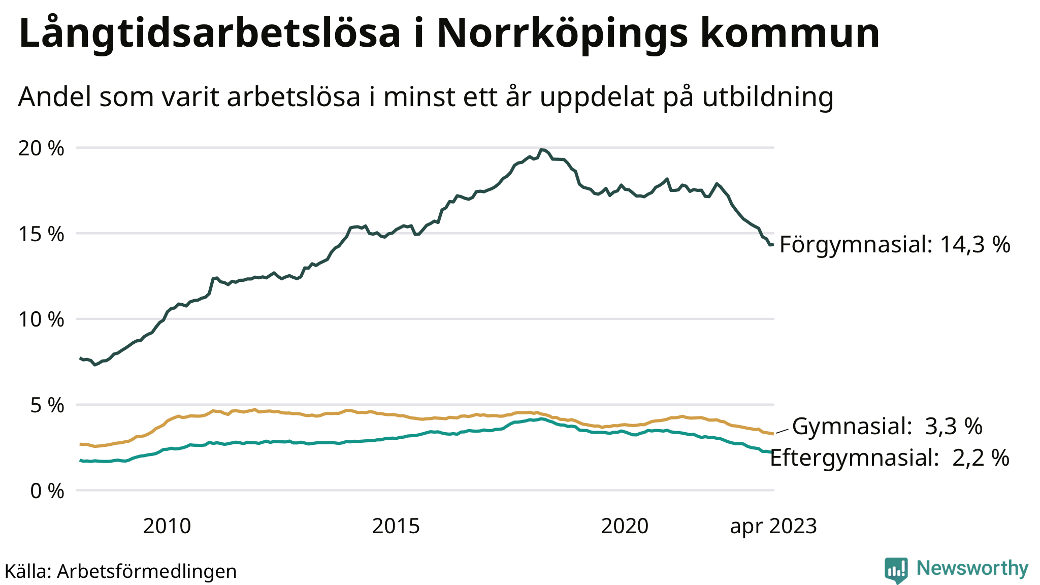 Graf över andel långtidsarbetslösa i Norrköping uppdelat på utbildningsnivå