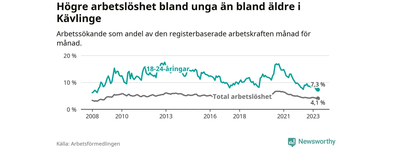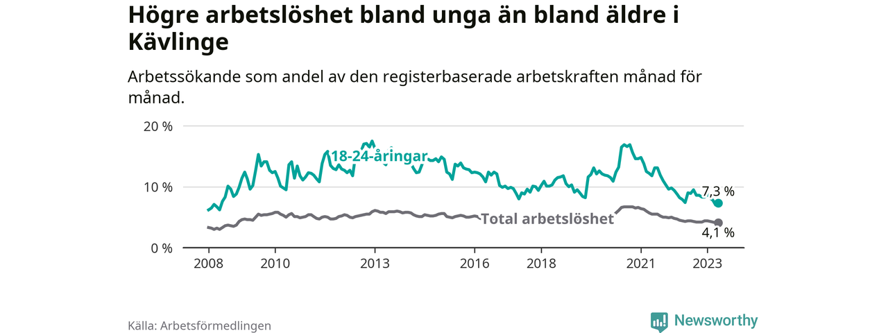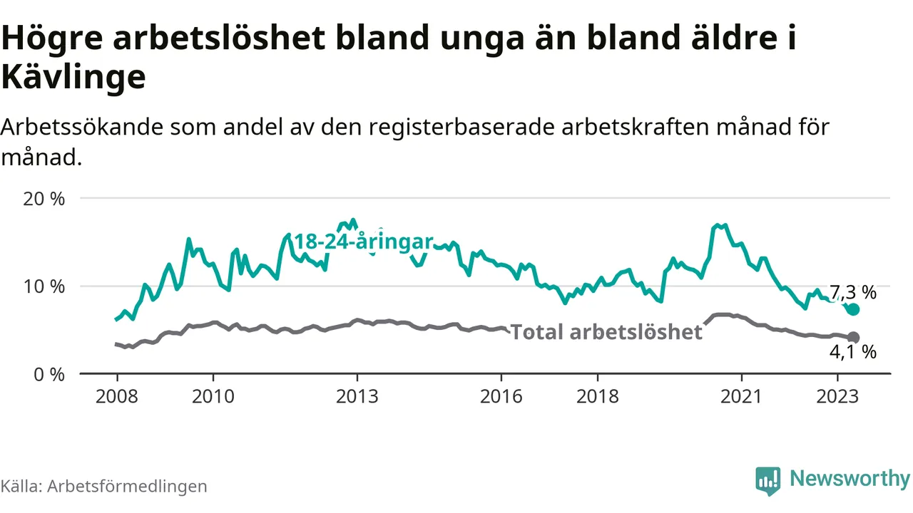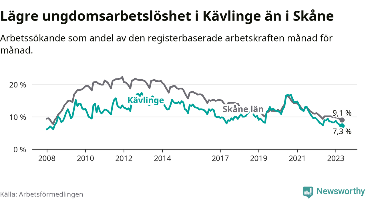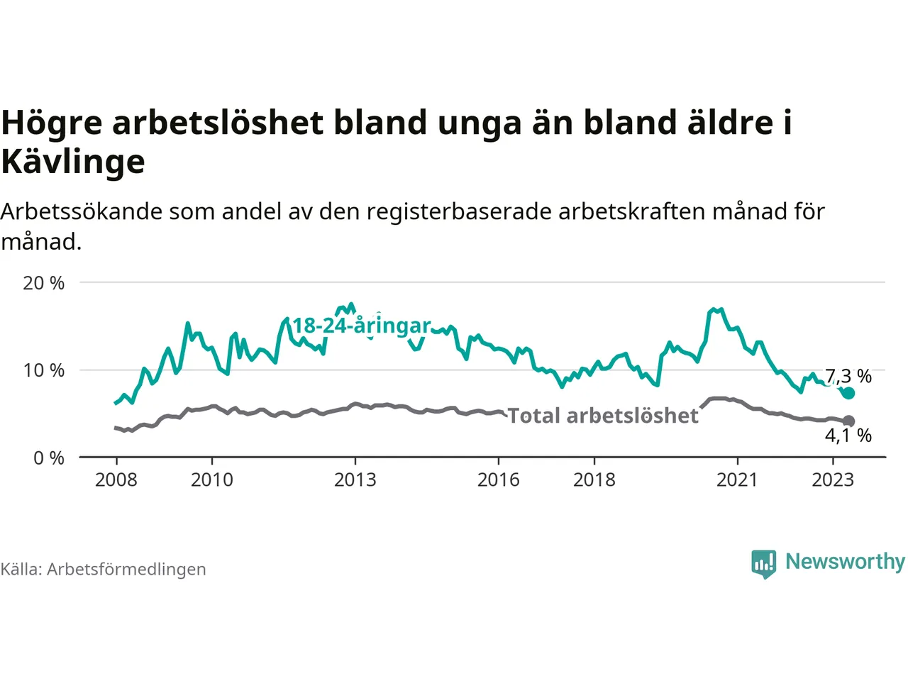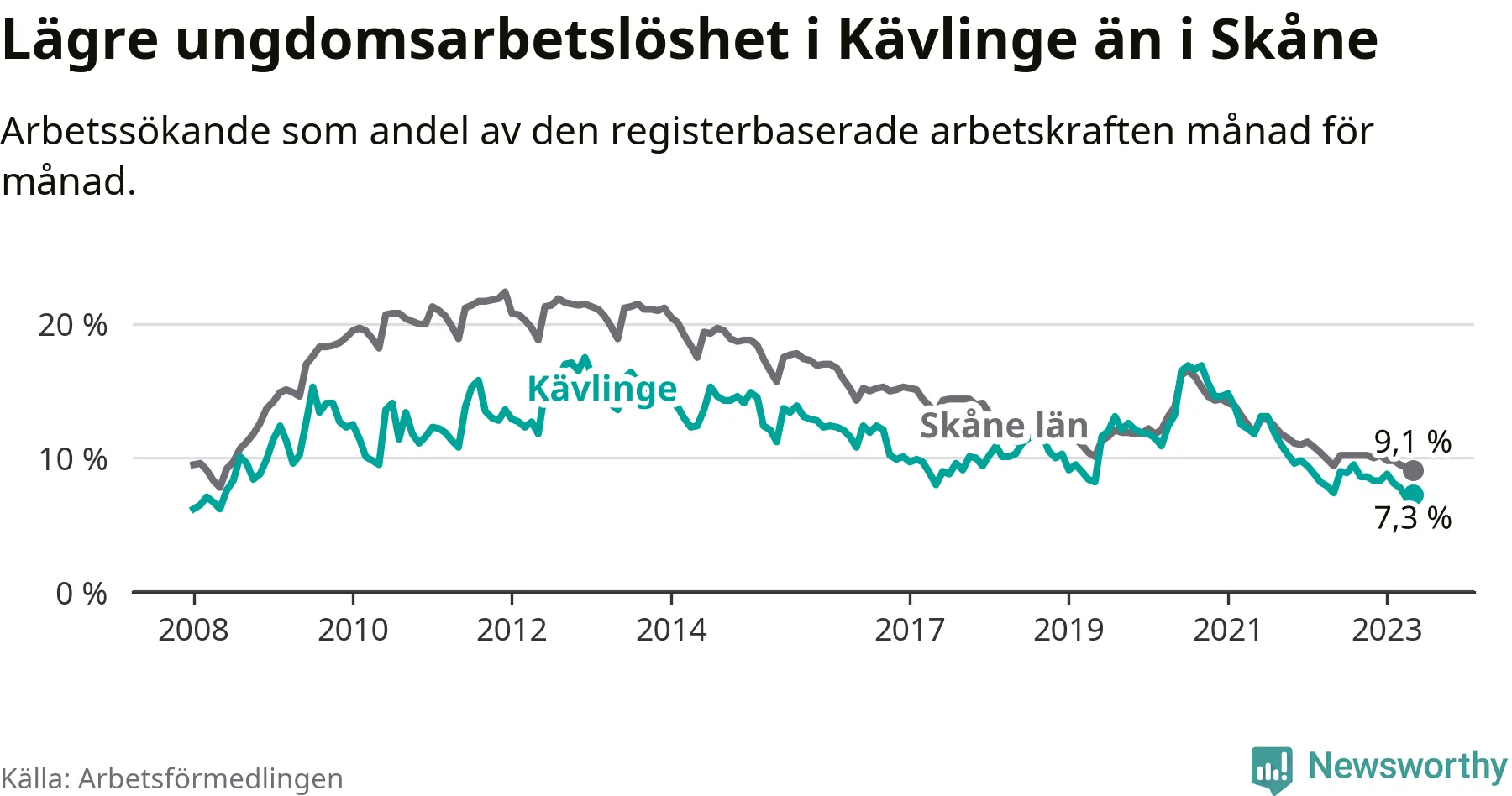 I och med den senaste månadens nedgång har de ungas arbetslöshet i Kävlinge sjunkit över två år i sträck (ner från 12,5 procent i mars 2021 till 7,3 procent nu).