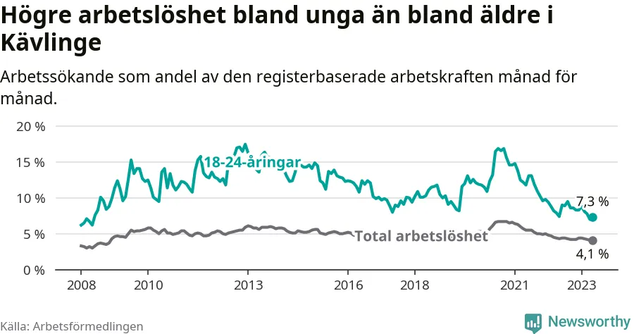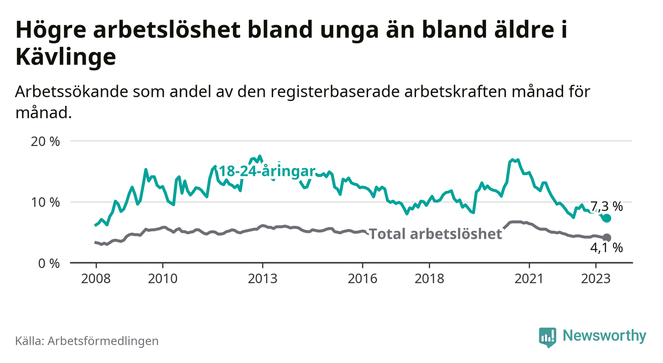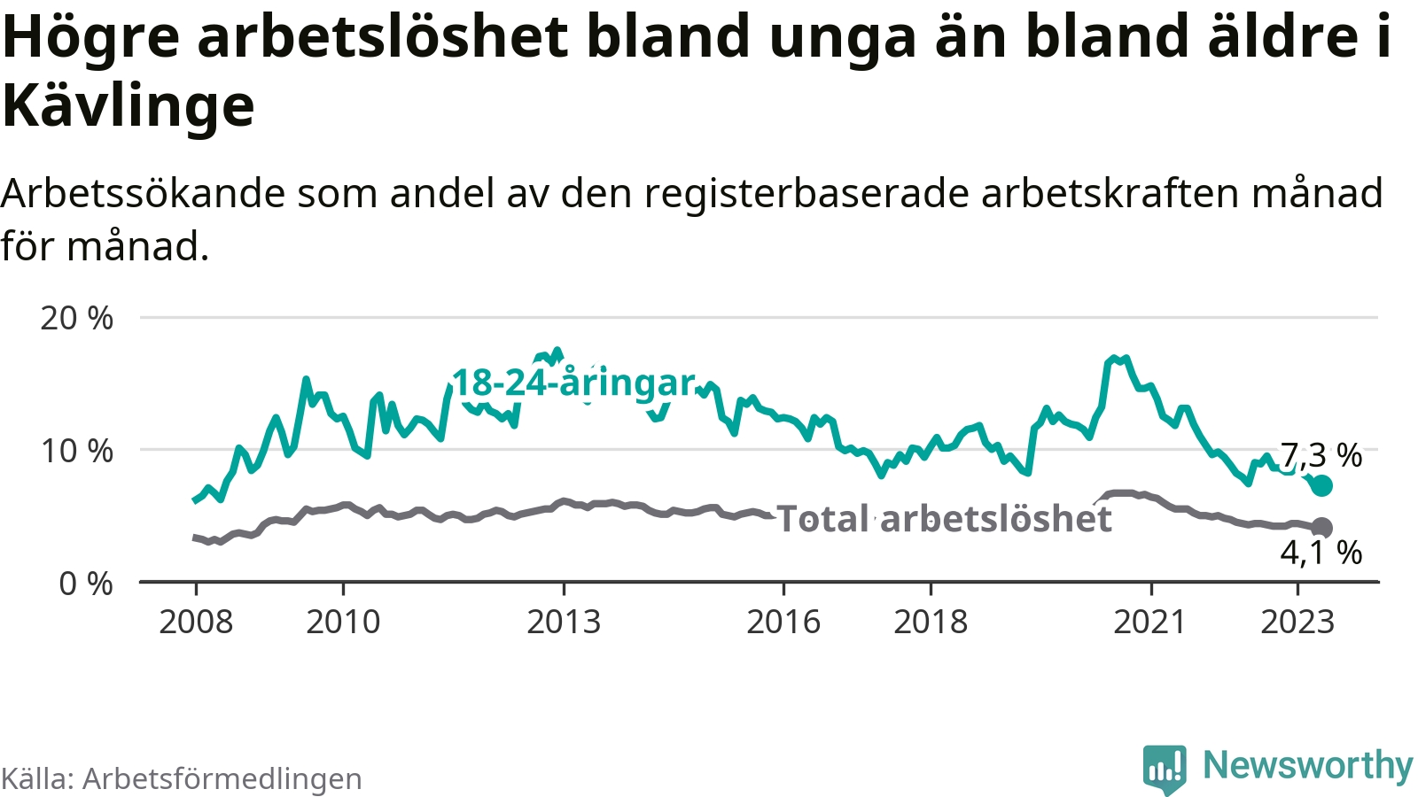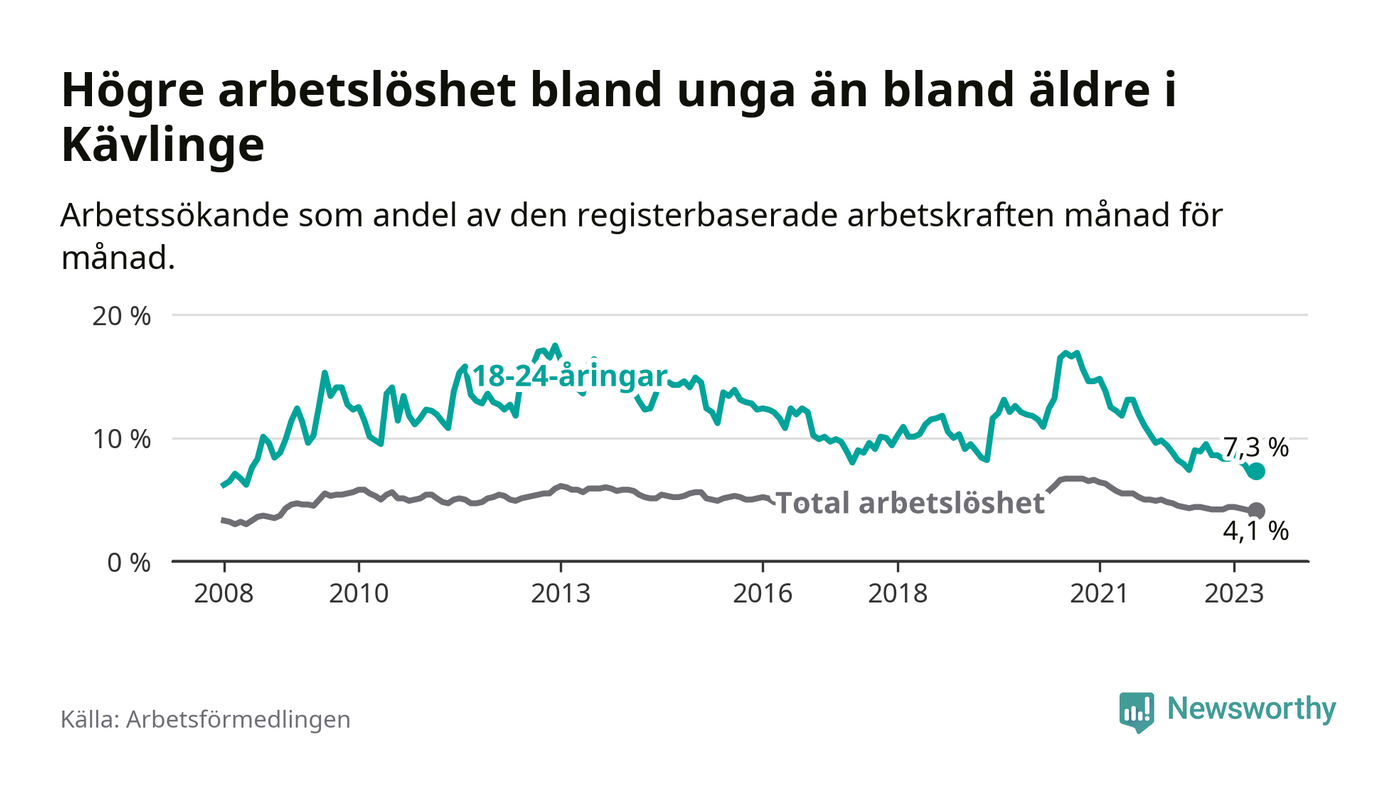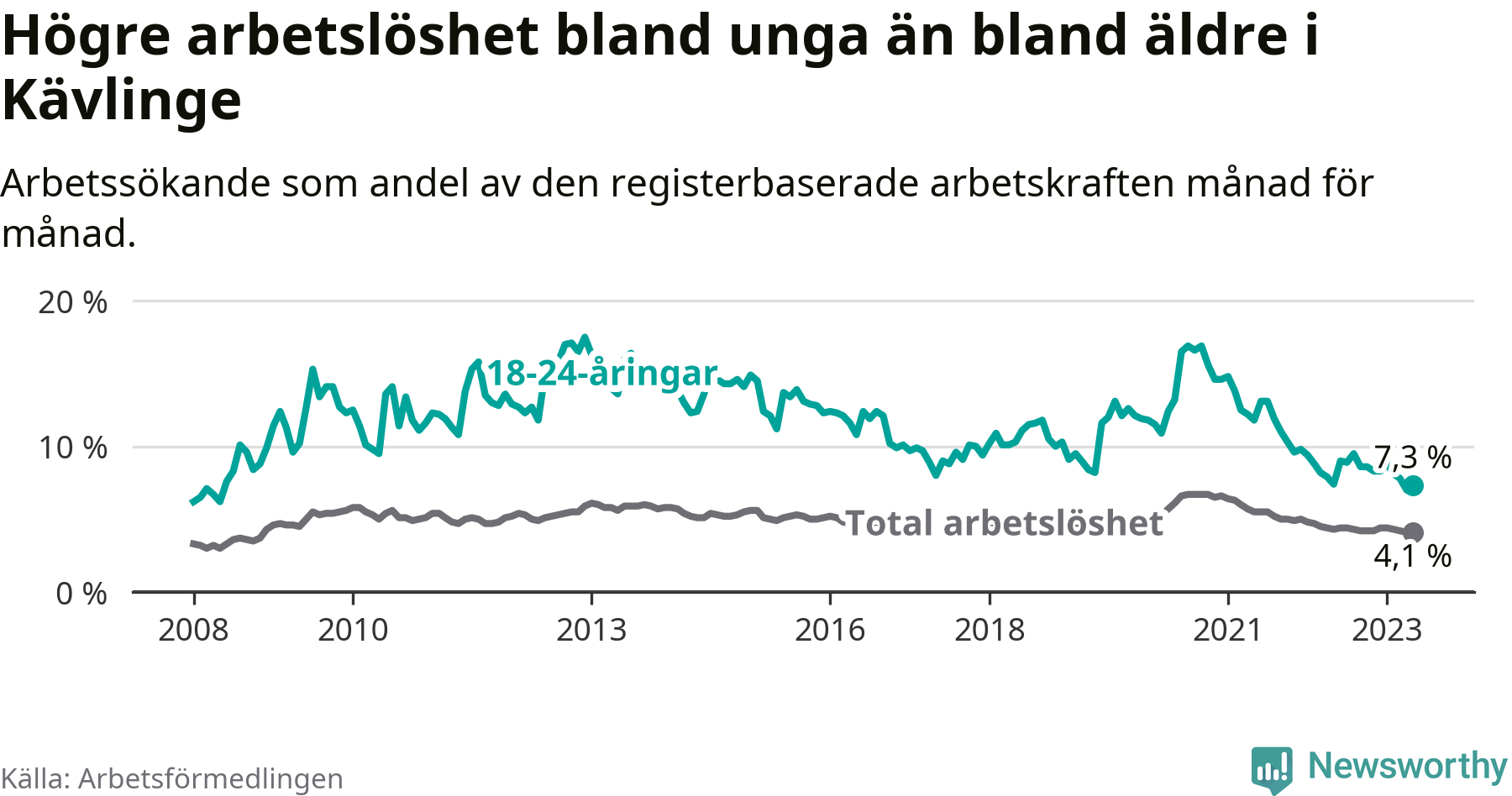 I och med den senaste månadens nedgång har de ungas arbetslöshet i Kävlinge sjunkit över två år i sträck (ner från 12,5 procent i mars 2021 till 7,3 procent nu).