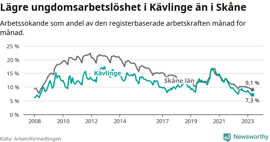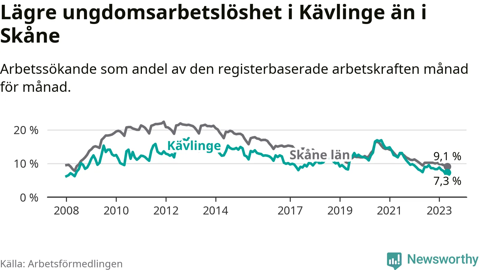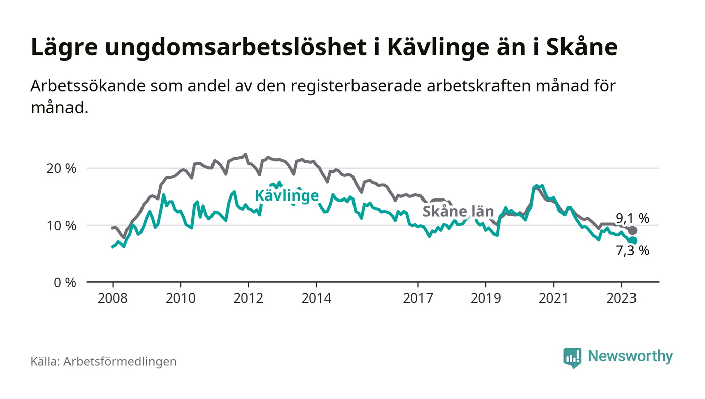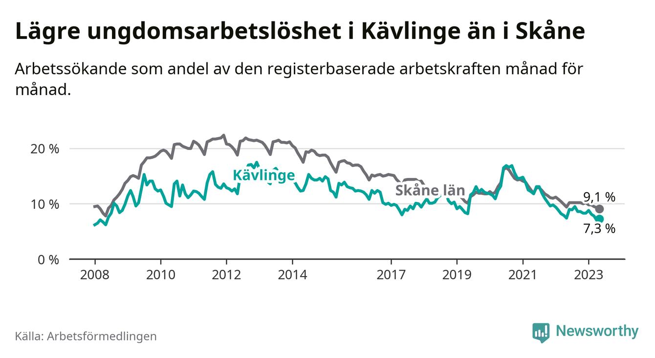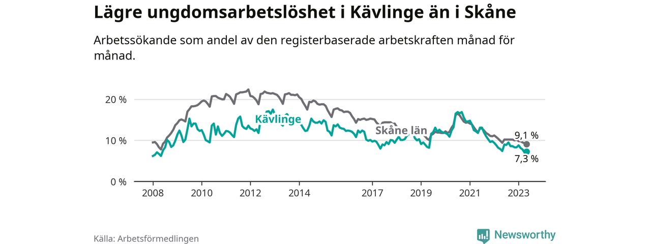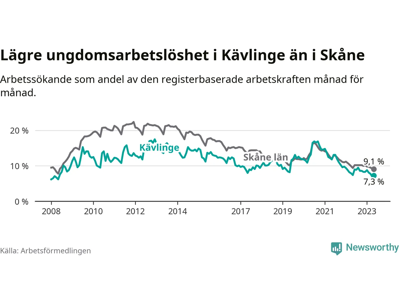 Precis som den totala arbetslösheten ligger ungdomsarbetslösheten i Kävlinge lägre än i Skåne som helhet. Skillnaden mellan kommunen och länet är 1,8 procentenheter.