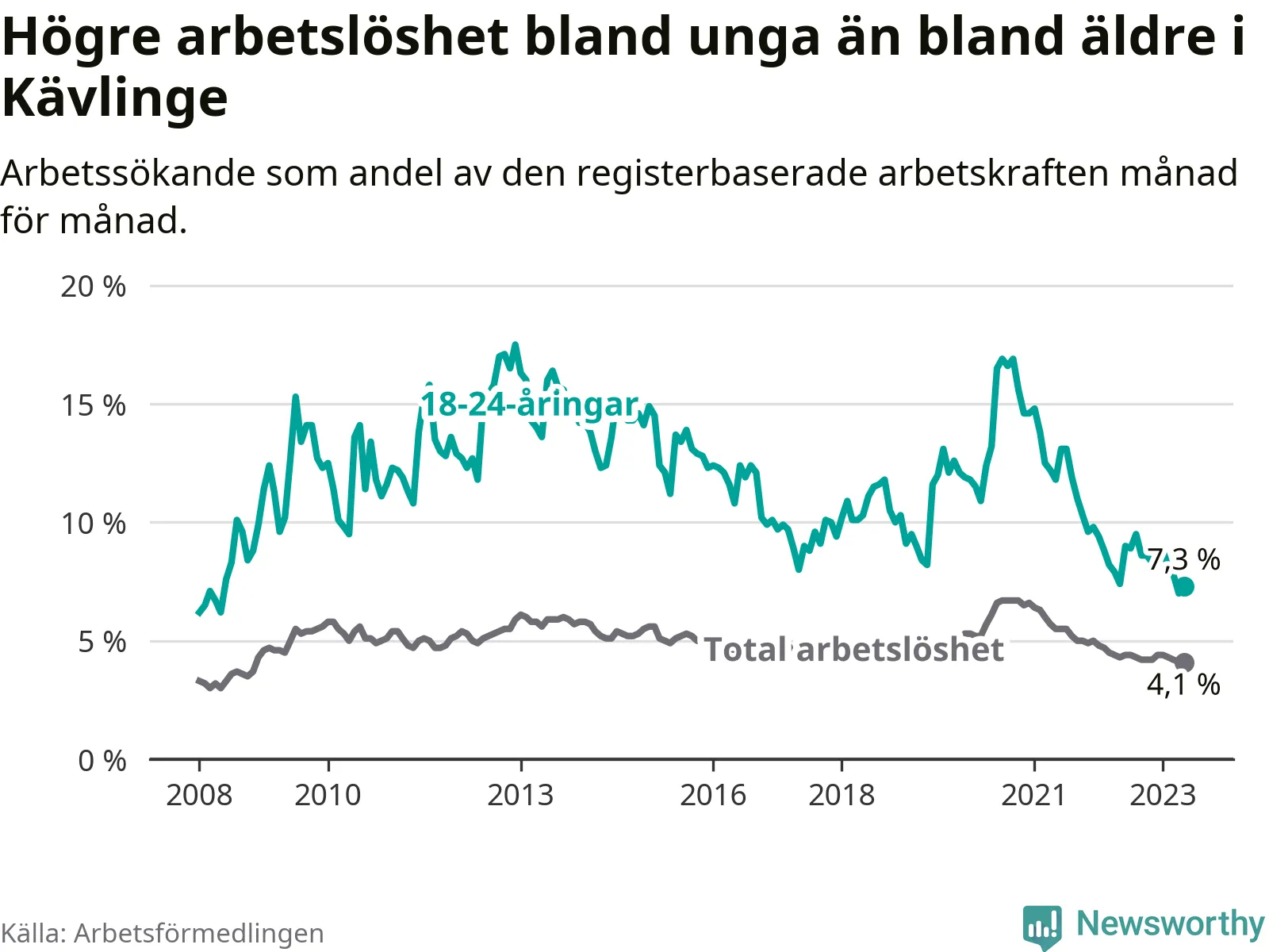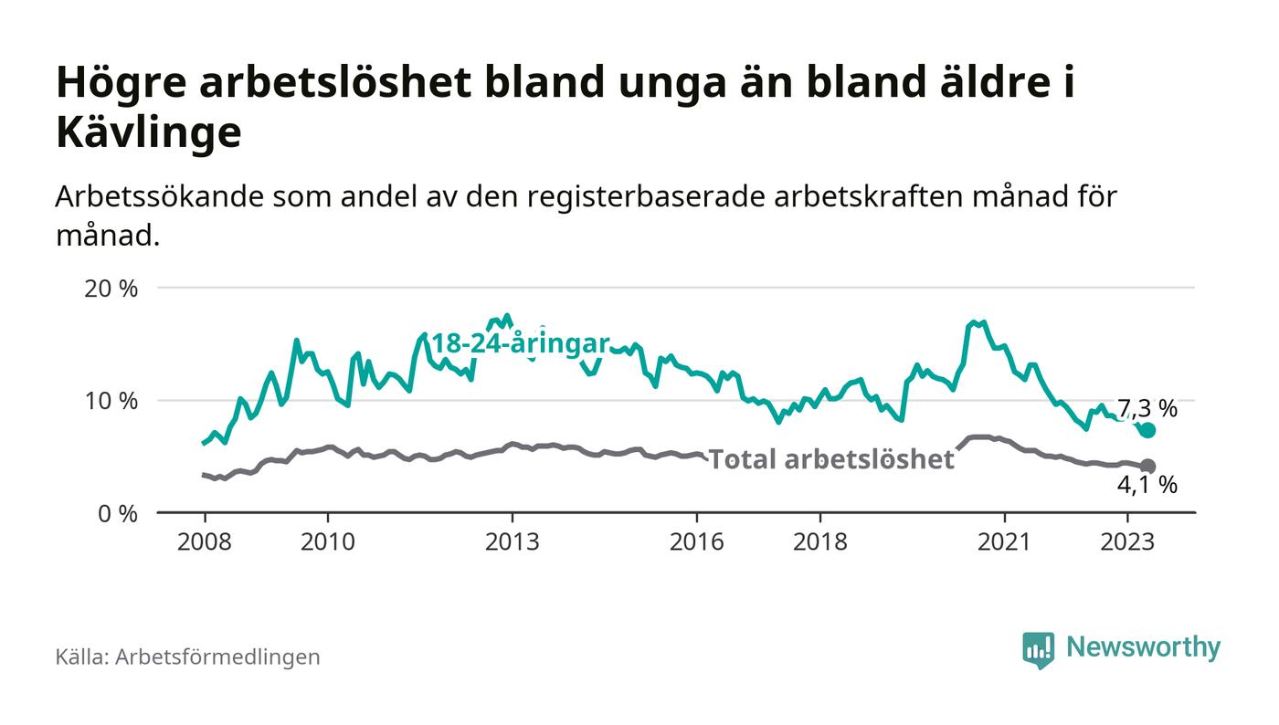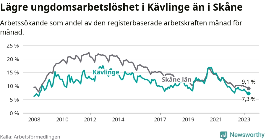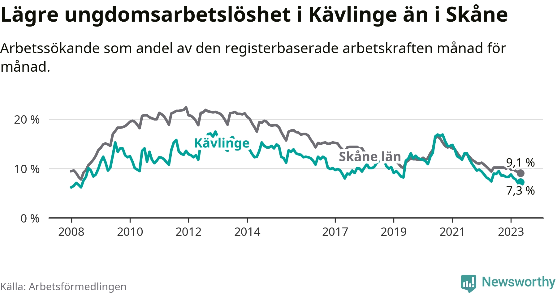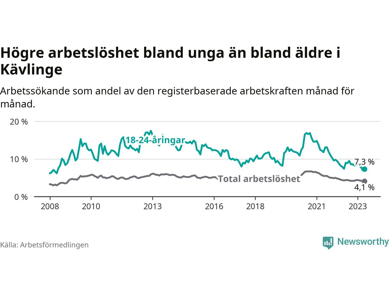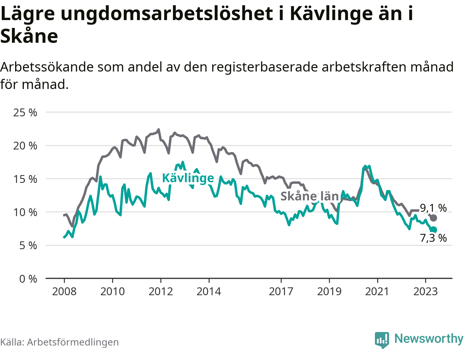 Precis som den totala arbetslösheten ligger ungdomsarbetslösheten i Kävlinge lägre än i Skåne som helhet. Skillnaden mellan kommunen och länet är 1,8 procentenheter.