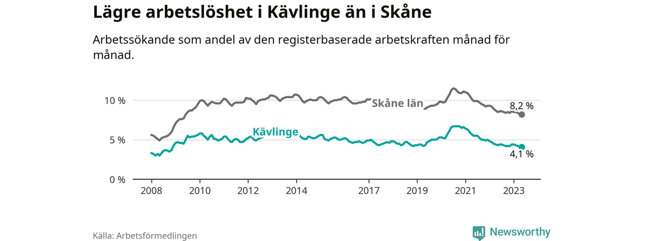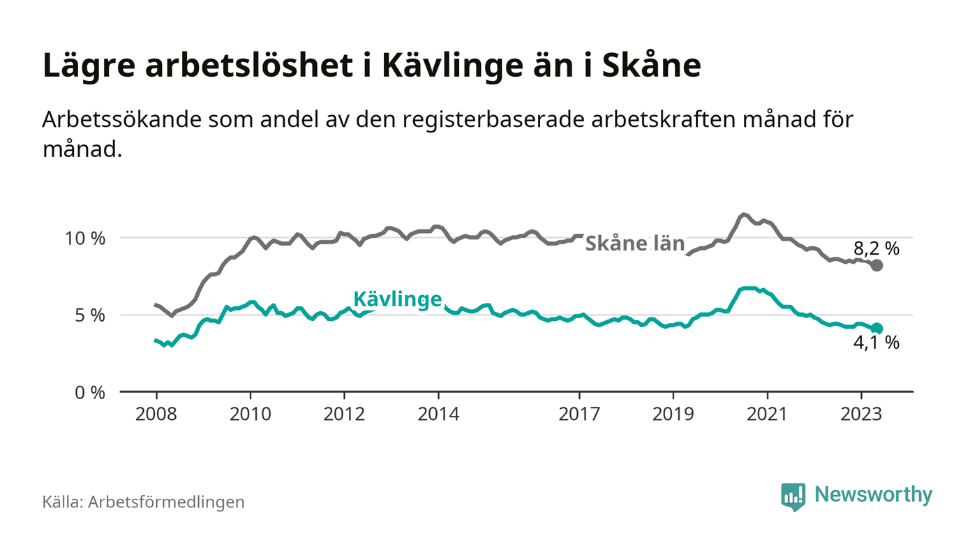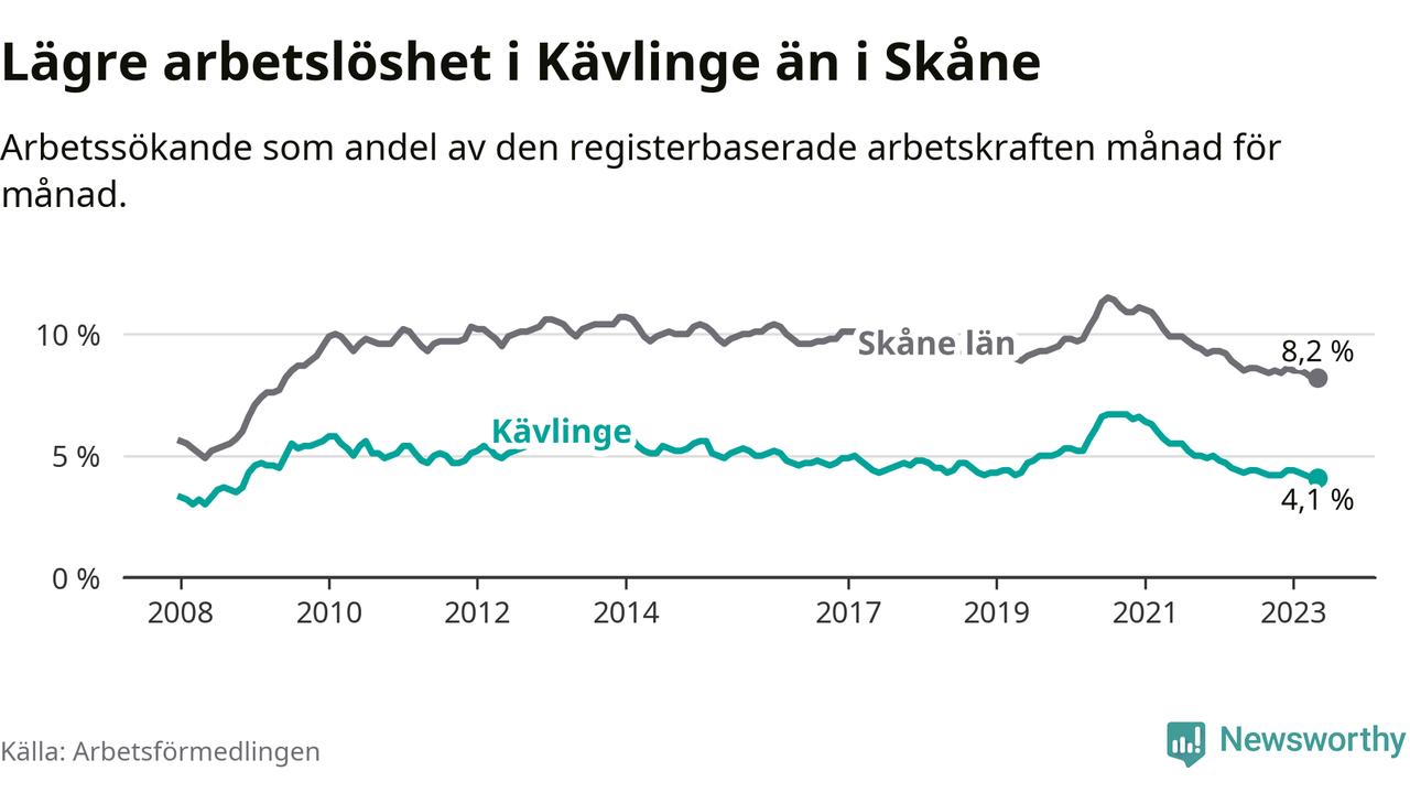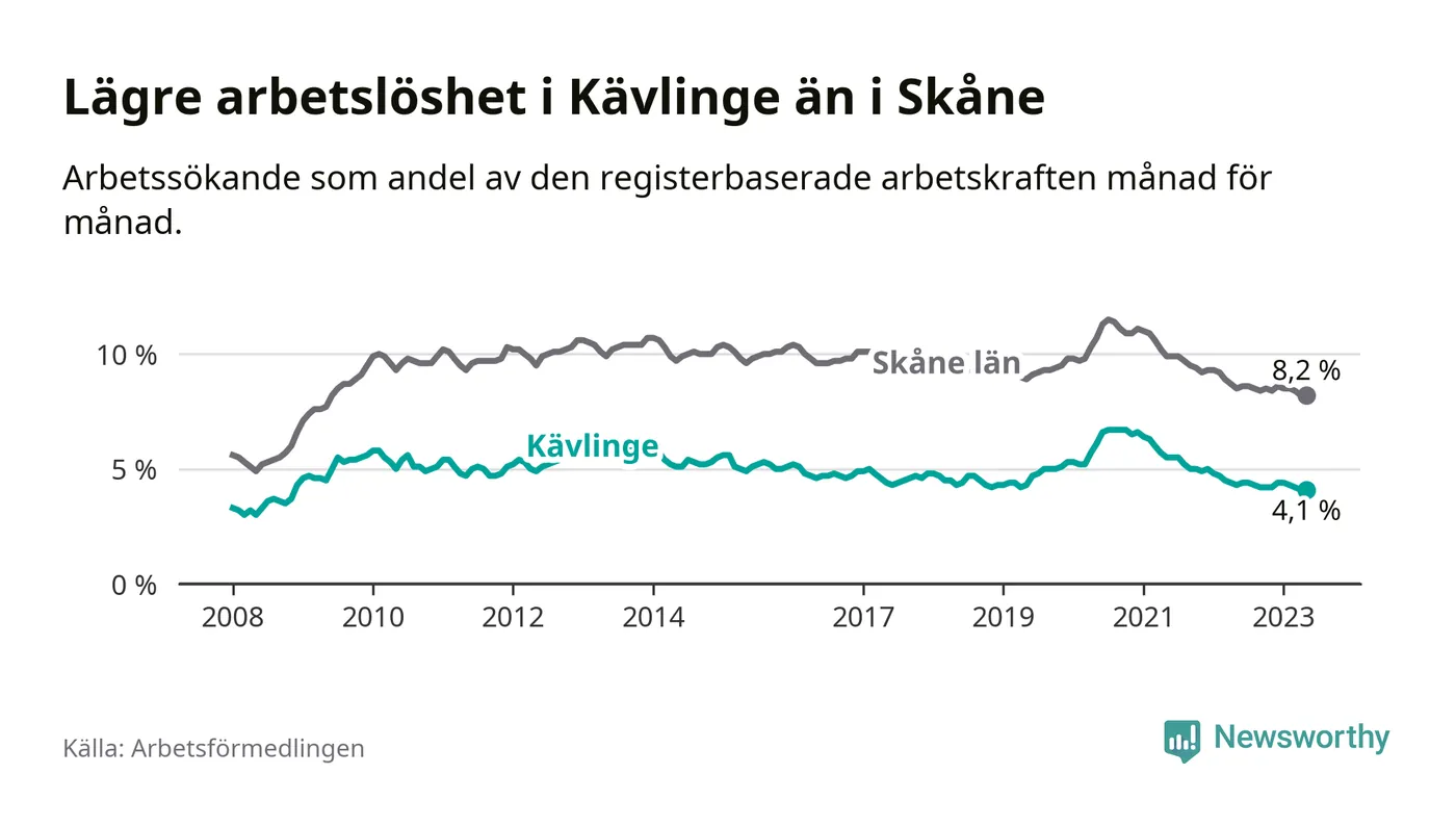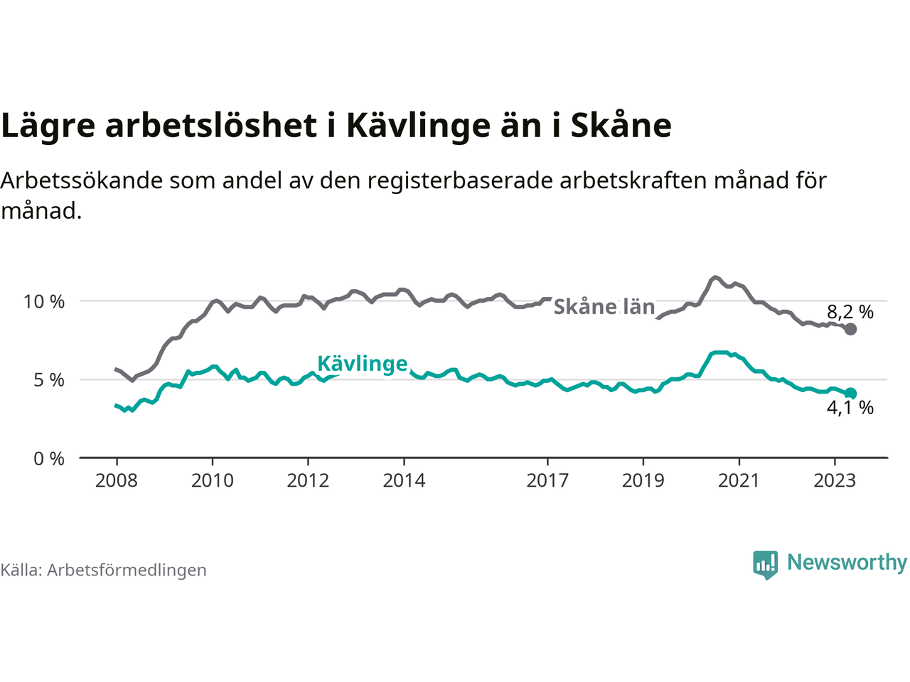 Det är 25:e månaden i följd som arbetslösheten i Kävlinge är lägre än den var under samma tidpunkt året innan. Sedan april 2021 har arbetslösheten gått ner från 5,7 till 4,1 procent.