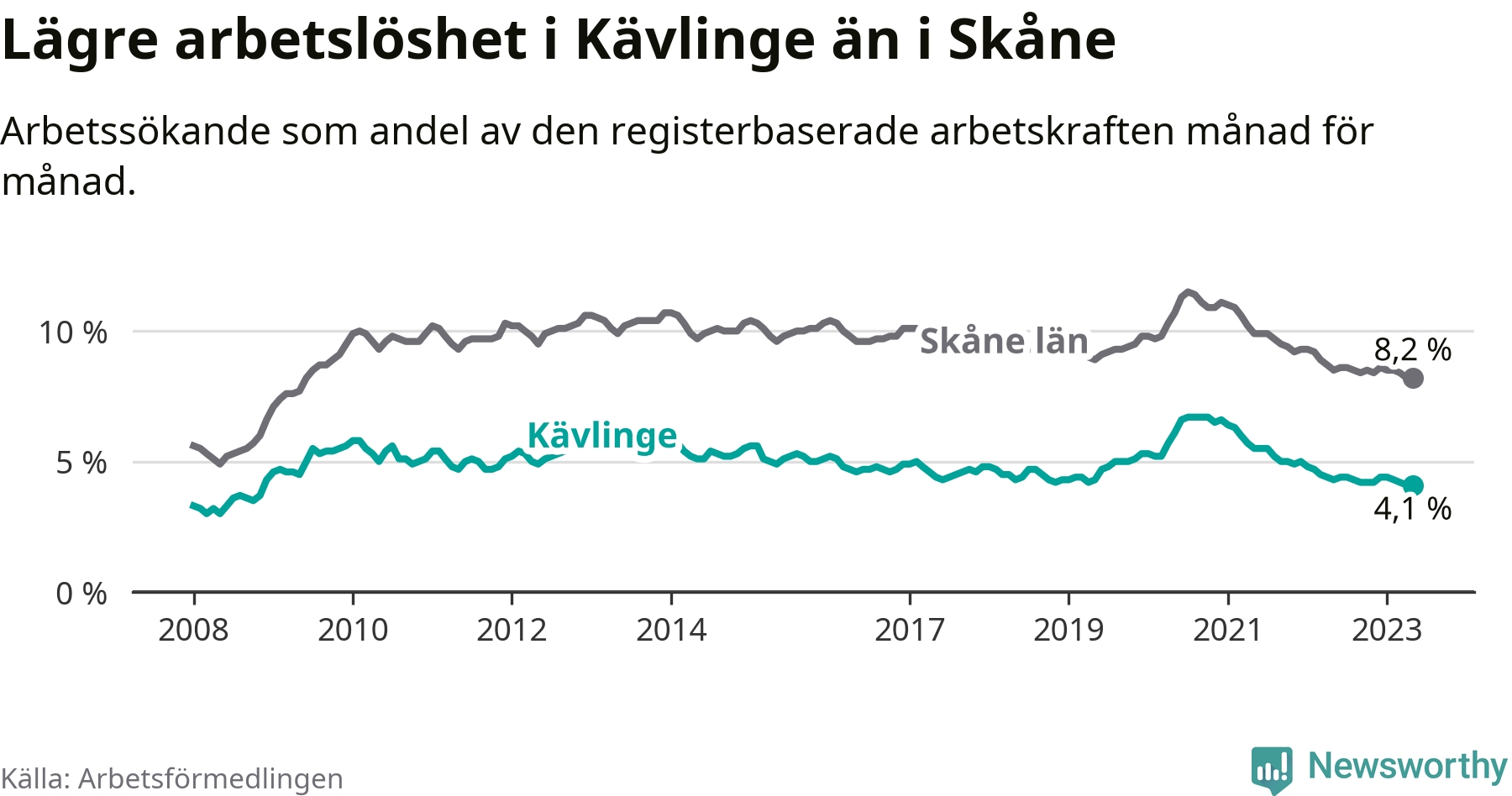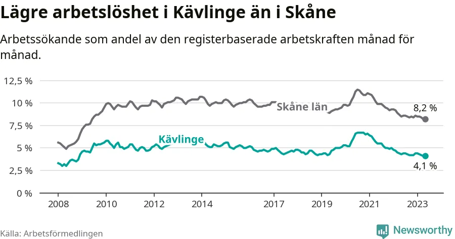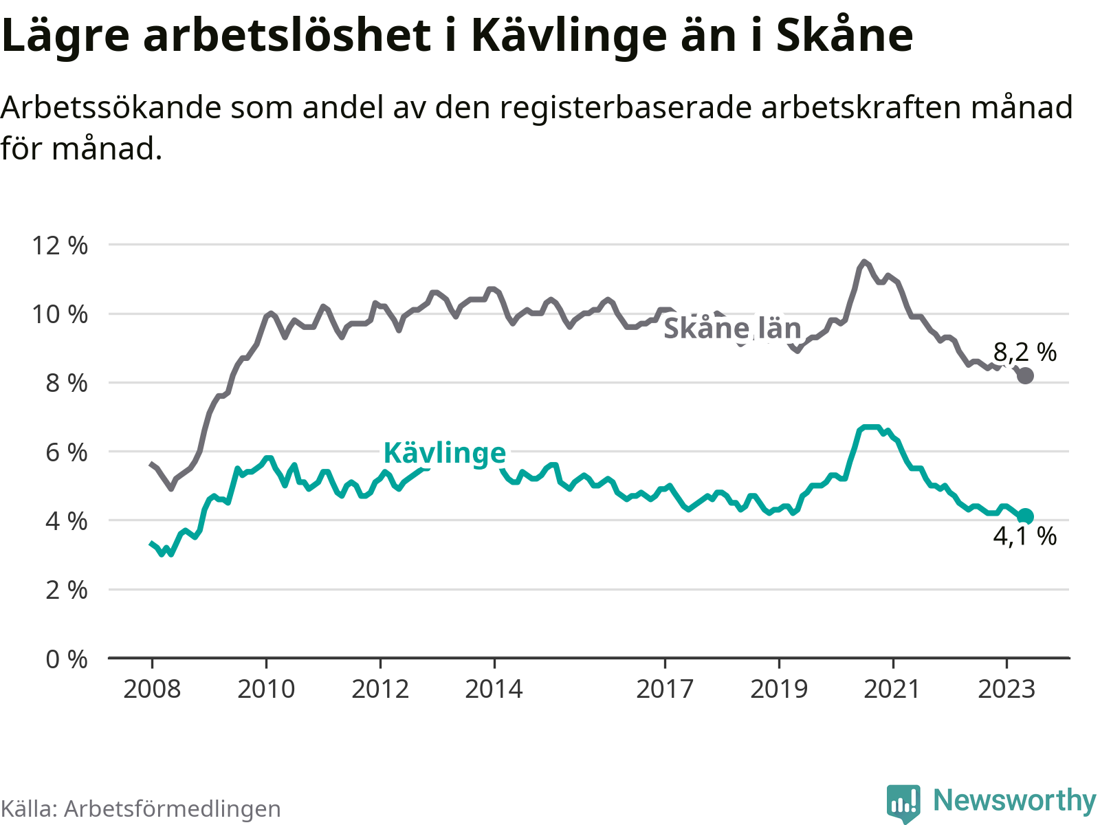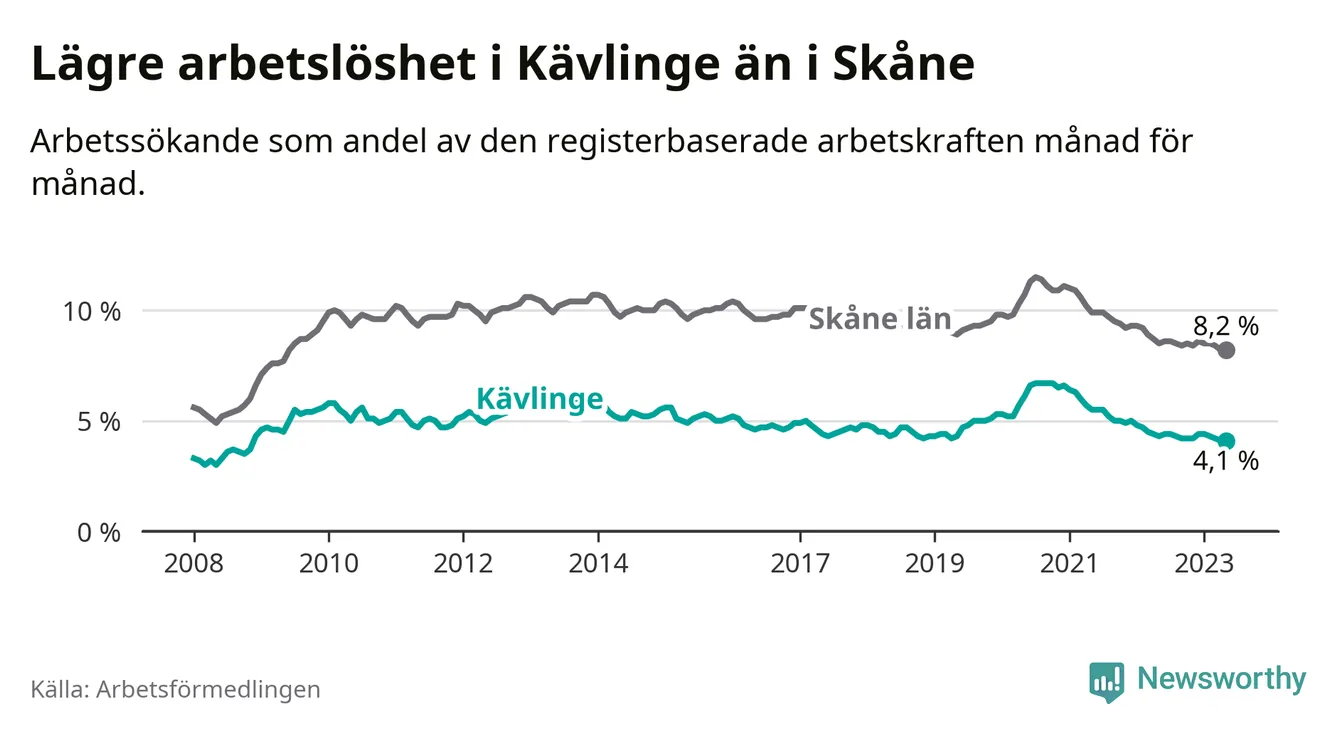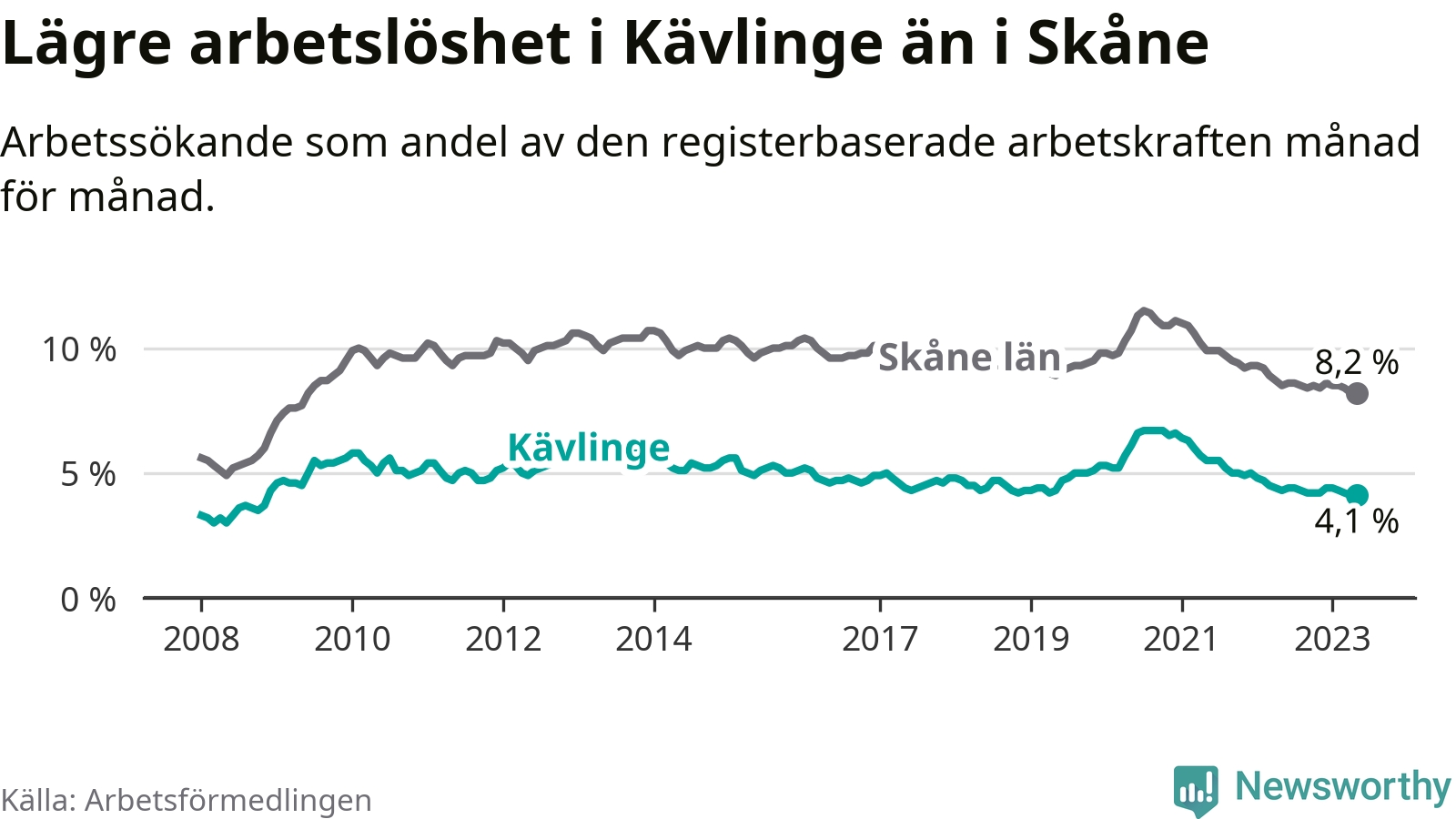 Det är 25:e månaden i följd som arbetslösheten i Kävlinge är lägre än den var under samma tidpunkt året innan. Sedan april 2021 har arbetslösheten gått ner från 5,7 till 4,1 procent.