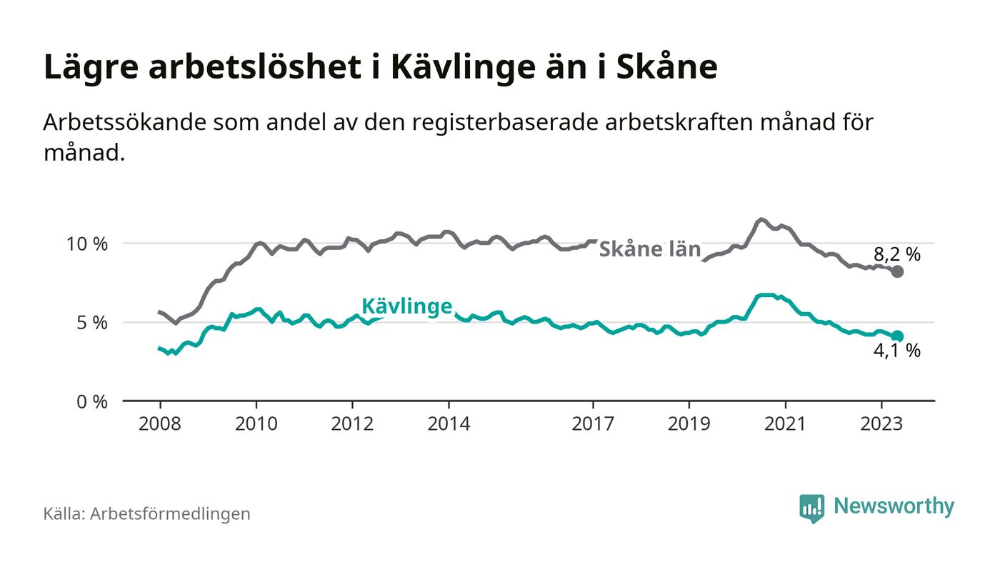 Under maj månad rapporterade Kävlinge kommun en total arbetslöshet på 4,1 procent. Det är en minskning jämfört med samma tidpunkt i fjol (−0,2 procentenheter). Även i Skåne län sjunker arbetslösheten .