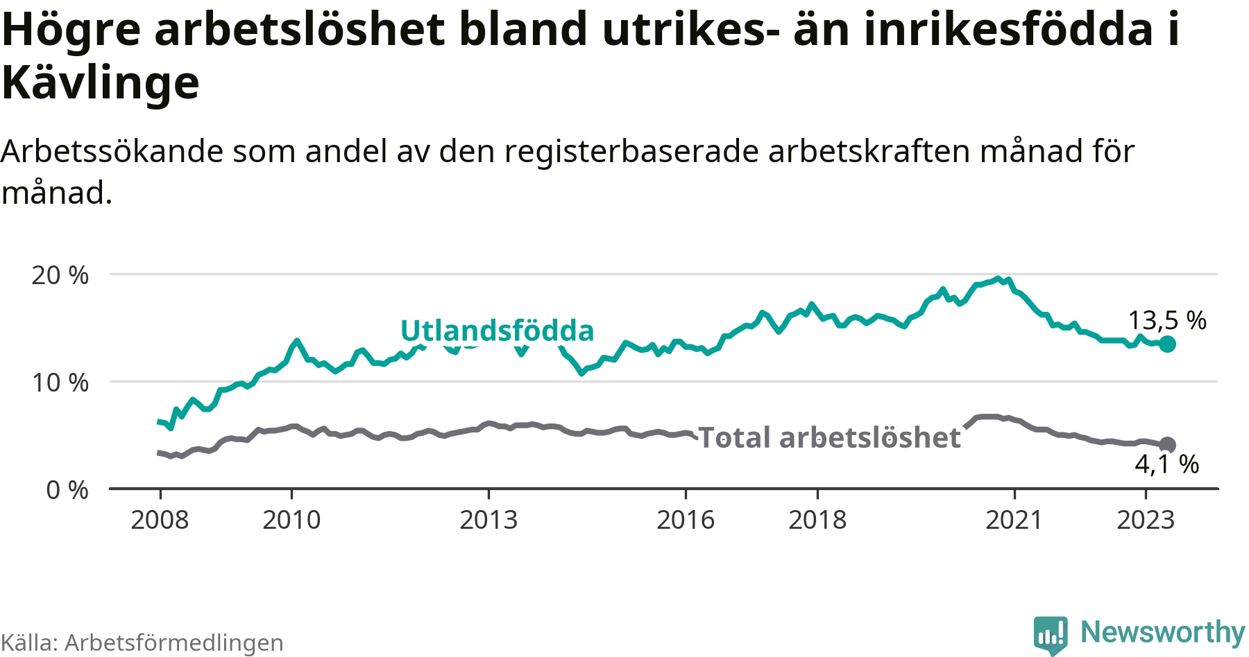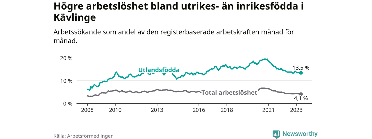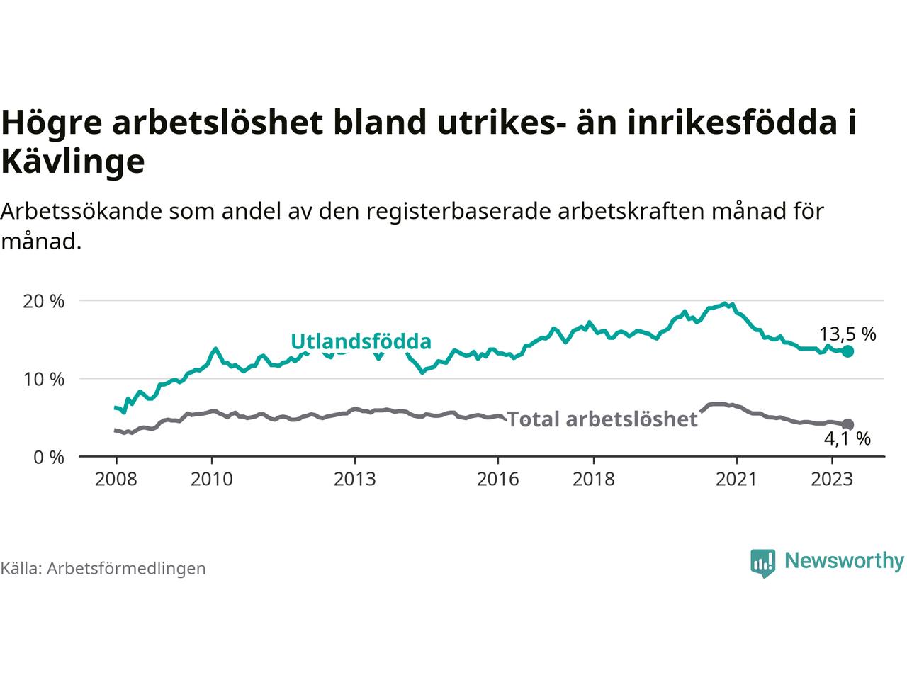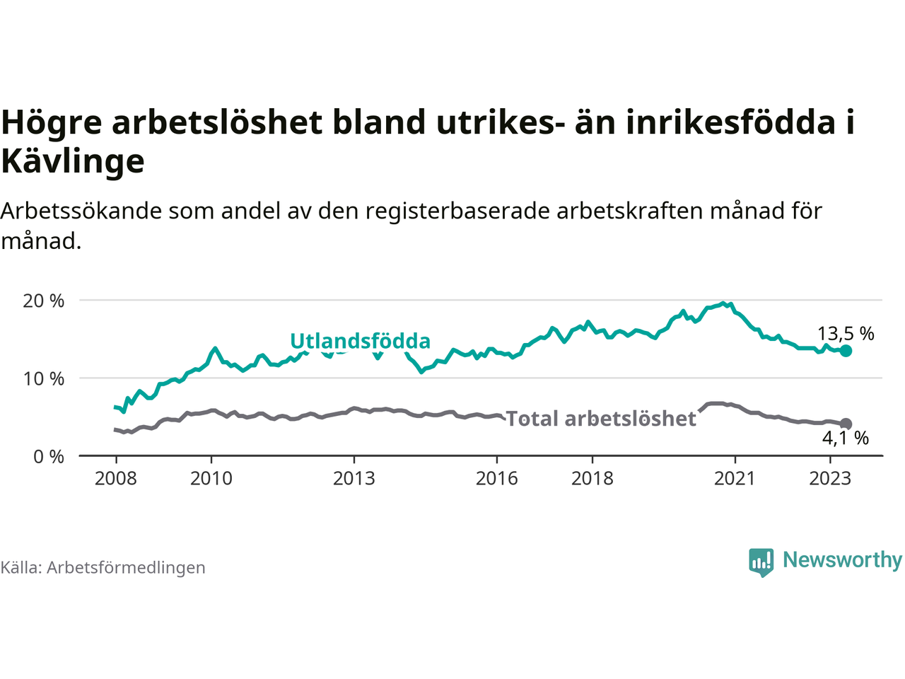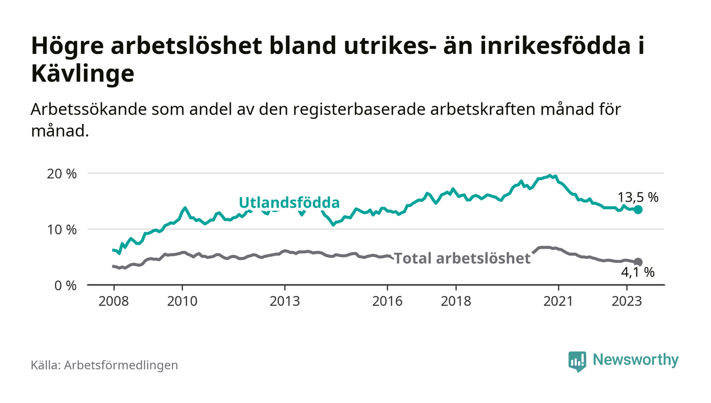 Arbetslösheten bland utlandsfödda var 13,5 procent i Kävlinge under maj månad, motsvarande 279 av 2 067 personer. Det är 0,3 procentenheter färre än vid samma tidpunkt i fjol (+15 om man räknar personer). Därmed har de utlandsföddas arbetslöshet varit lägre än vid samma tidpunkt i fjol i över två år i sträck. Sedan mars 2021 har arbetslösheten bland utlandsfödda minskat från 17,8 till 13,5 procent.