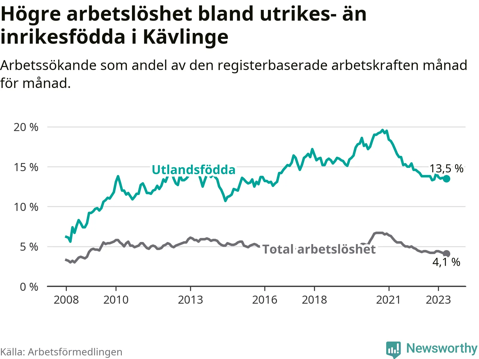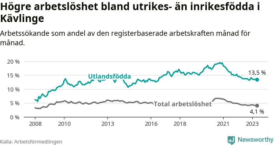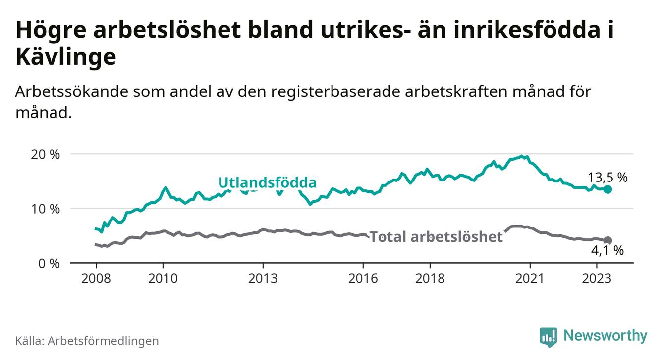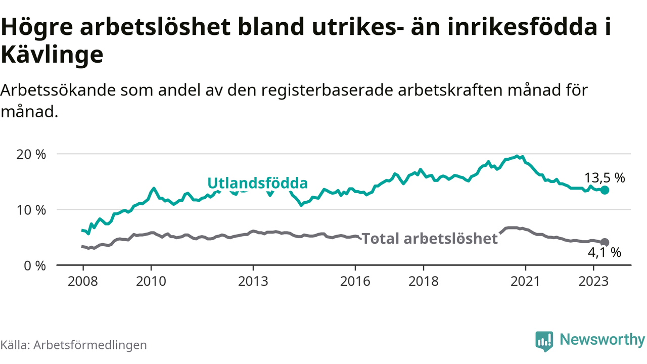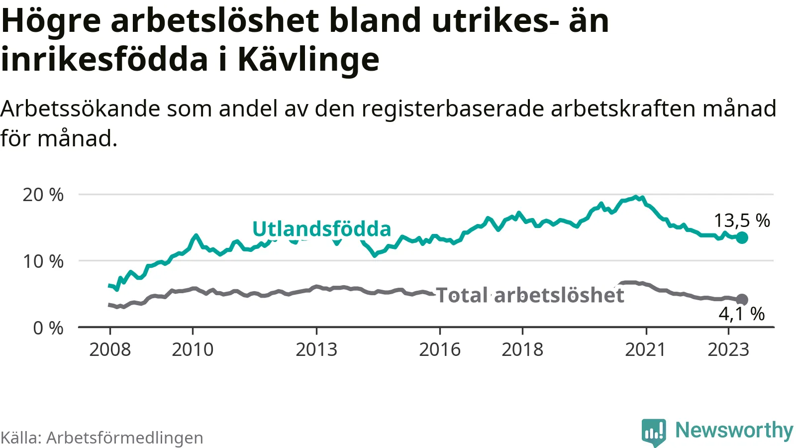 Arbetslösheten bland utlandsfödda var 13,5 procent i Kävlinge under maj månad, motsvarande 279 av 2 067 personer. Det är 0,3 procentenheter färre än vid samma tidpunkt i fjol (+15 om man räknar personer). Därmed har de utlandsföddas arbetslöshet varit lägre än vid samma tidpunkt i fjol i över två år i sträck. Sedan mars 2021 har arbetslösheten bland utlandsfödda minskat från 17,8 till 13,5 procent.