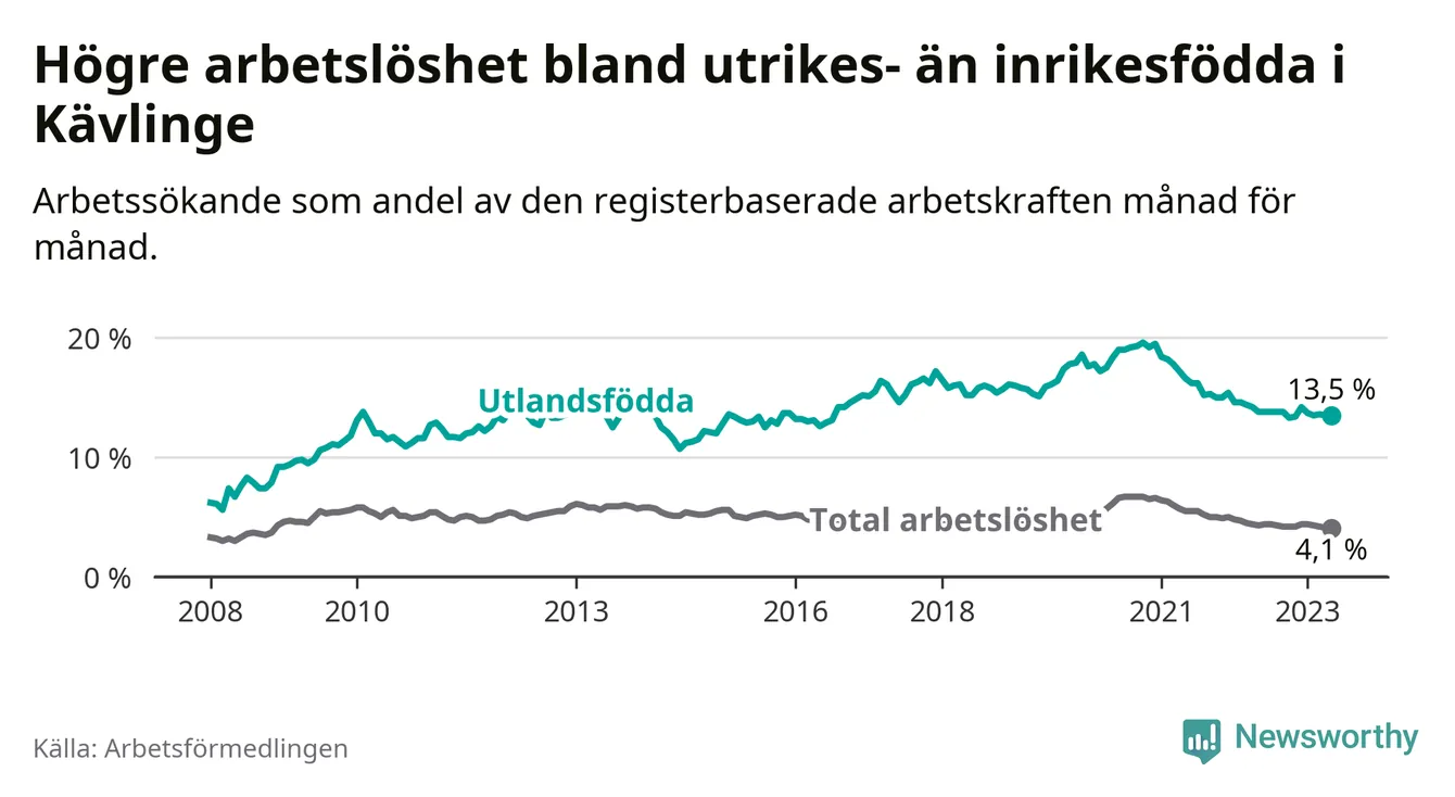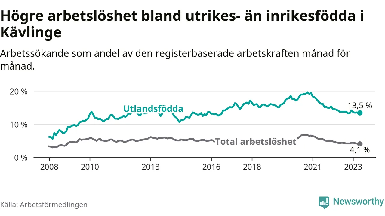 Skillnaden i arbetslöshet mellan utrikesfödda och hela befolkningen är 9,4 procentenheter i Kävlinge.