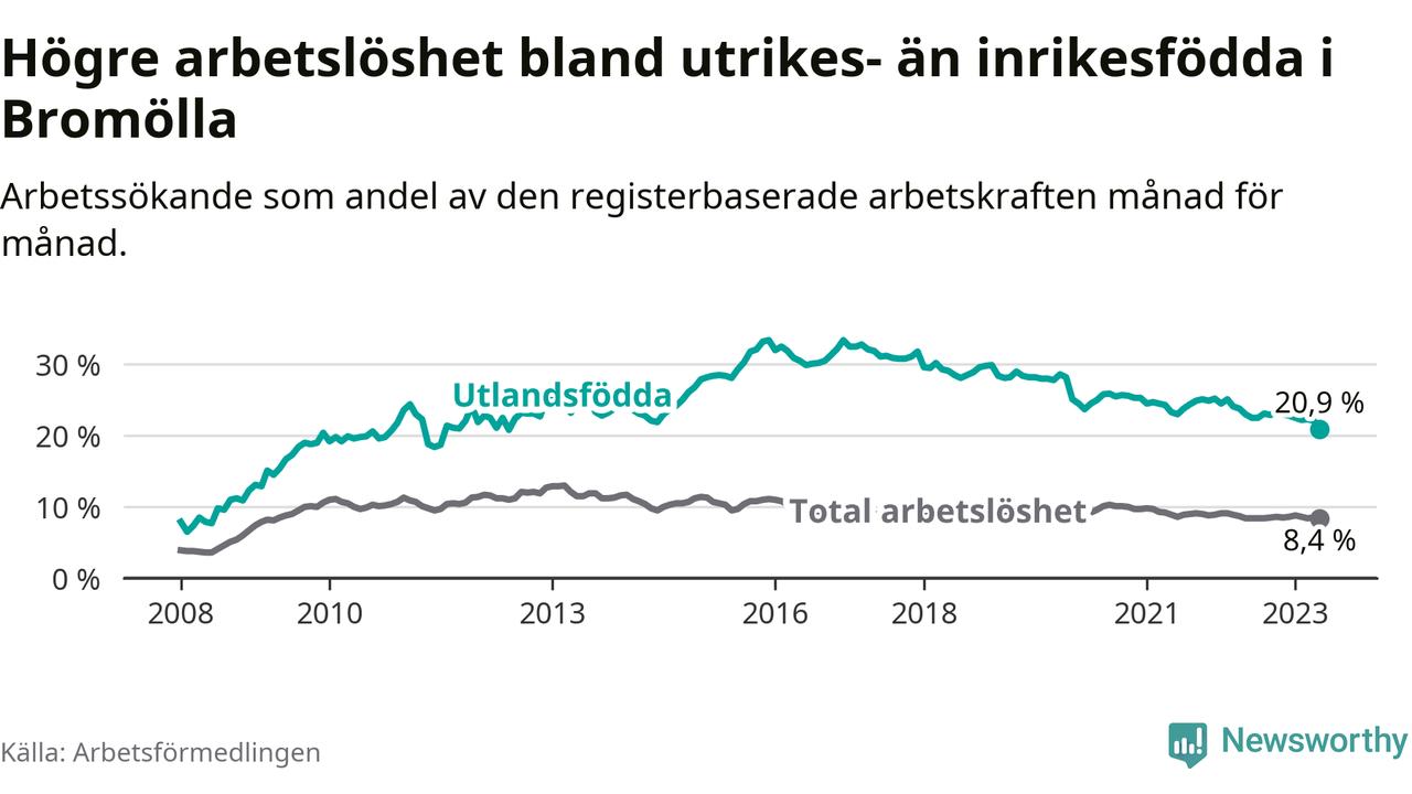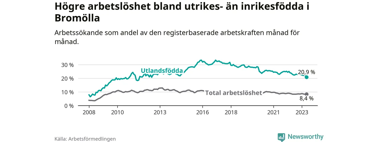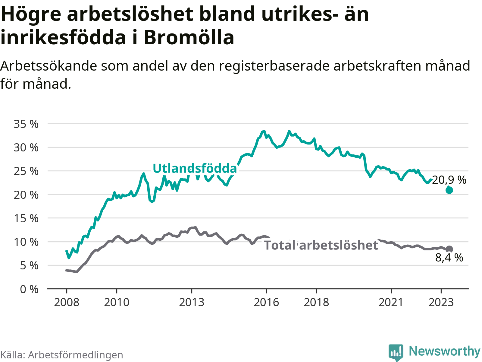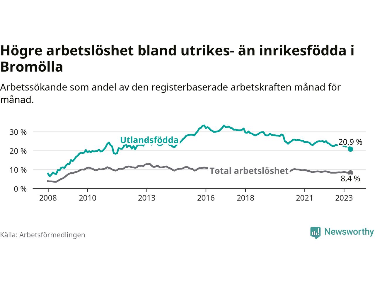 Arbetslösheten bland utlandsfödda var 20,9 procent i Bromölla under maj månad, motsvarande 259 av 1 239 personer. Det är 2,1 procentenheter färre än vid samma tidpunkt i fjol (−17 om man räknar personer). Därmed är de utlandsföddas arbetslöshet lägre än vid samma tidpunkt i fjol för 15:e månaden i följd. Sedan februari 2022 har arbetslösheten bland utlandsfödda minskat från 25,1 till 20,9 procent. Den nuvarande arbetslöshetsnivån är den lägsta sedan juni 2012.