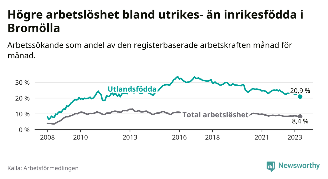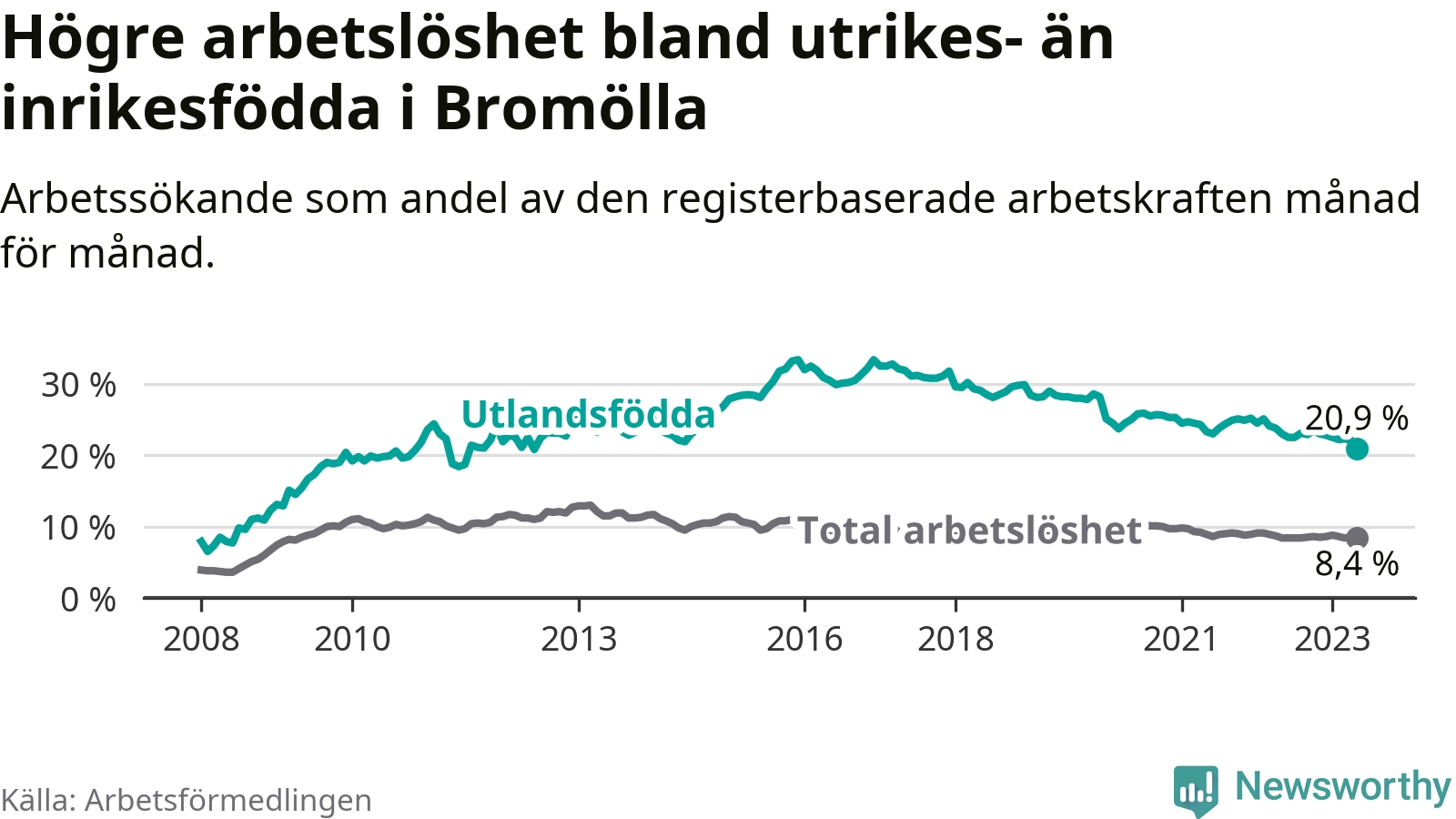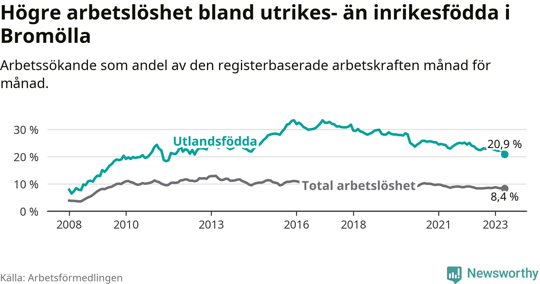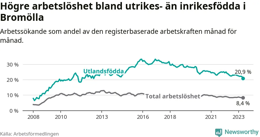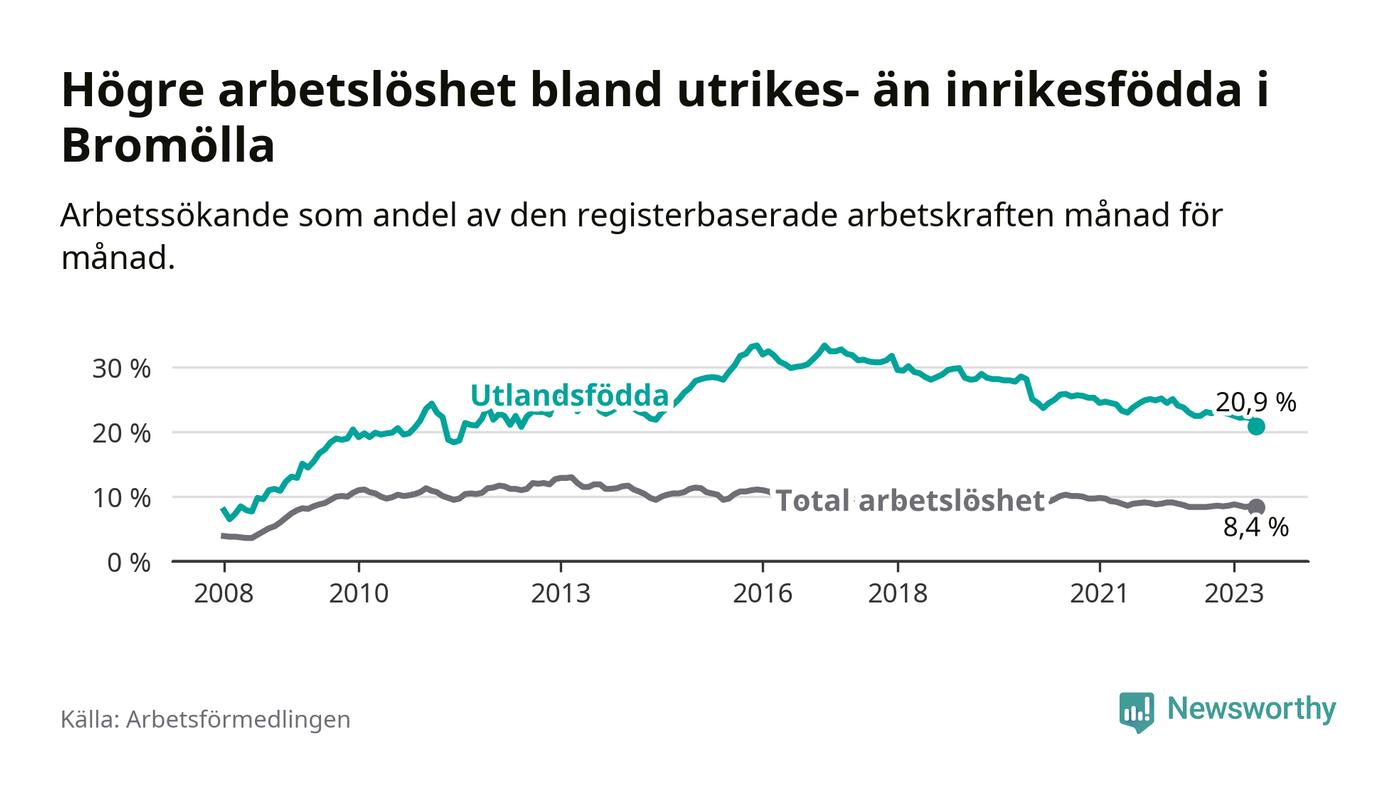 Arbetslösheten bland utlandsfödda var 20,9 procent i Bromölla under maj månad, motsvarande 259 av 1 239 personer. Det är 2,1 procentenheter färre än vid samma tidpunkt i fjol (−17 om man räknar personer). Därmed är de utlandsföddas arbetslöshet lägre än vid samma tidpunkt i fjol för 15:e månaden i följd. Sedan februari 2022 har arbetslösheten bland utlandsfödda minskat från 25,1 till 20,9 procent. Den nuvarande arbetslöshetsnivån är den lägsta sedan juni 2012.
