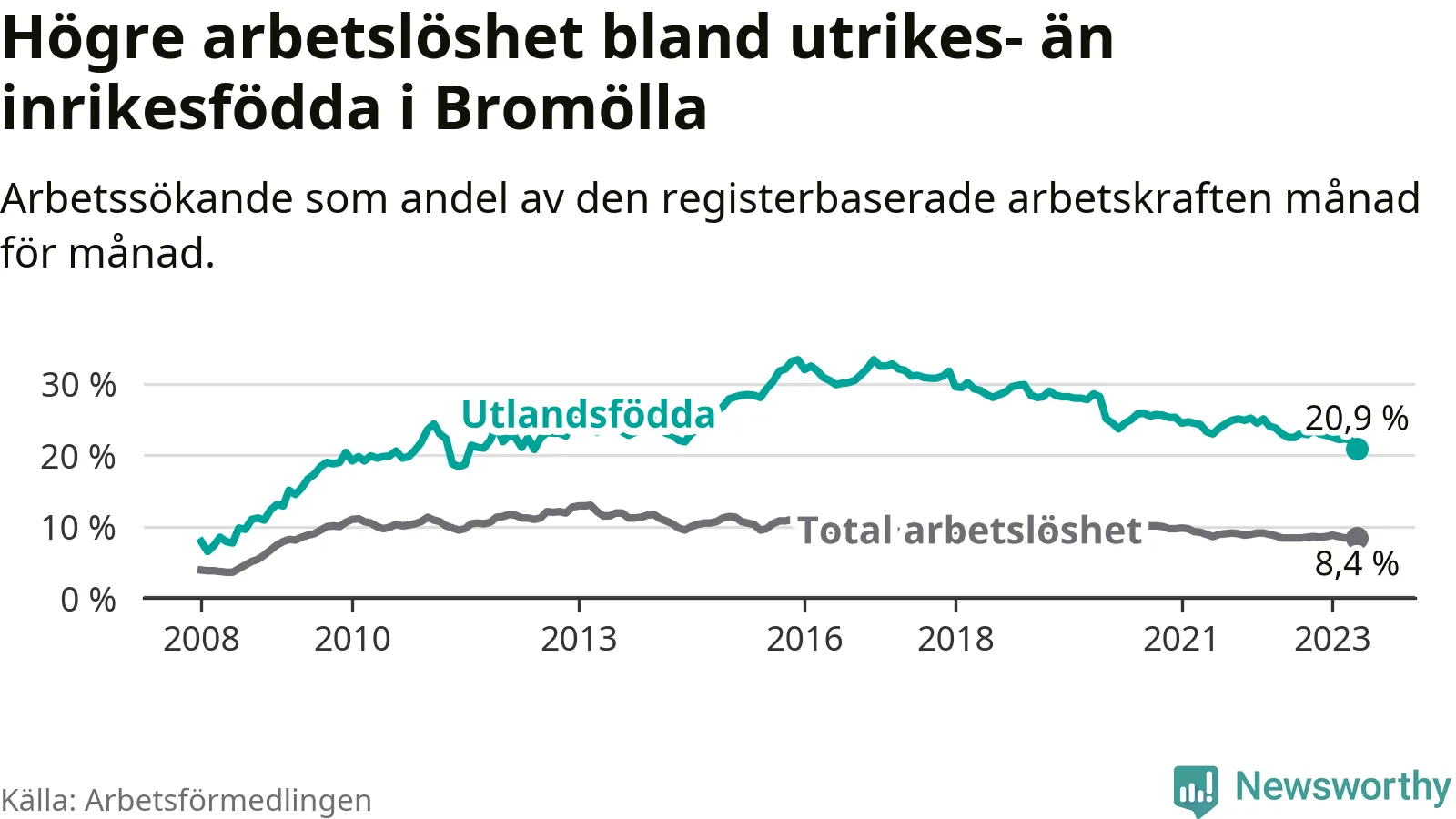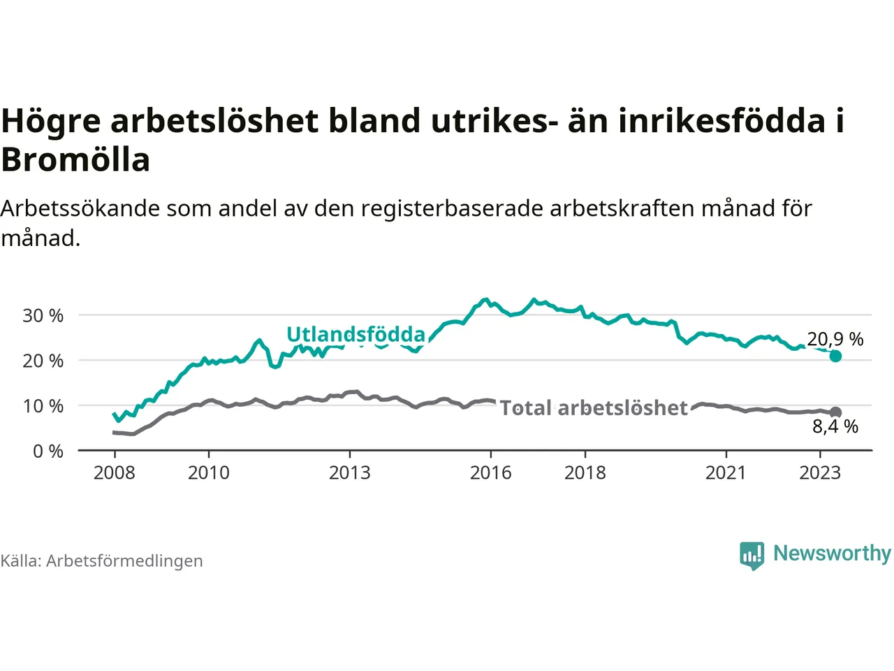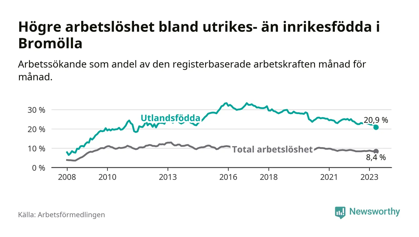 Skillnaden i arbetslöshet mellan utrikesfödda och hela befolkningen är 12,5 procentenheter i Bromölla. Det är en betydligt mindre skillnad än för ett år sedan (−2,1 procentenheter).