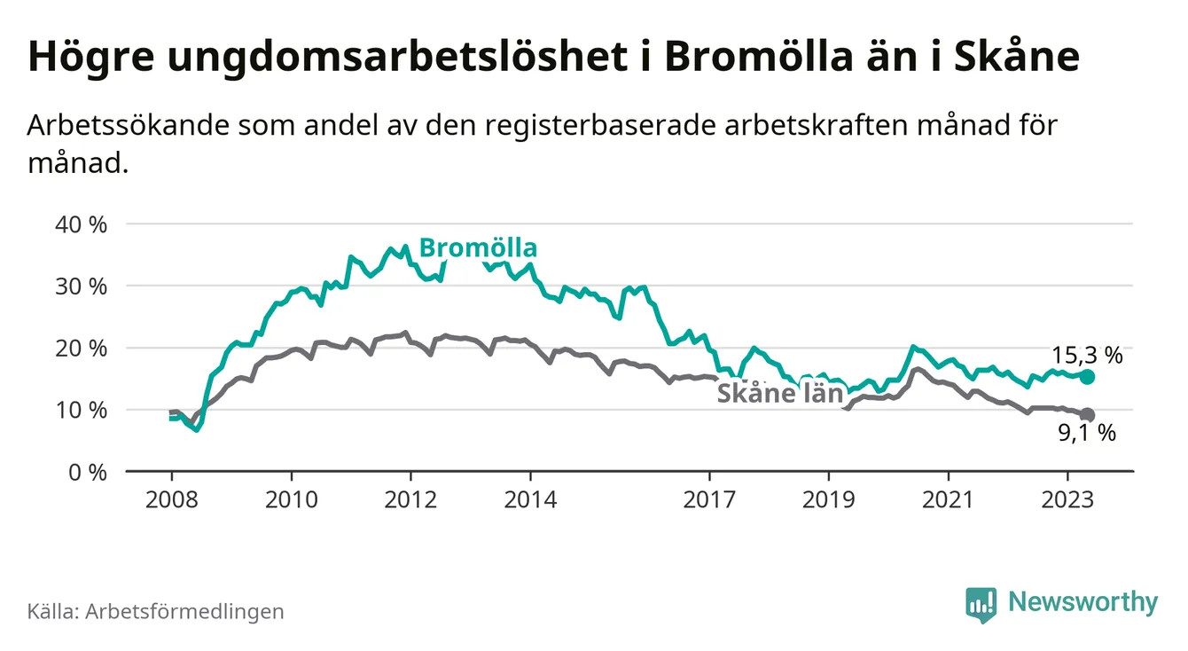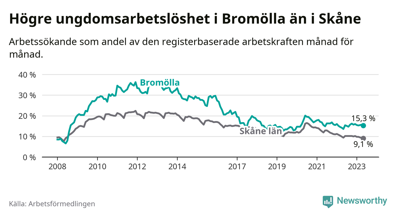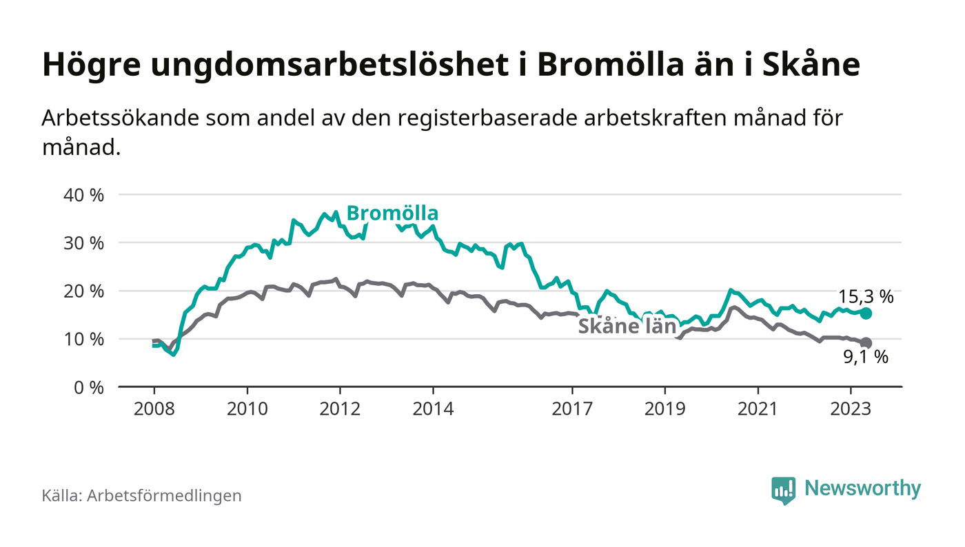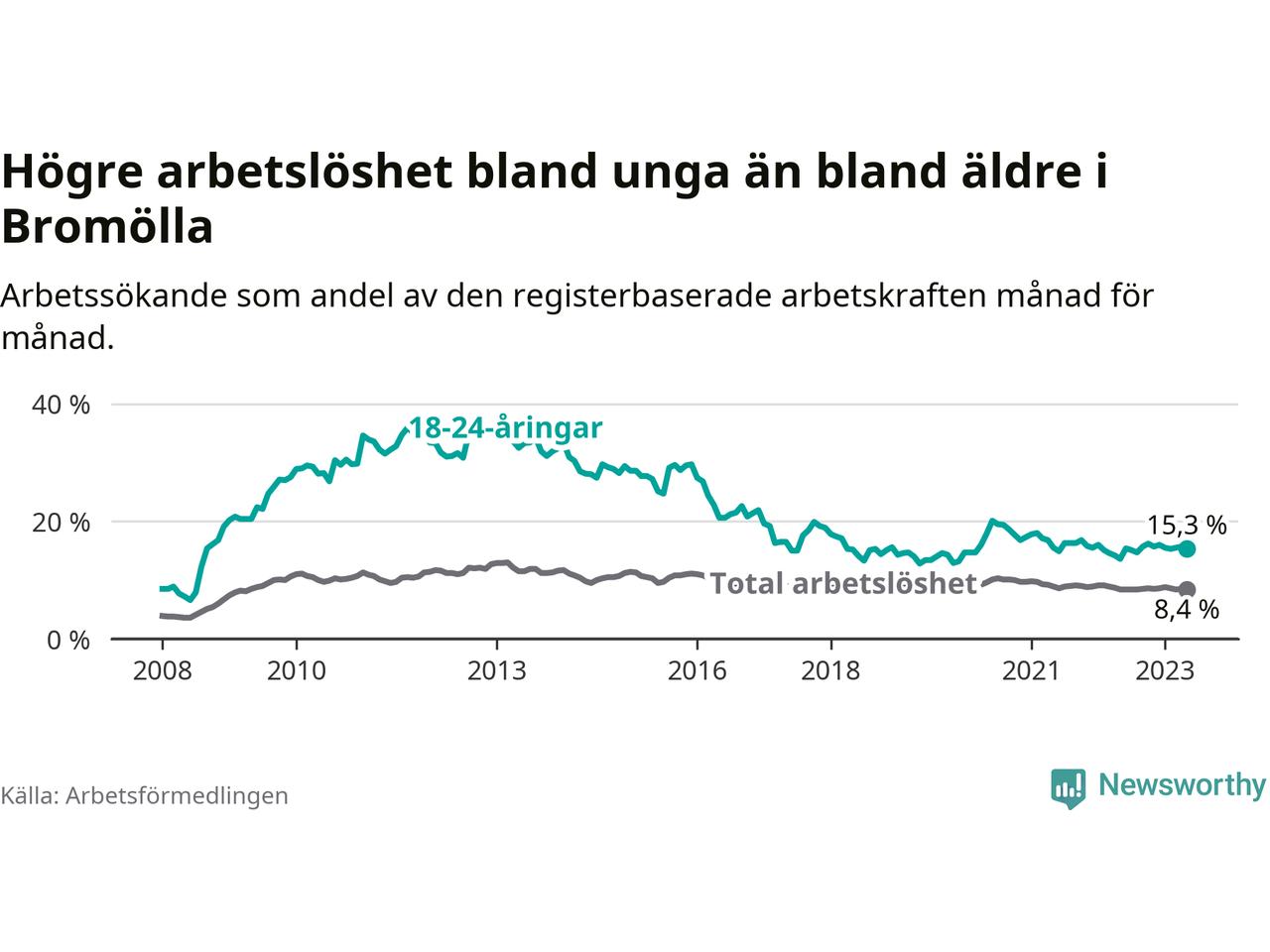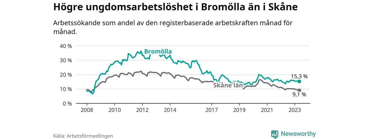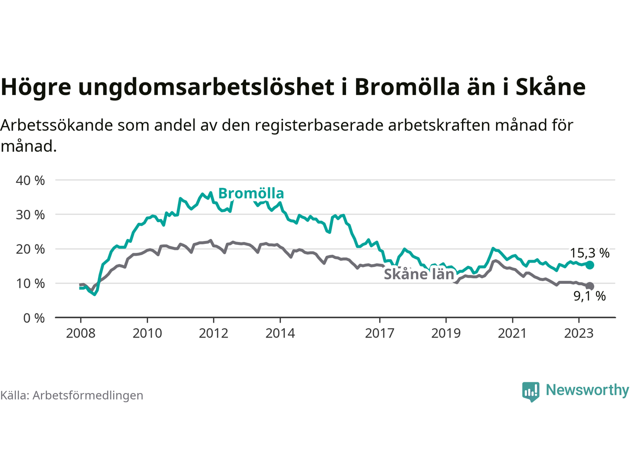 Precis som den totala arbetslösheten ligger ungdomsarbetslösheten i Bromölla högre än i Skåne som helhet. Skillnaden mellan kommunen och länet är 6,2 procentenheter.