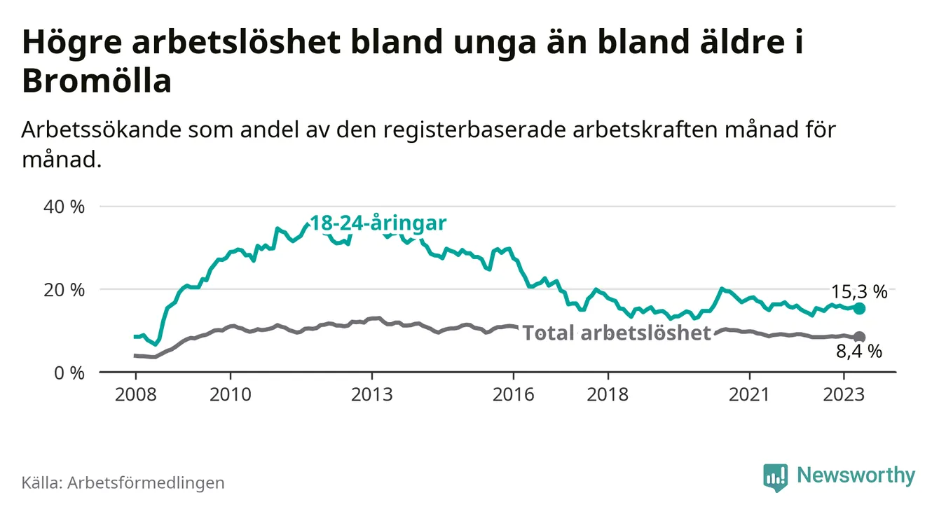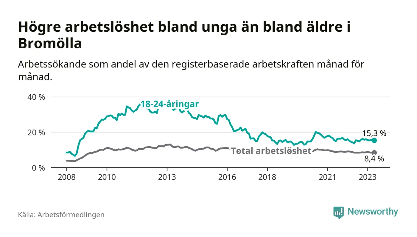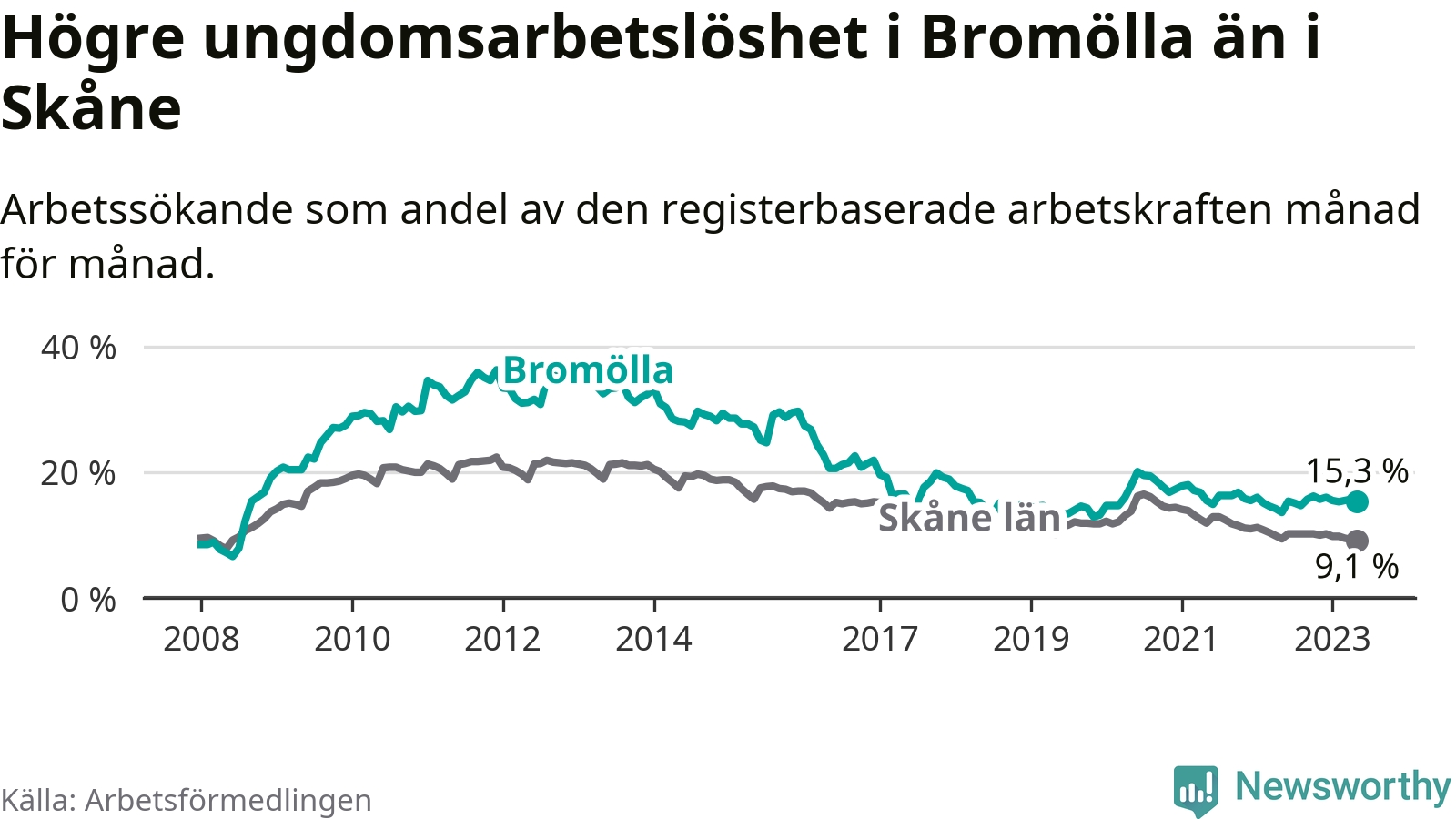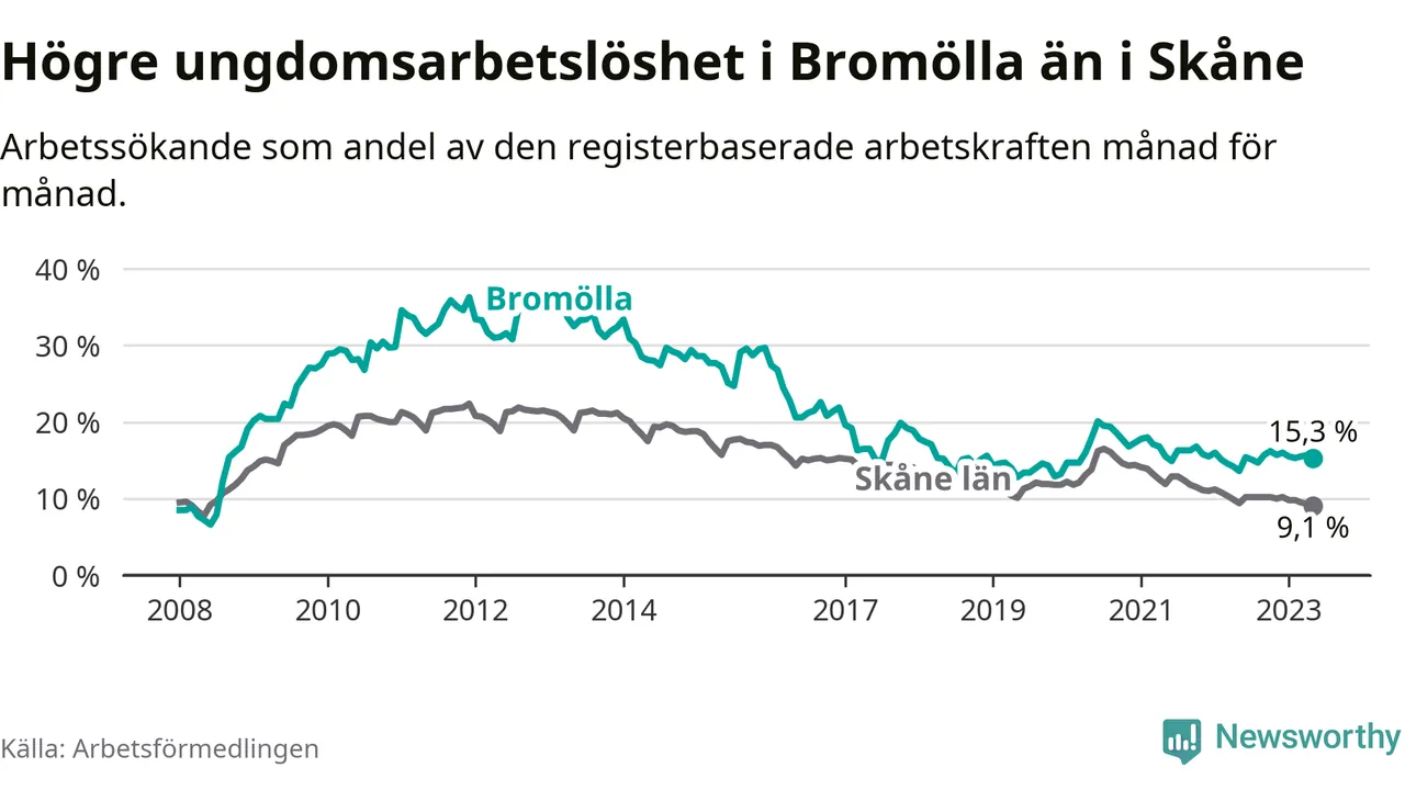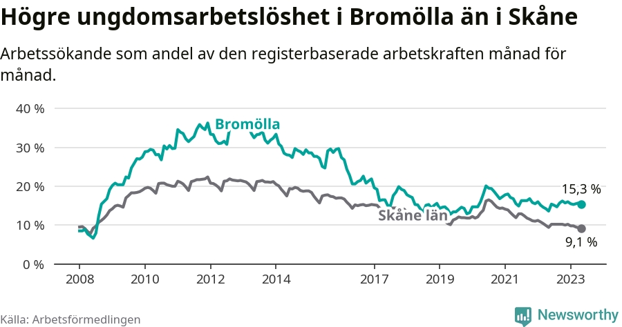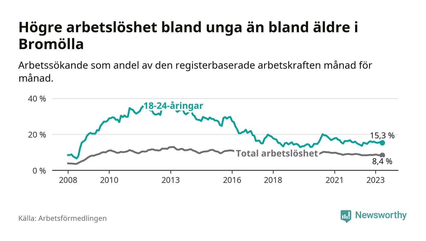 Precis som den totala arbetslösheten ligger ungdomsarbetslösheten i Bromölla högre än i Skåne som helhet. Skillnaden mellan kommunen och länet är 6,2 procentenheter.