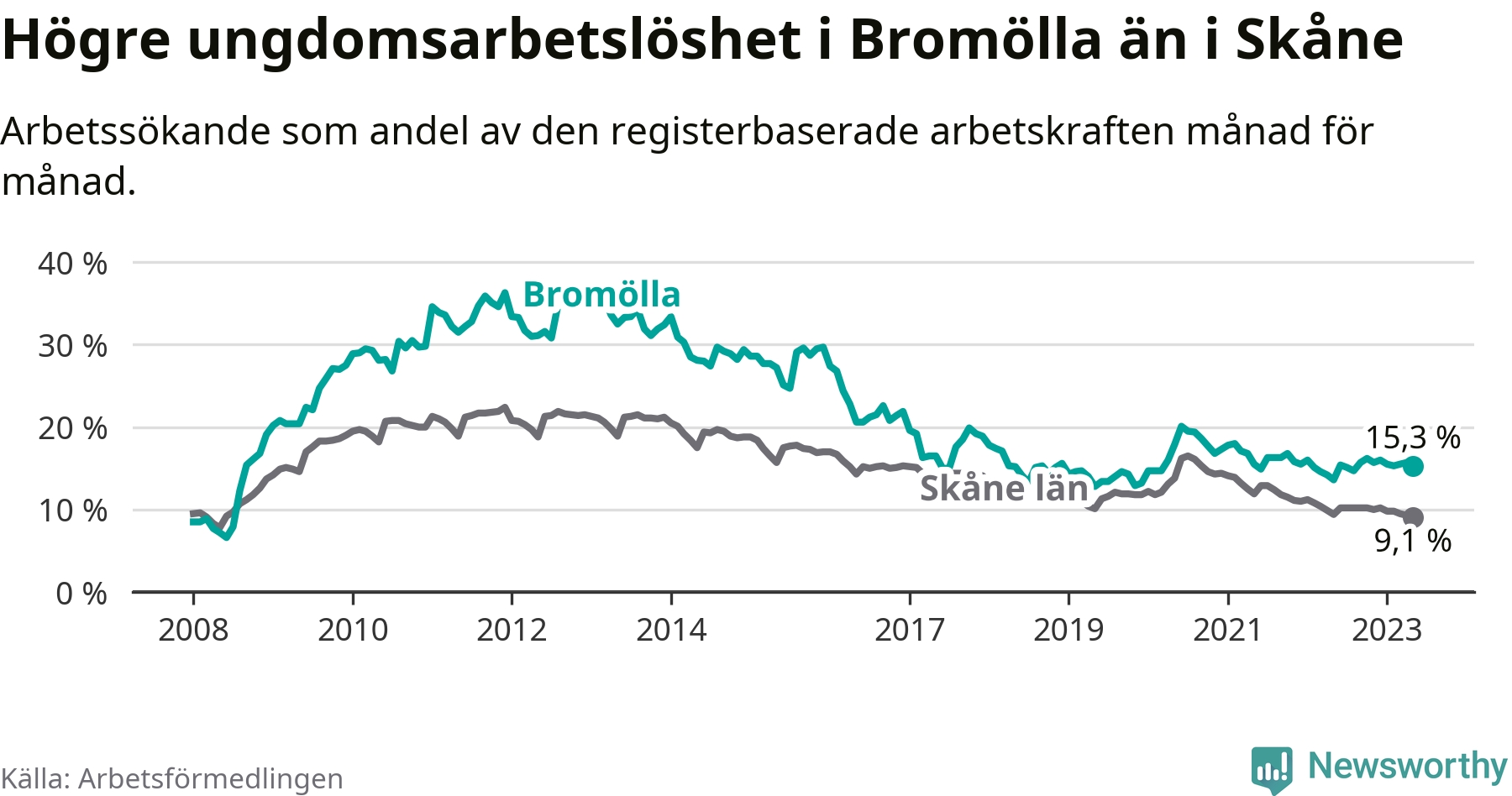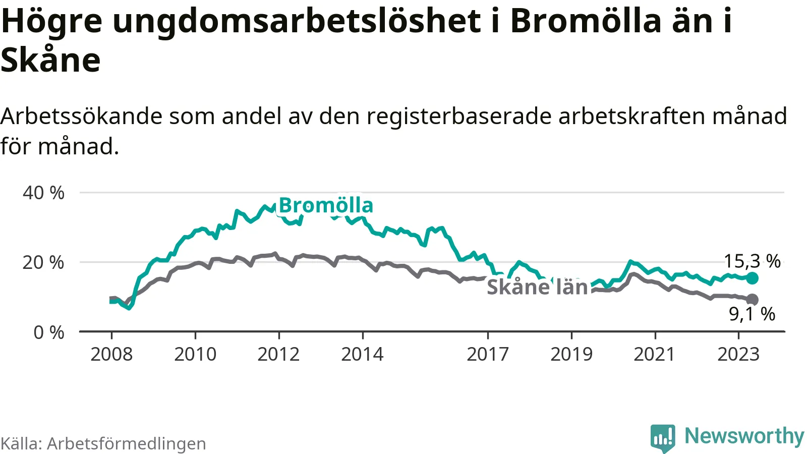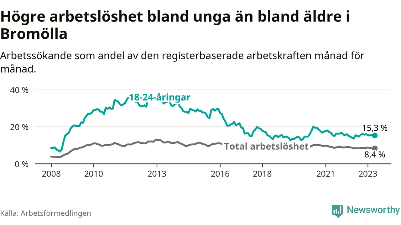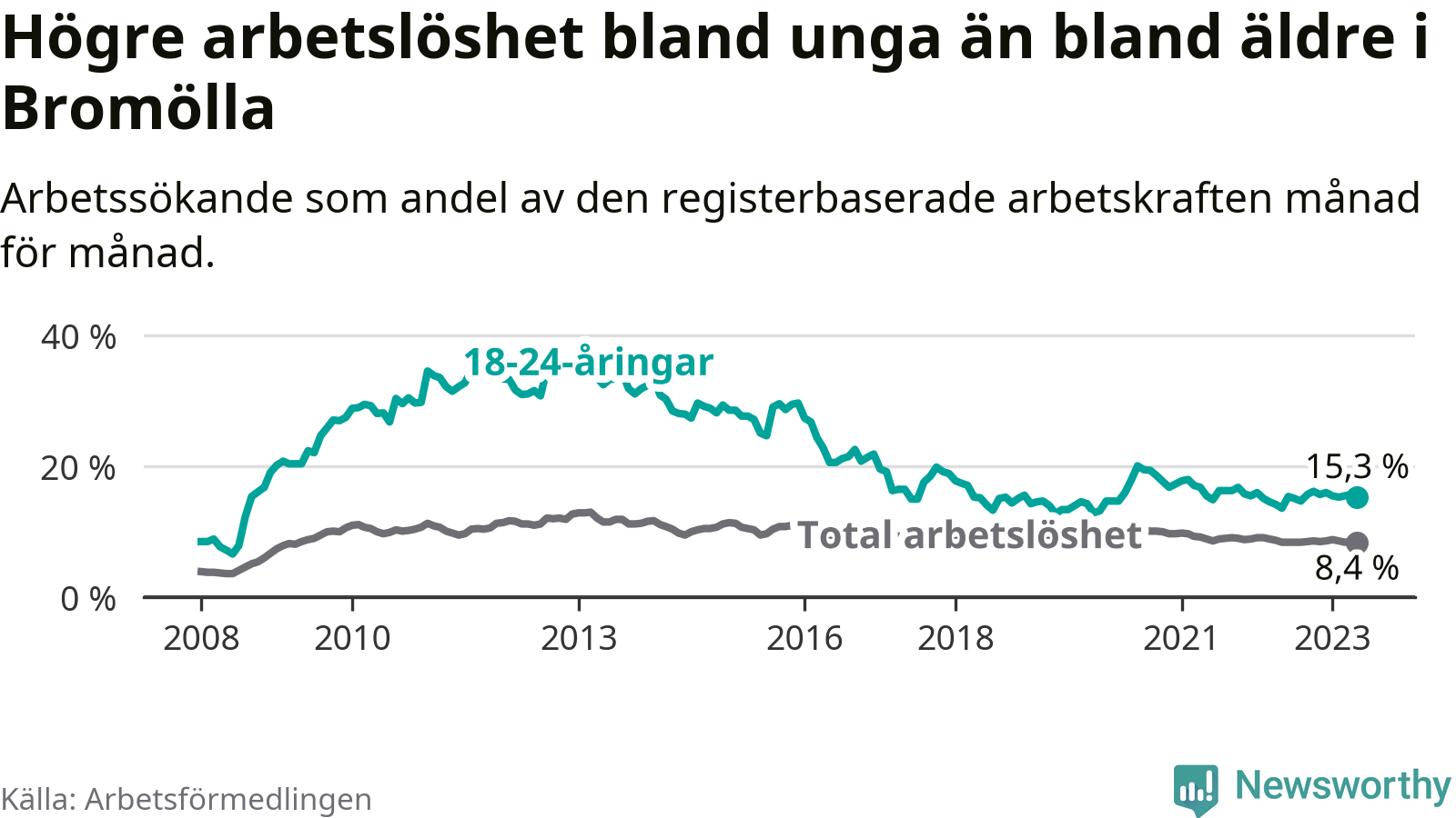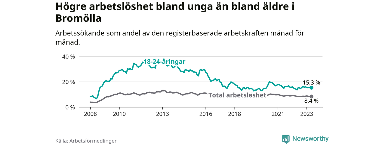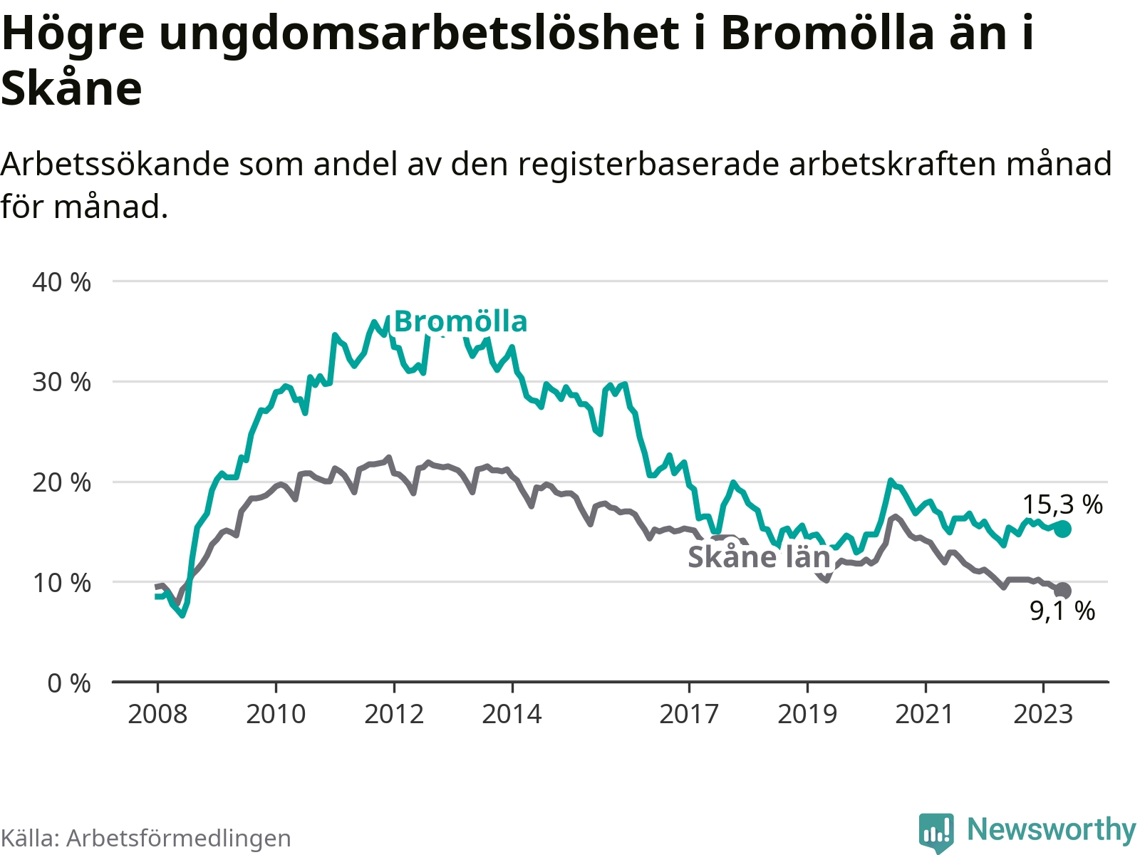 Precis som den totala arbetslösheten ligger ungdomsarbetslösheten i Bromölla högre än i Skåne som helhet. Skillnaden mellan kommunen och länet är 6,2 procentenheter.