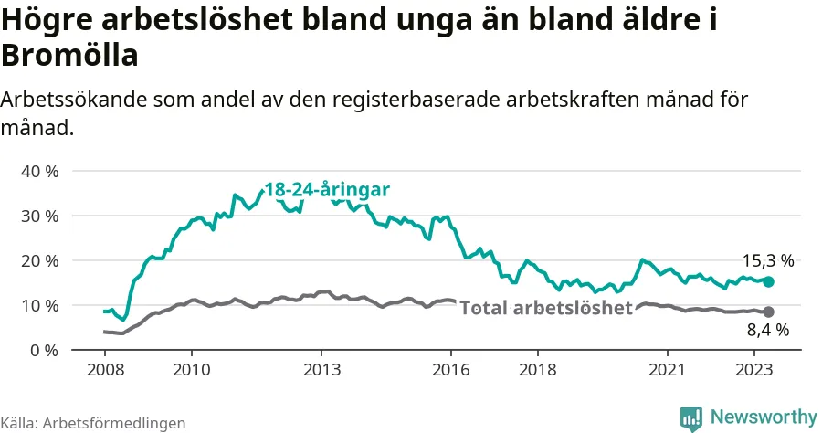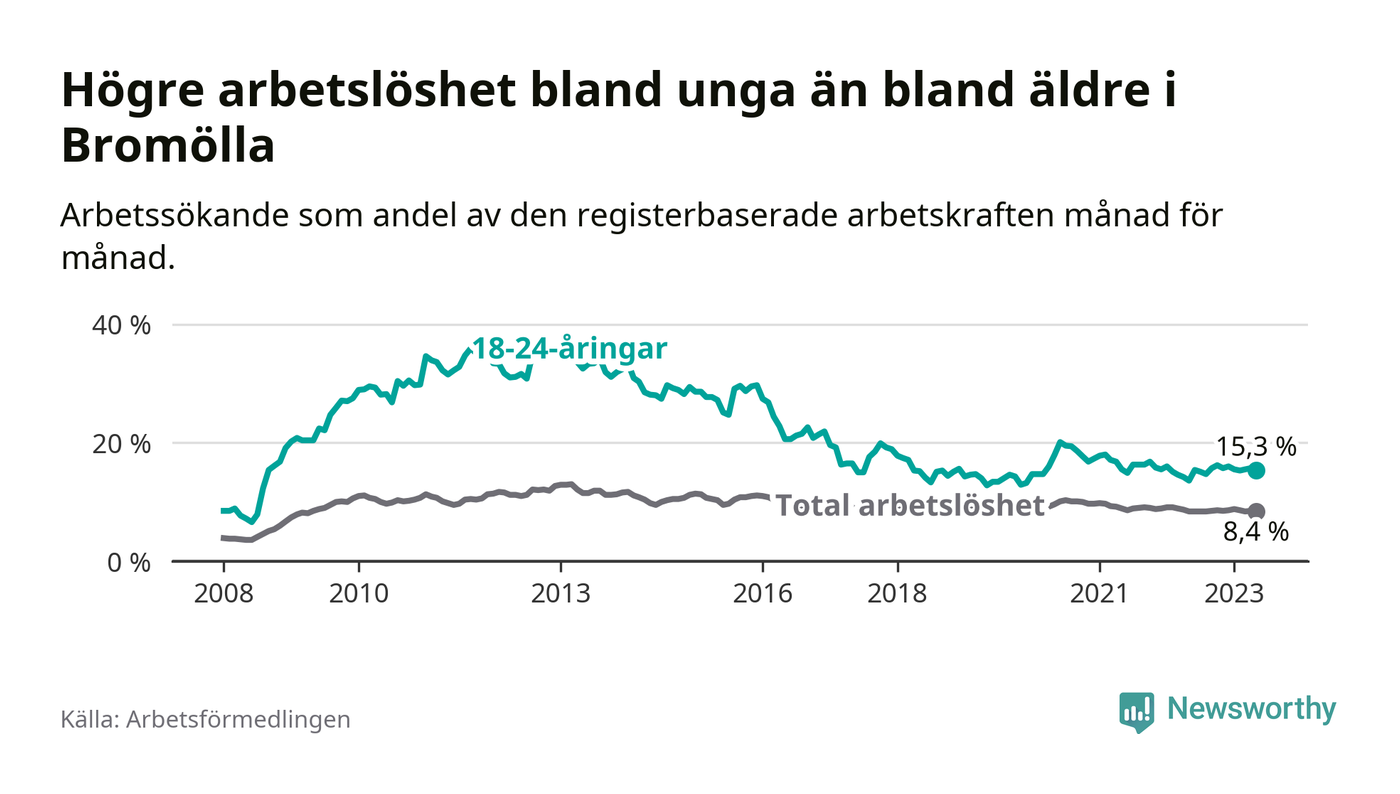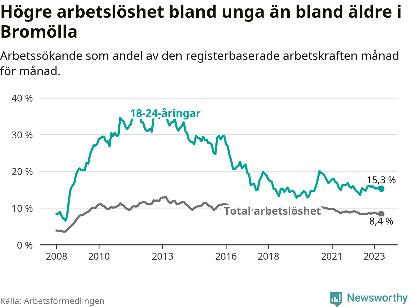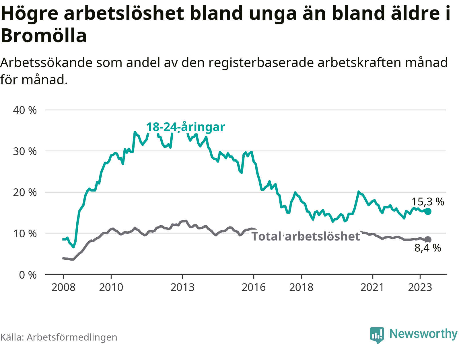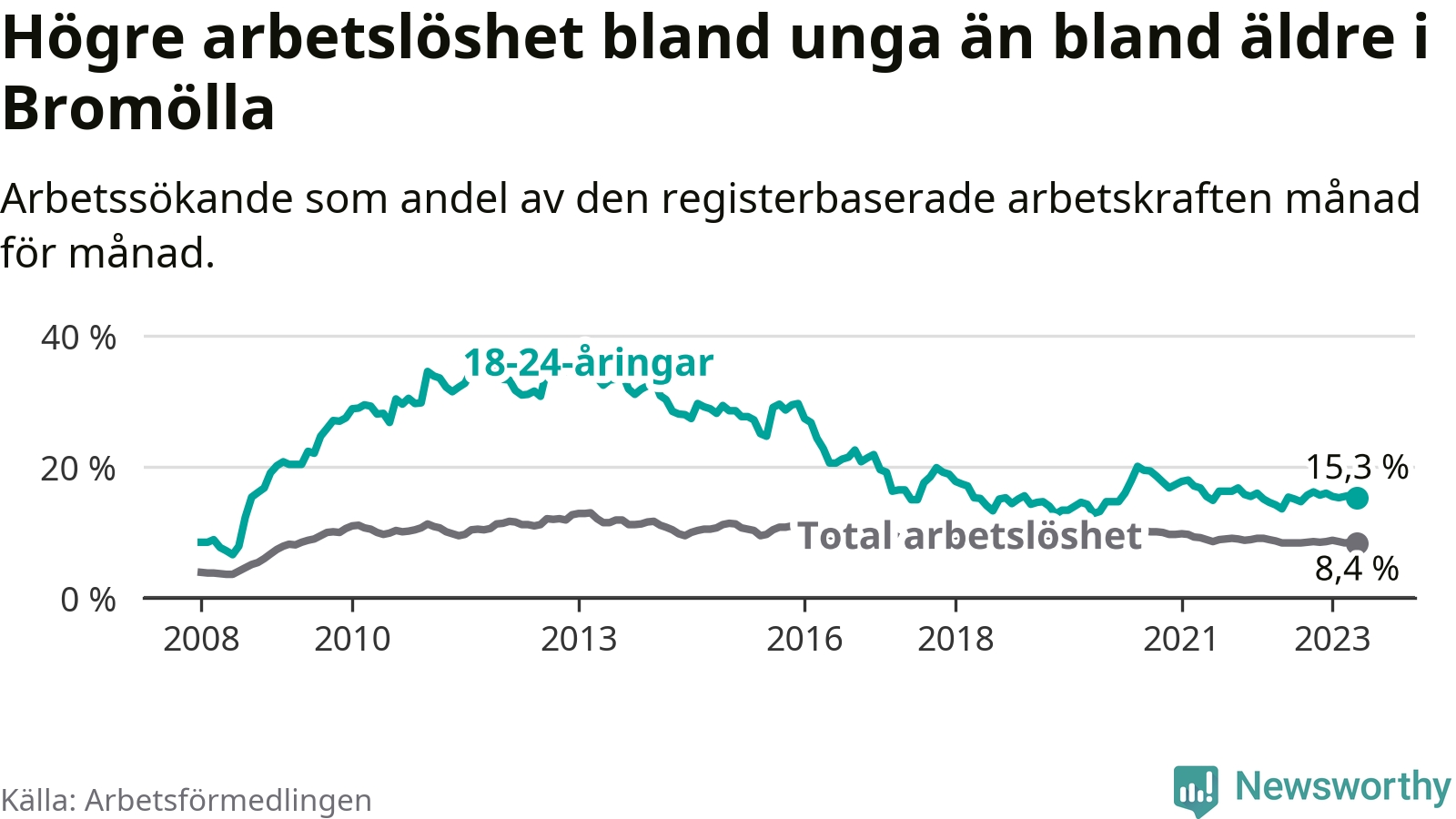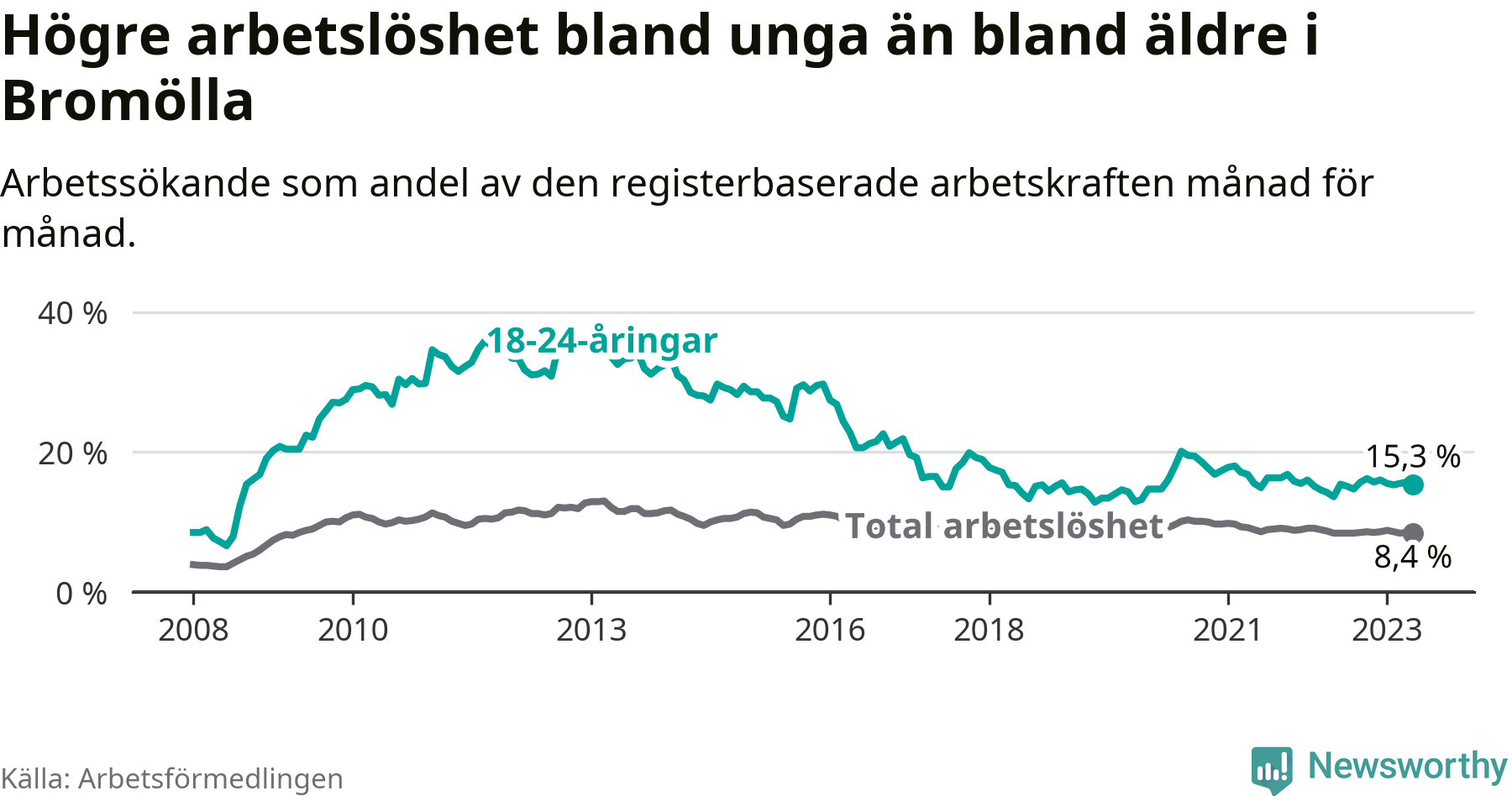 Precis som den totala arbetslösheten ligger ungdomsarbetslösheten i Bromölla högre än i Skåne som helhet. Skillnaden mellan kommunen och länet är 6,2 procentenheter.