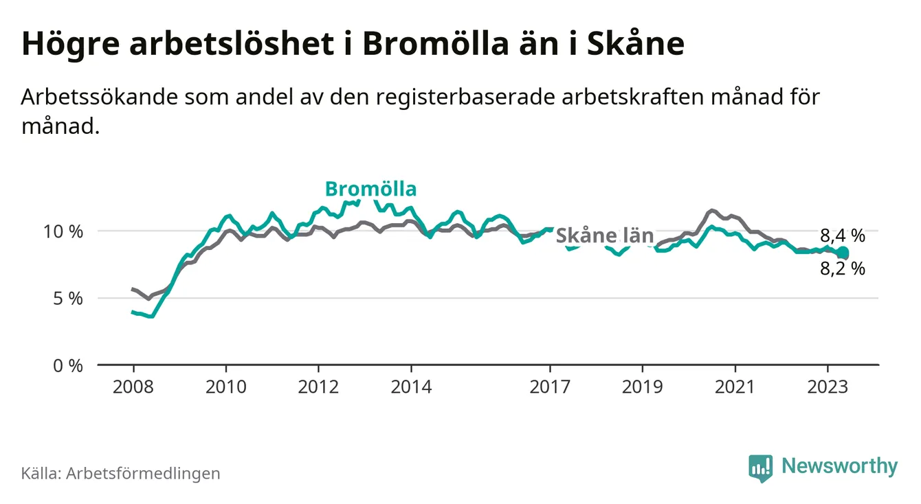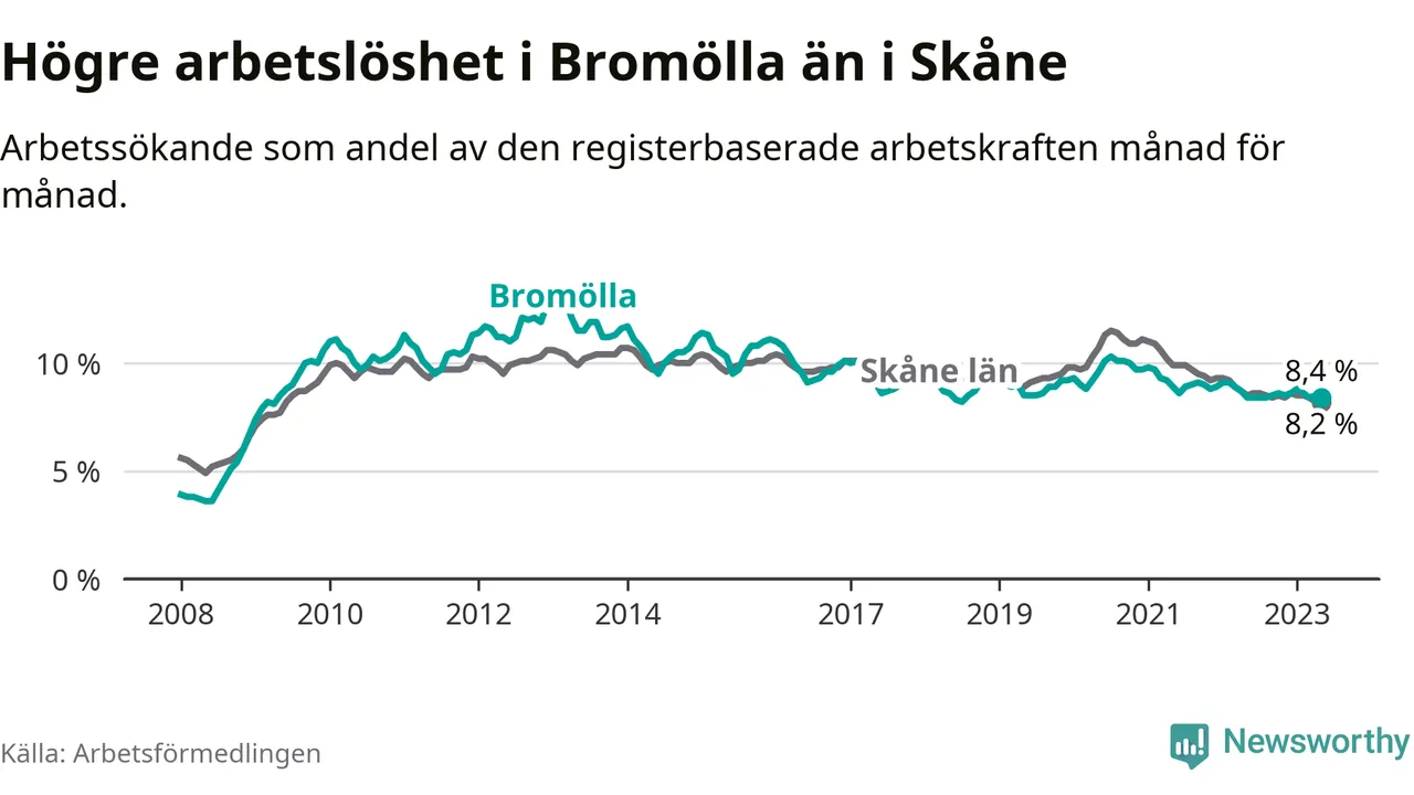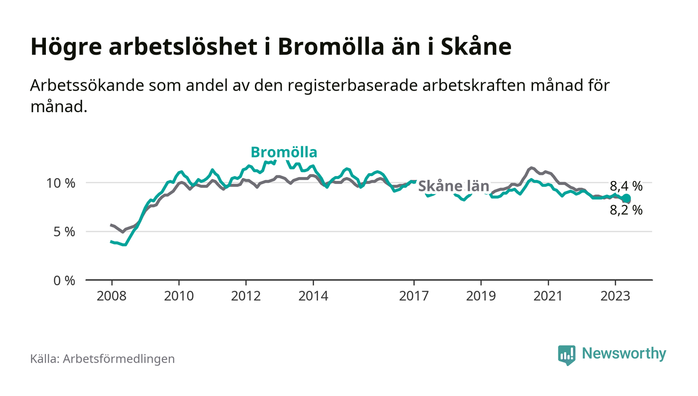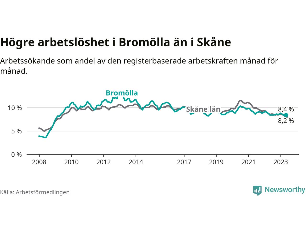 Under maj månad rapporterade Bromölla kommun en total arbetslöshet på 8,4 procent. Det är i samma nivå som i maj i fjol. I Skåne län däremot sjunker arbetslösheten