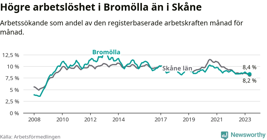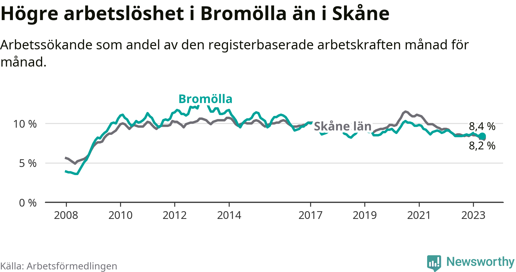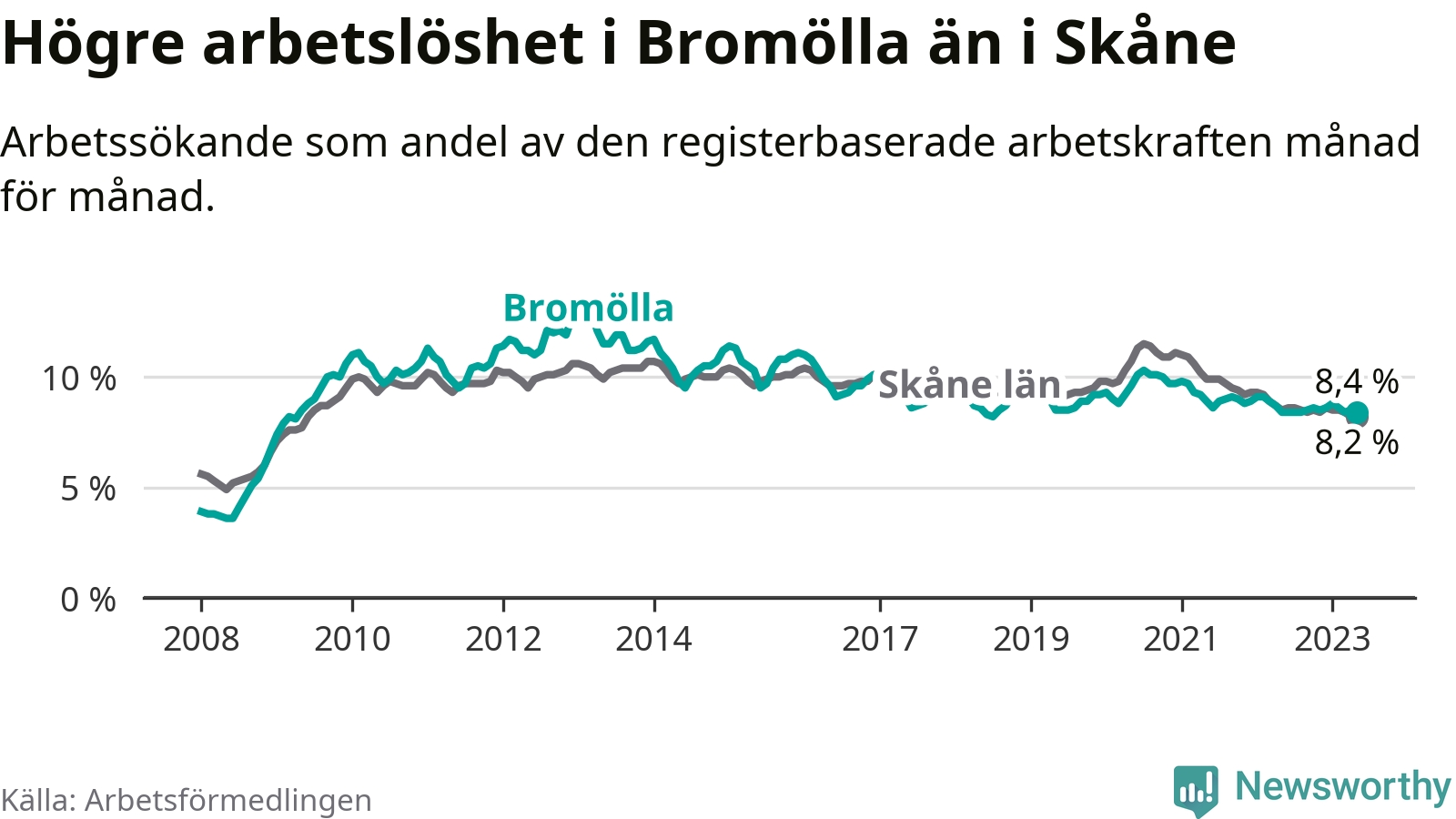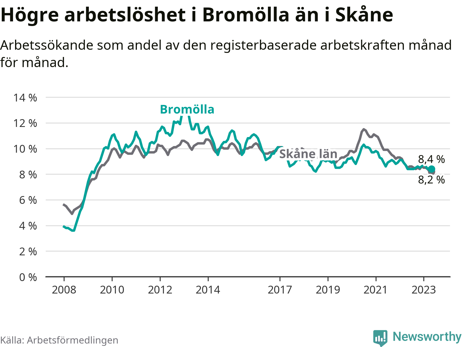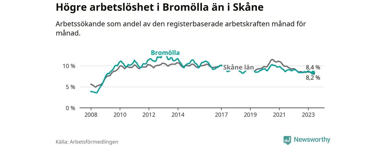 Under maj månad rapporterade Bromölla kommun en total arbetslöshet på 8,4 procent. Det är i samma nivå som i maj i fjol. I Skåne län däremot sjunker arbetslösheten