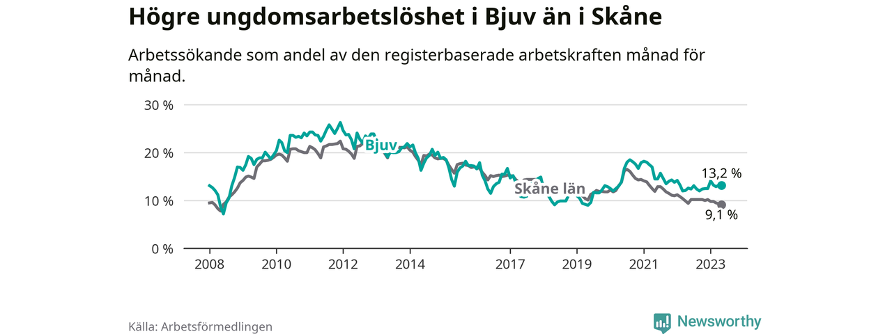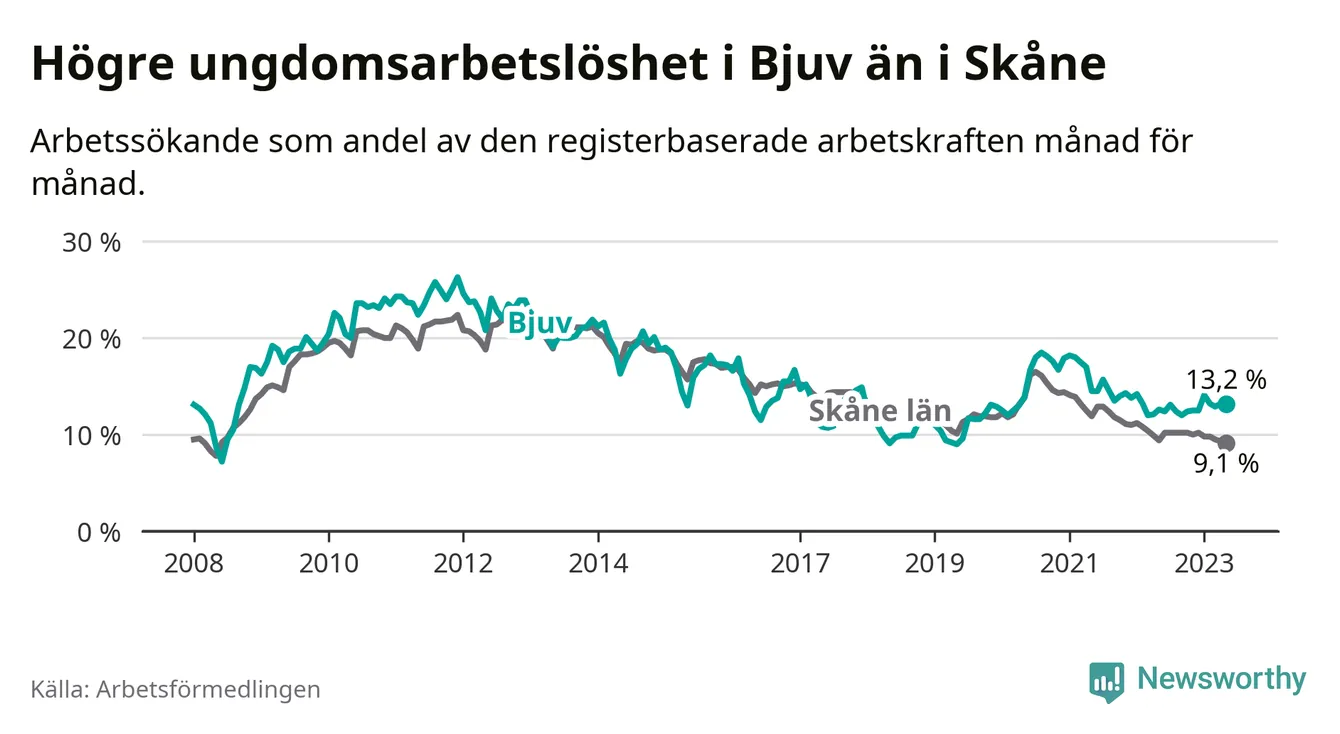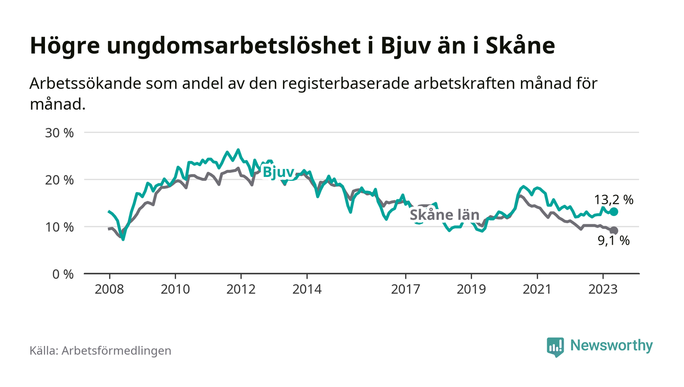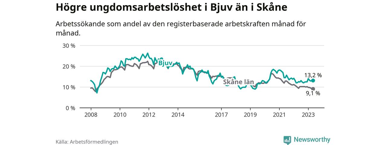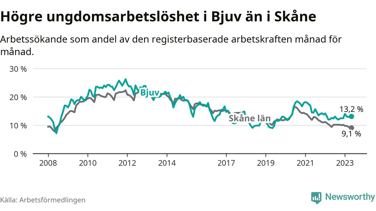 Precis som den totala arbetslösheten ligger ungdomsarbetslösheten i Bjuv högre än i Skåne som helhet. Skillnaden mellan kommunen och länet är 4,1 procentenheter.