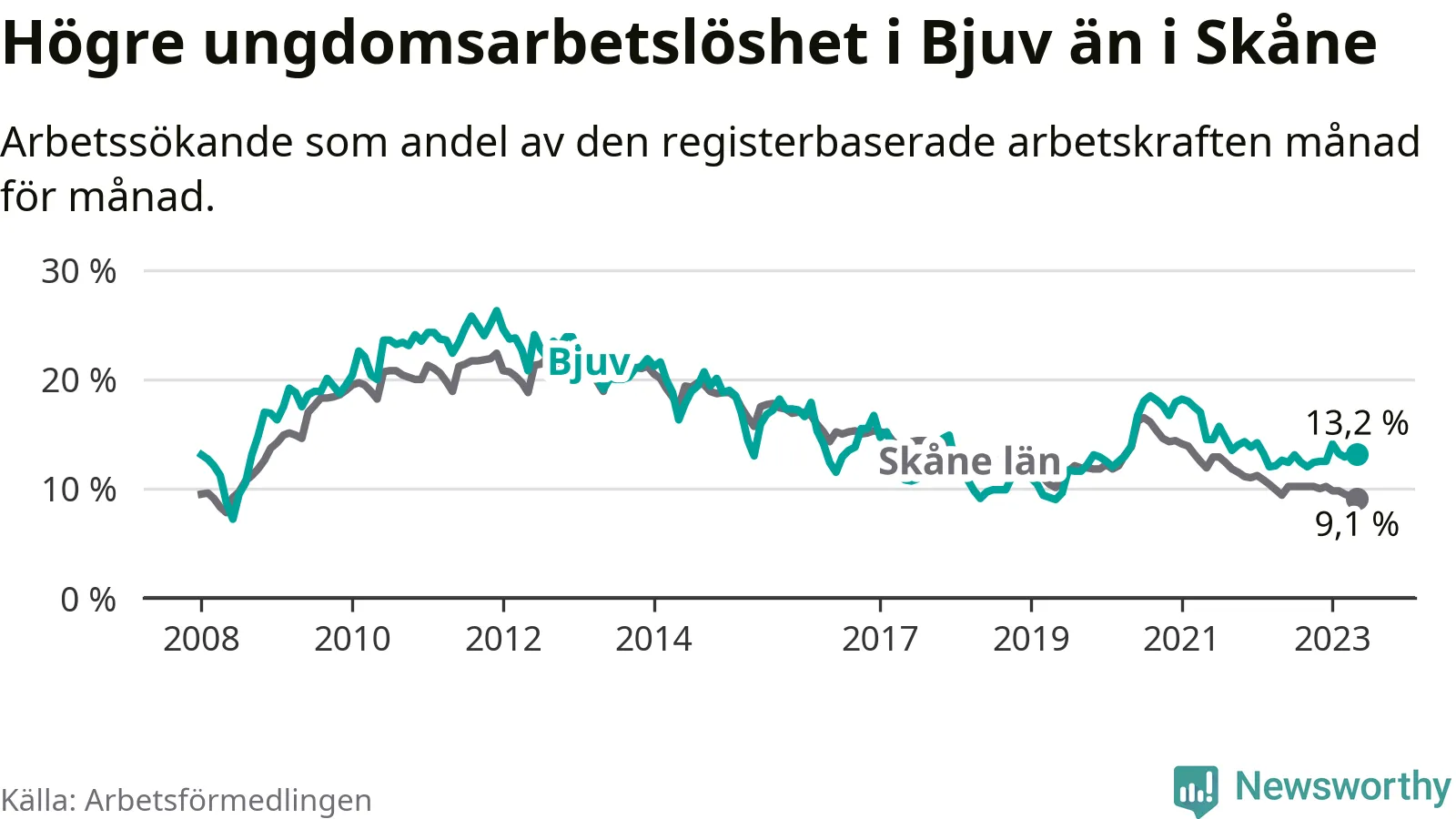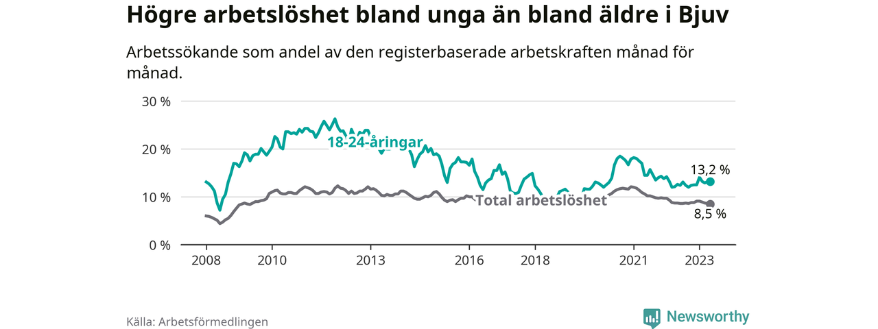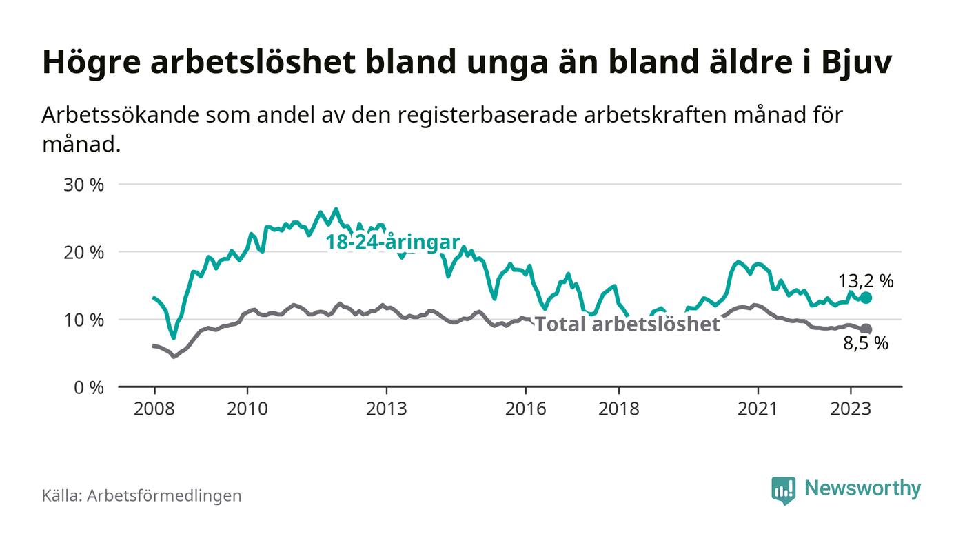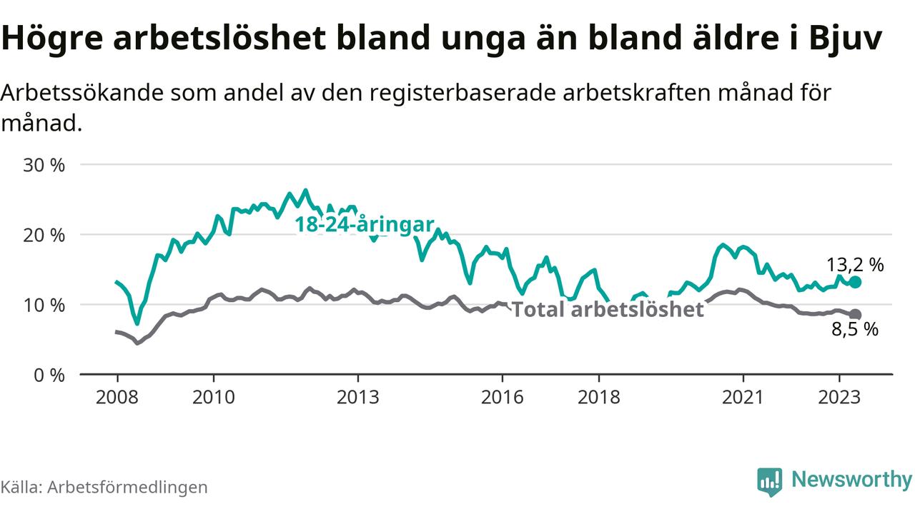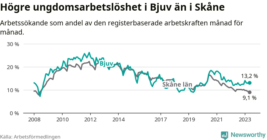 Precis som den totala arbetslösheten ligger ungdomsarbetslösheten i Bjuv högre än i Skåne som helhet. Skillnaden mellan kommunen och länet är 4,1 procentenheter.