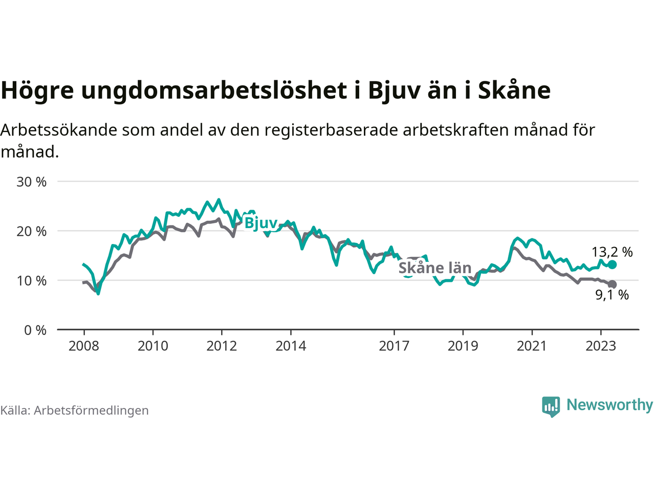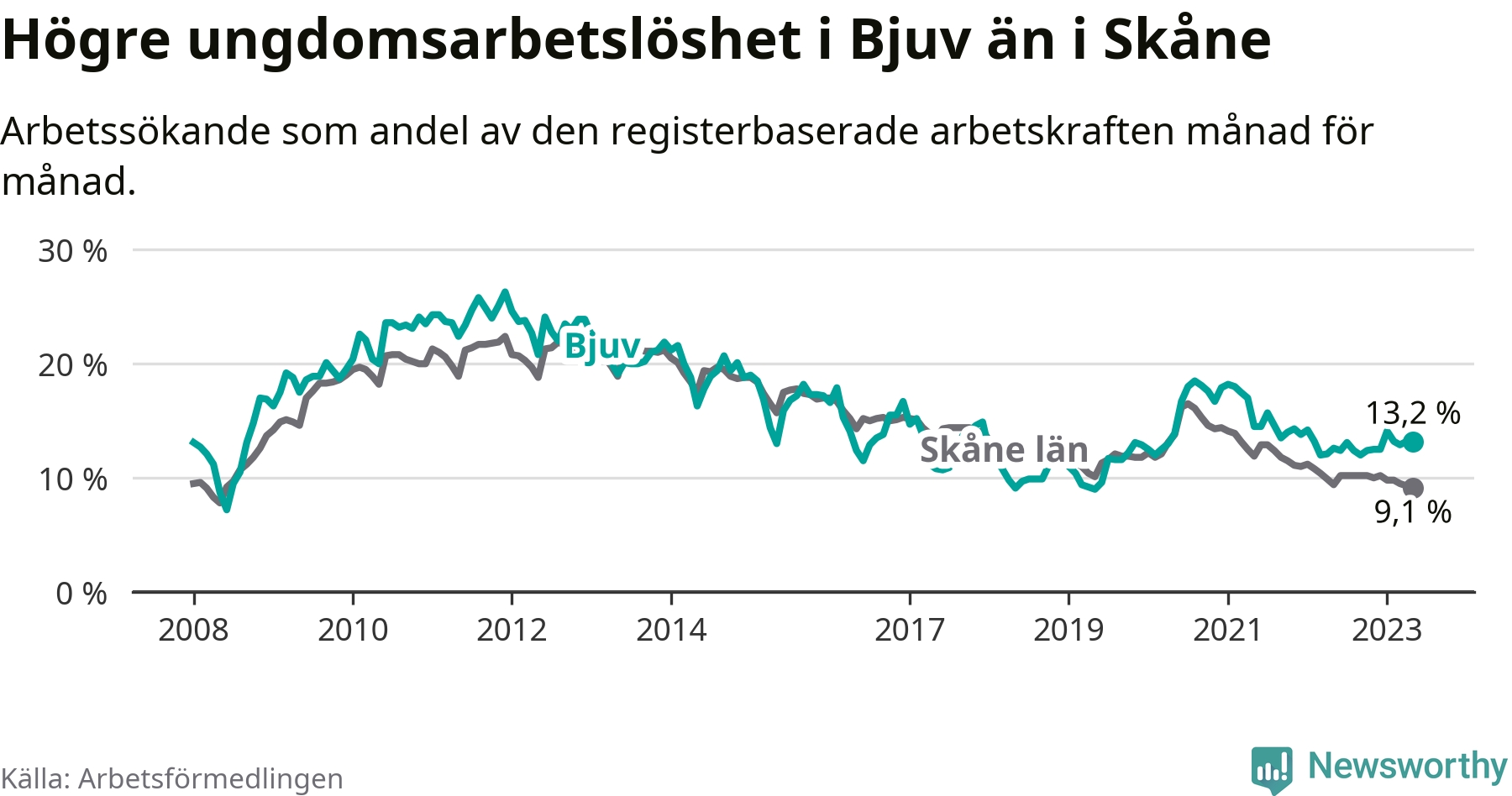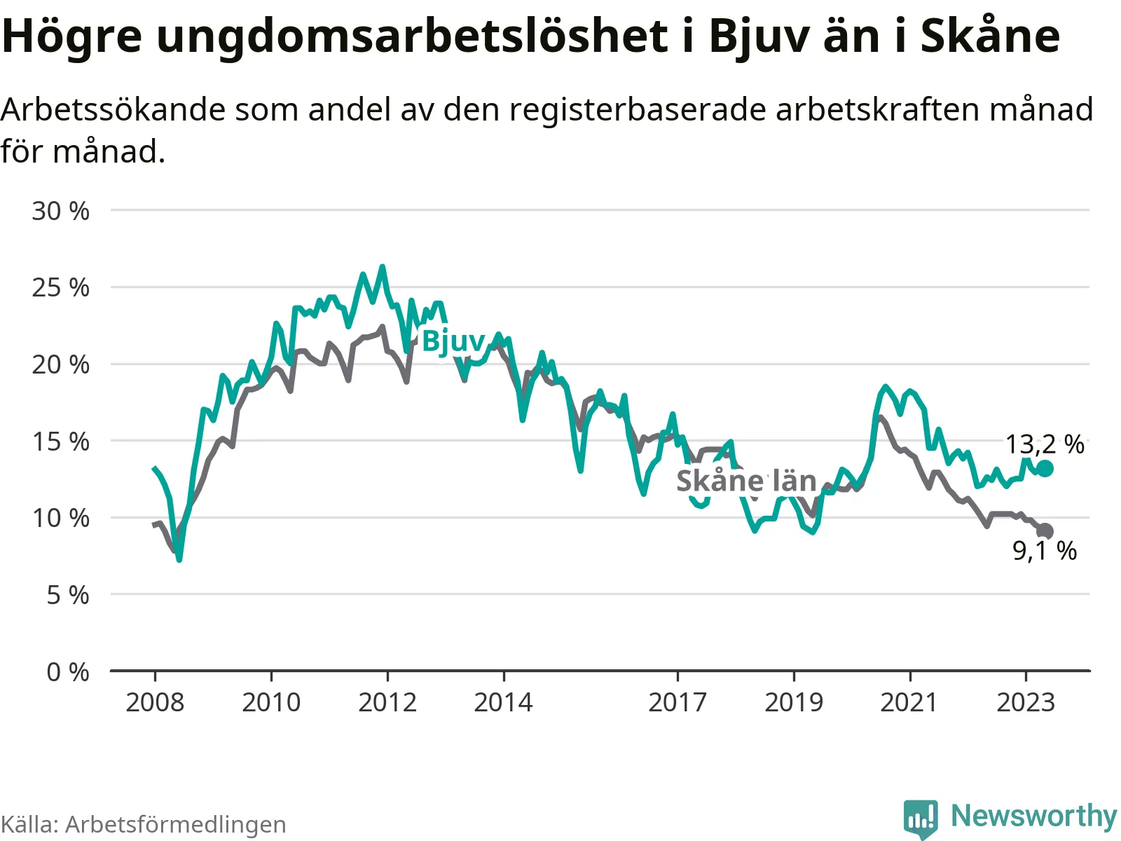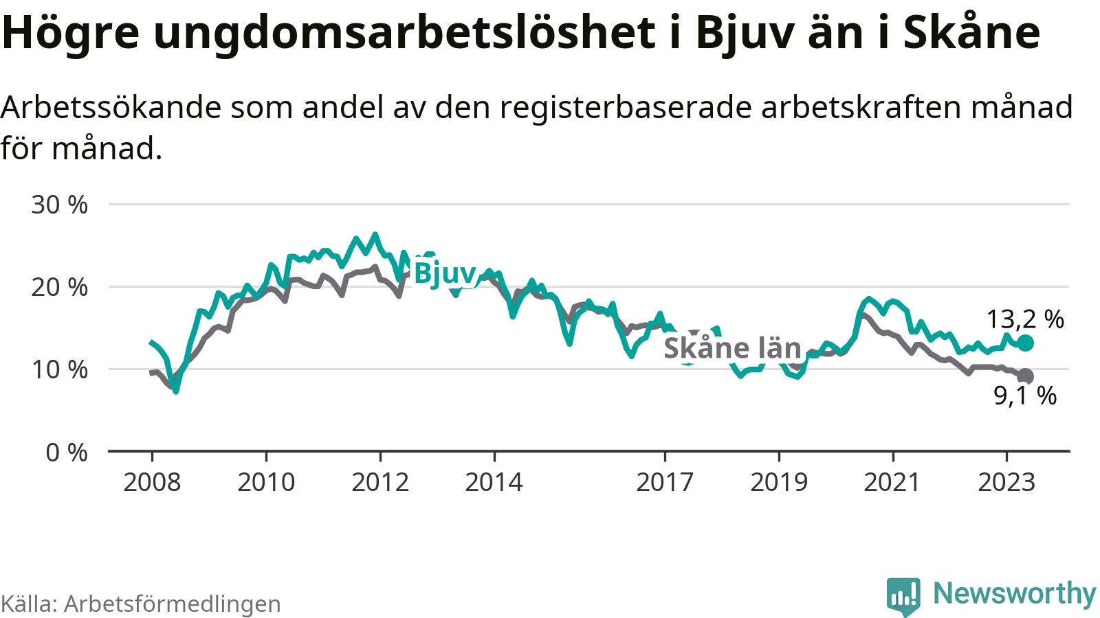 Precis som den totala arbetslösheten ligger ungdomsarbetslösheten i Bjuv högre än i Skåne som helhet. Skillnaden mellan kommunen och länet är 4,1 procentenheter.