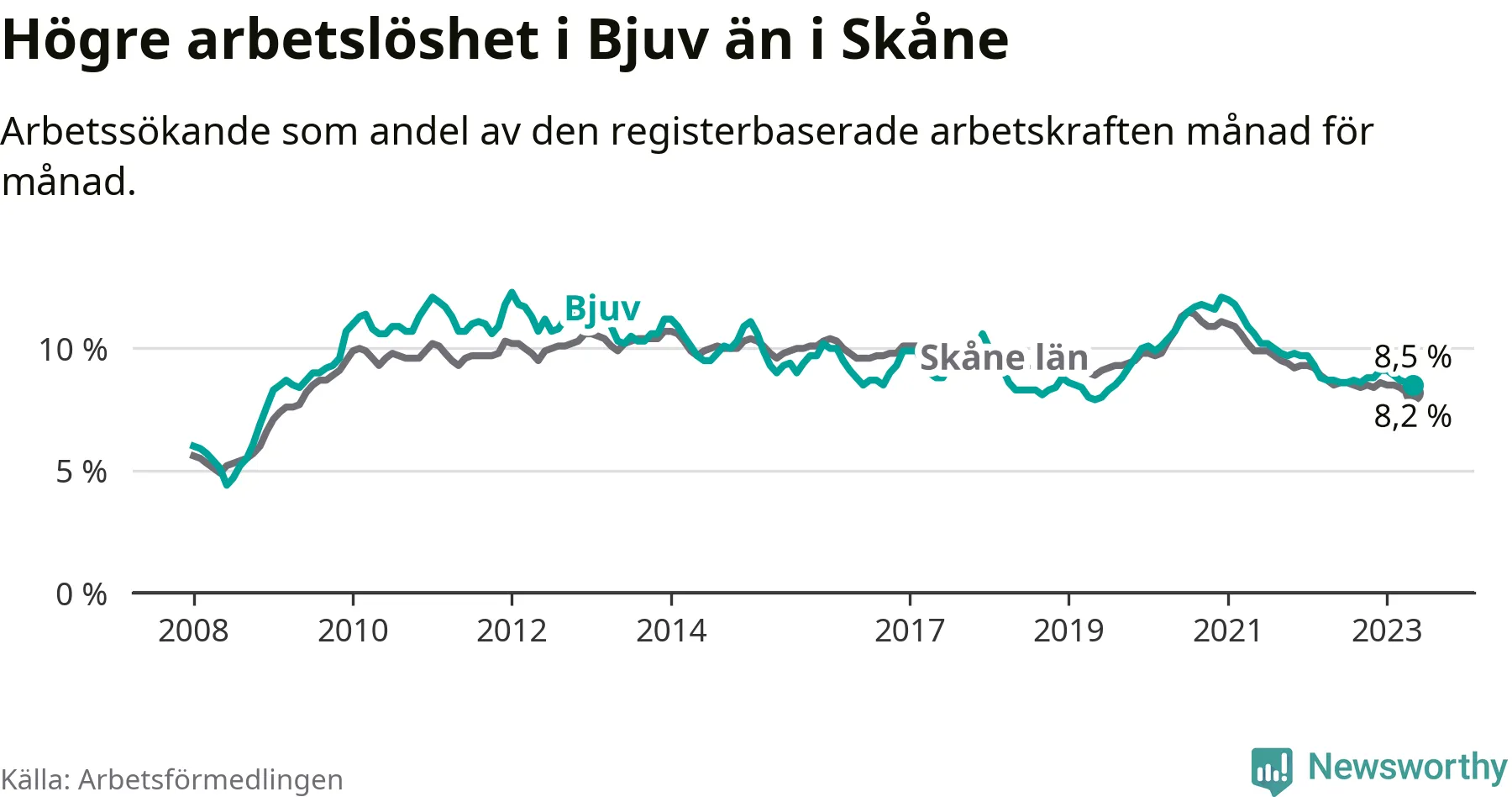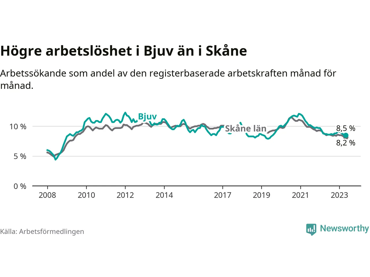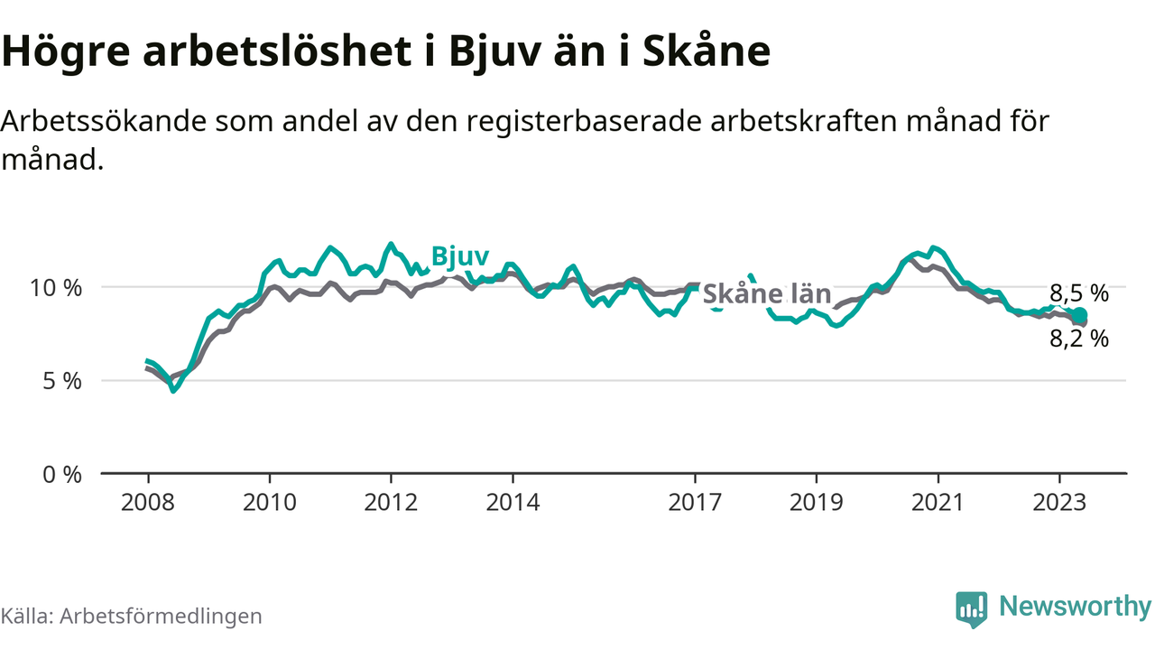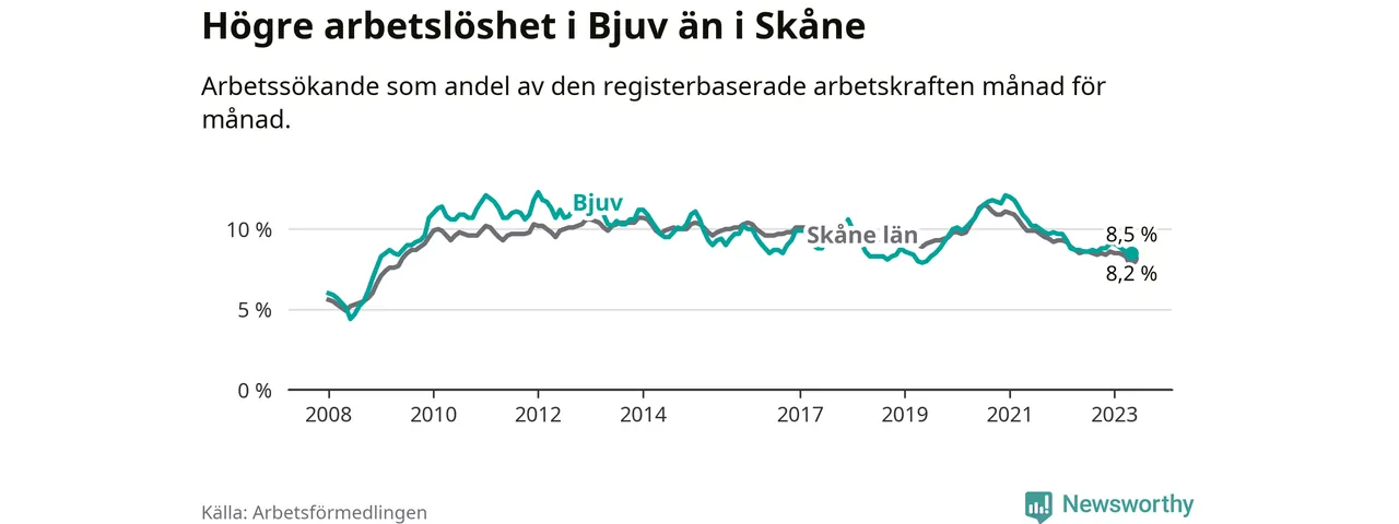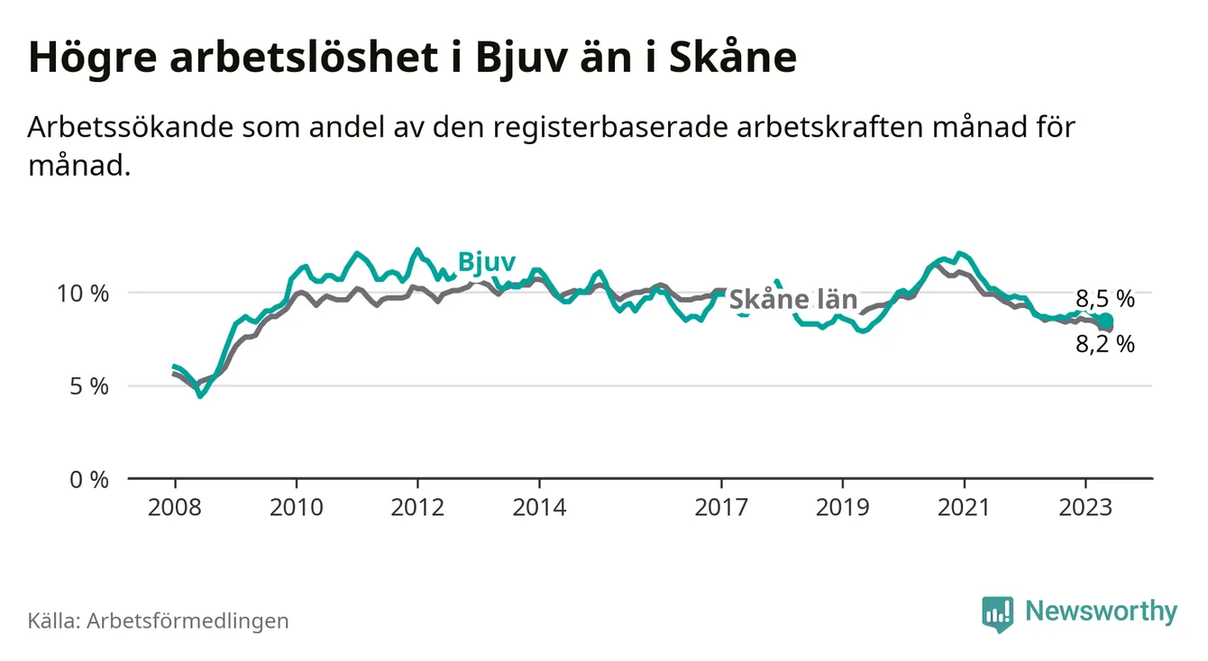 Under maj månad rapporterade Bjuvs kommun en total arbetslöshet på 8,5 procent. Det är en minskning jämfört med samma tidpunkt i fjol (−0,2 procentenheter). Även i Skåne län sjunker arbetslösheten .