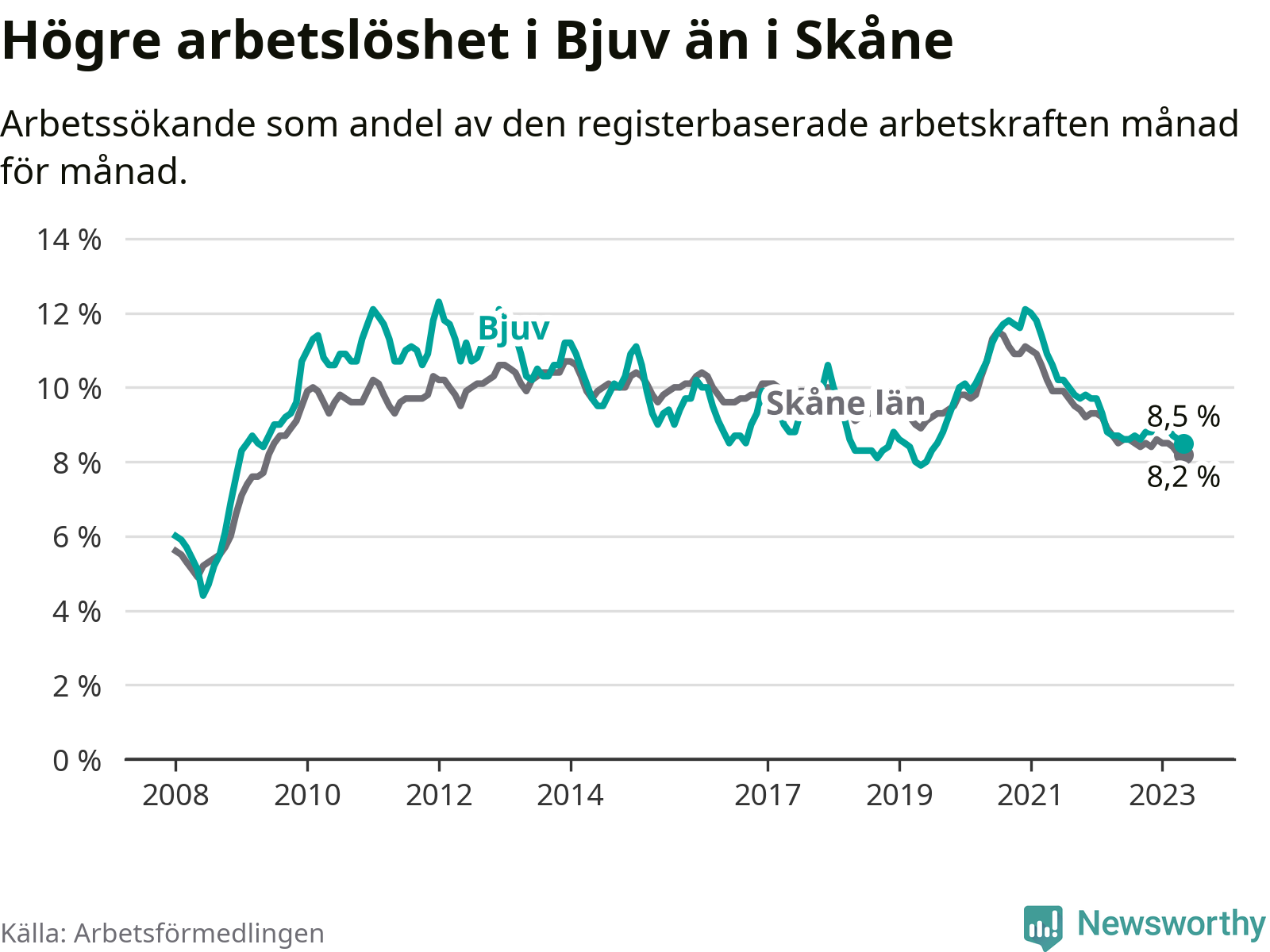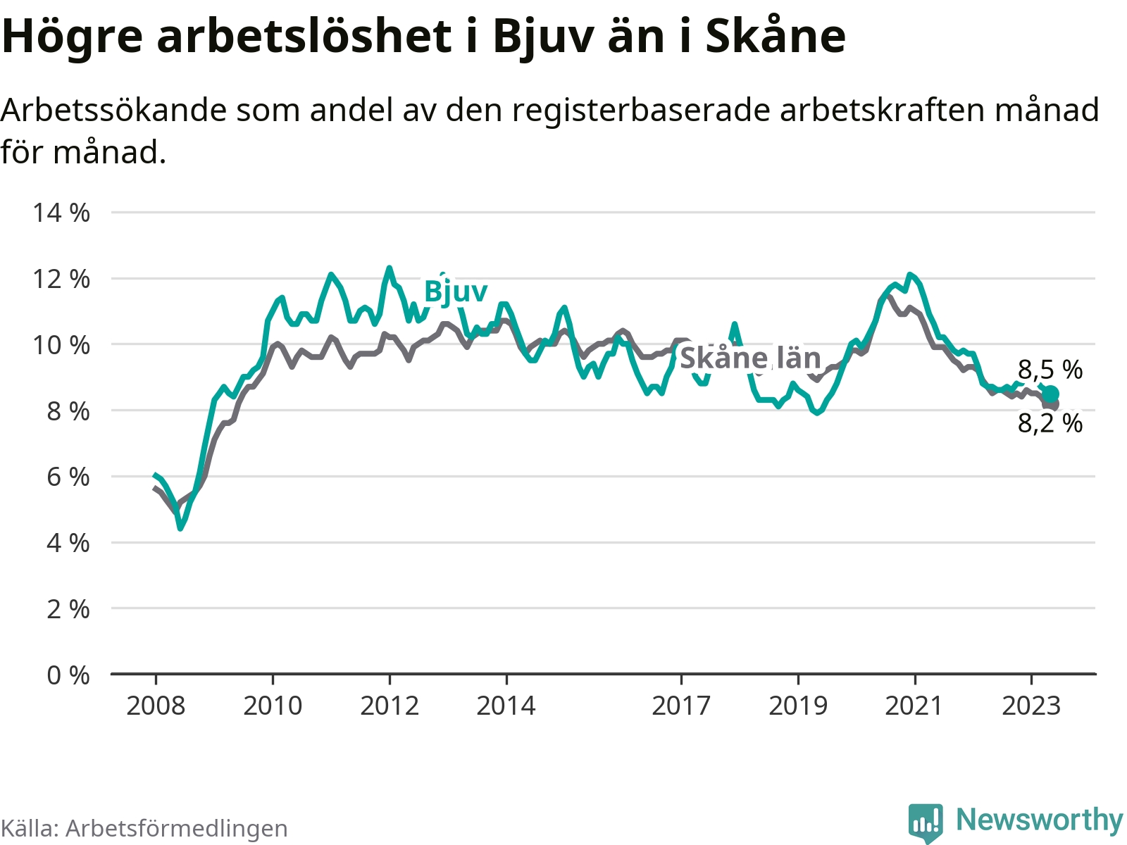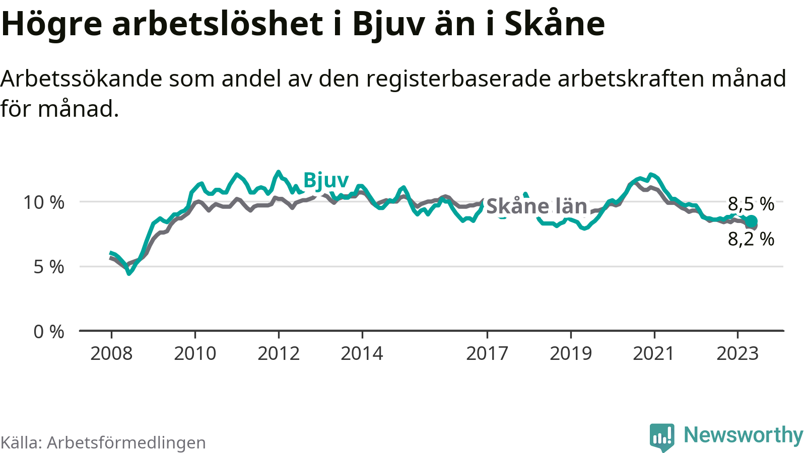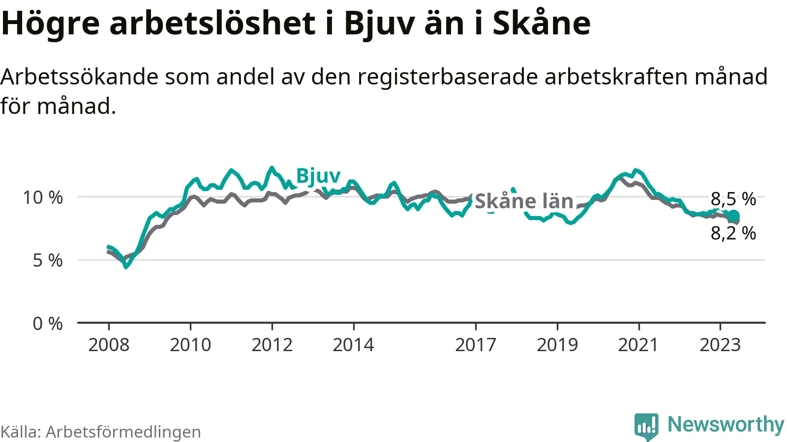 Under maj månad rapporterade Bjuvs kommun en total arbetslöshet på 8,5 procent. Det är en minskning jämfört med samma tidpunkt i fjol (−0,2 procentenheter). Även i Skåne län sjunker arbetslösheten .