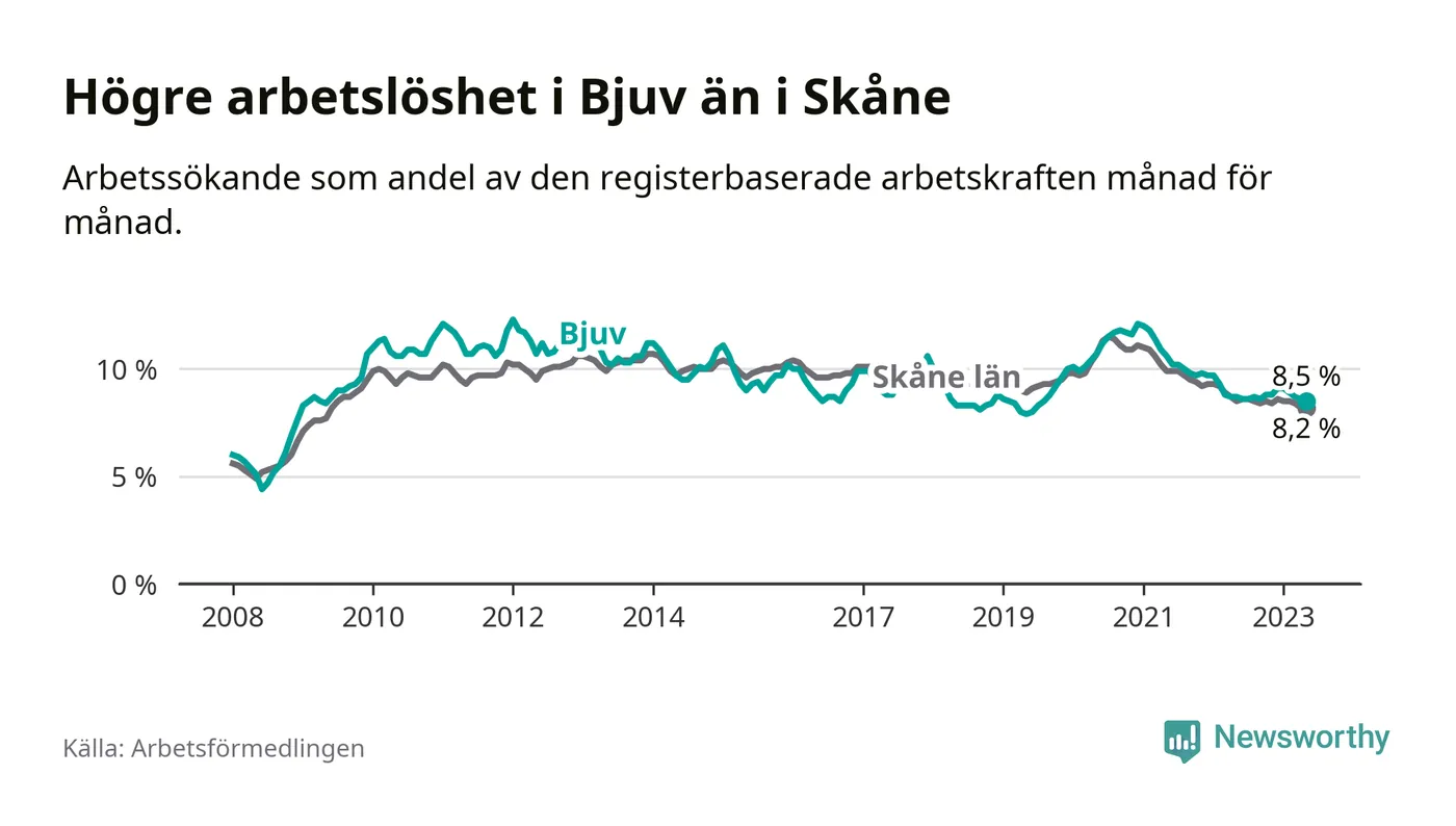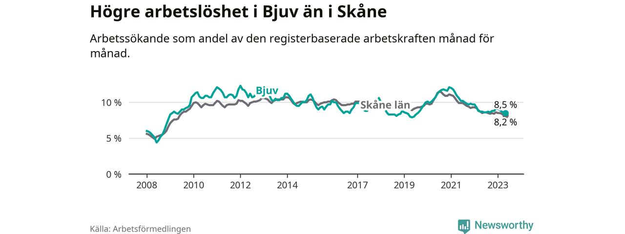 Även om arbetslösheten i Bjuv alltså minskar, så ligger den fortfarande över snittet i hela Skåne län (8,5 procent i kommunen, jämfört med 8,2 procent i hela länet). Lomma har den lägsta arbetslösheten i länet (3,1 procent), medan Perstorp har den högsta (11,8 procent). För att Bjuv skulle komma ner i samma arbetslöshetsnivå som Lomma skulle 414 personer behöva sysselsättas.