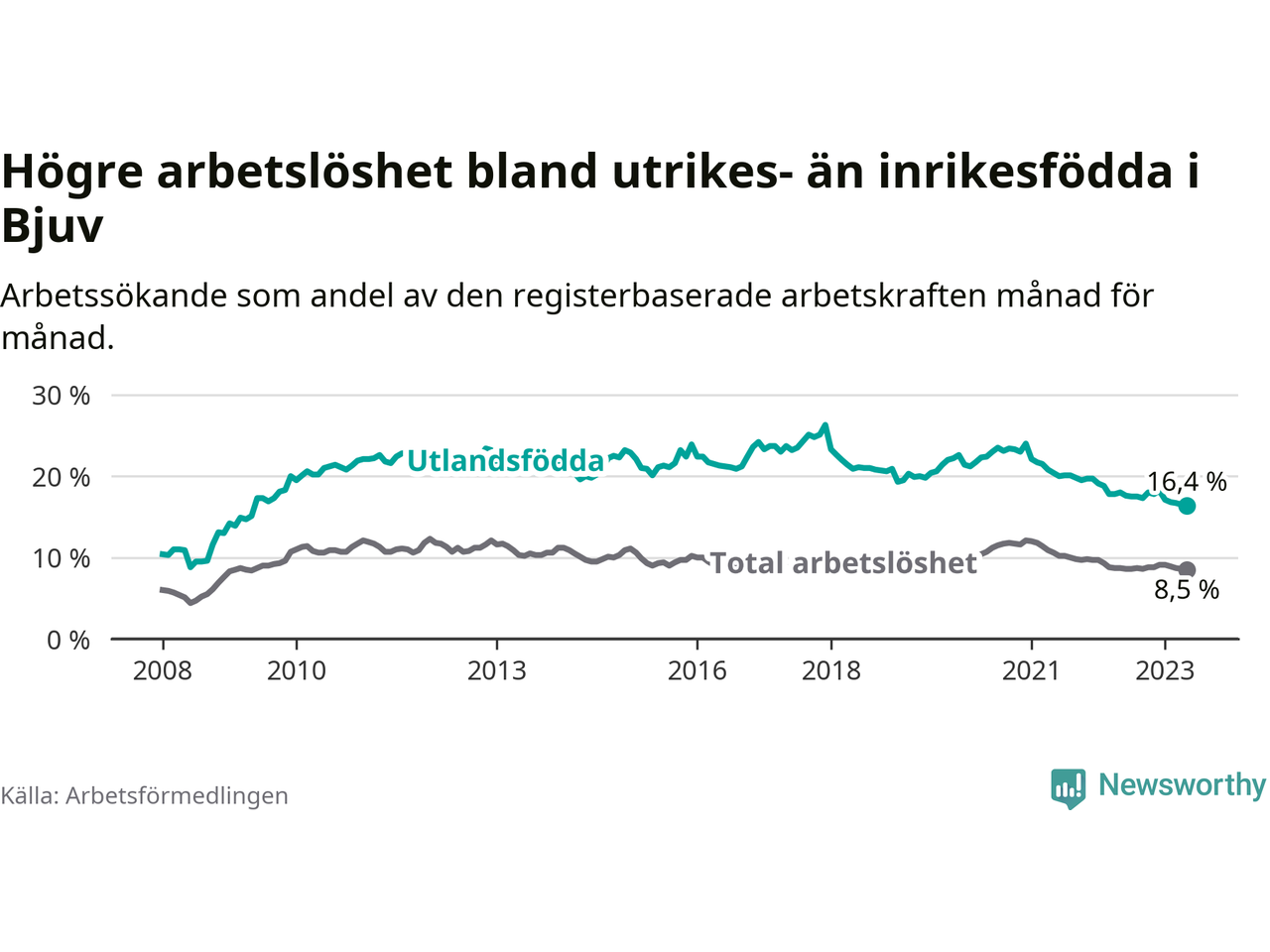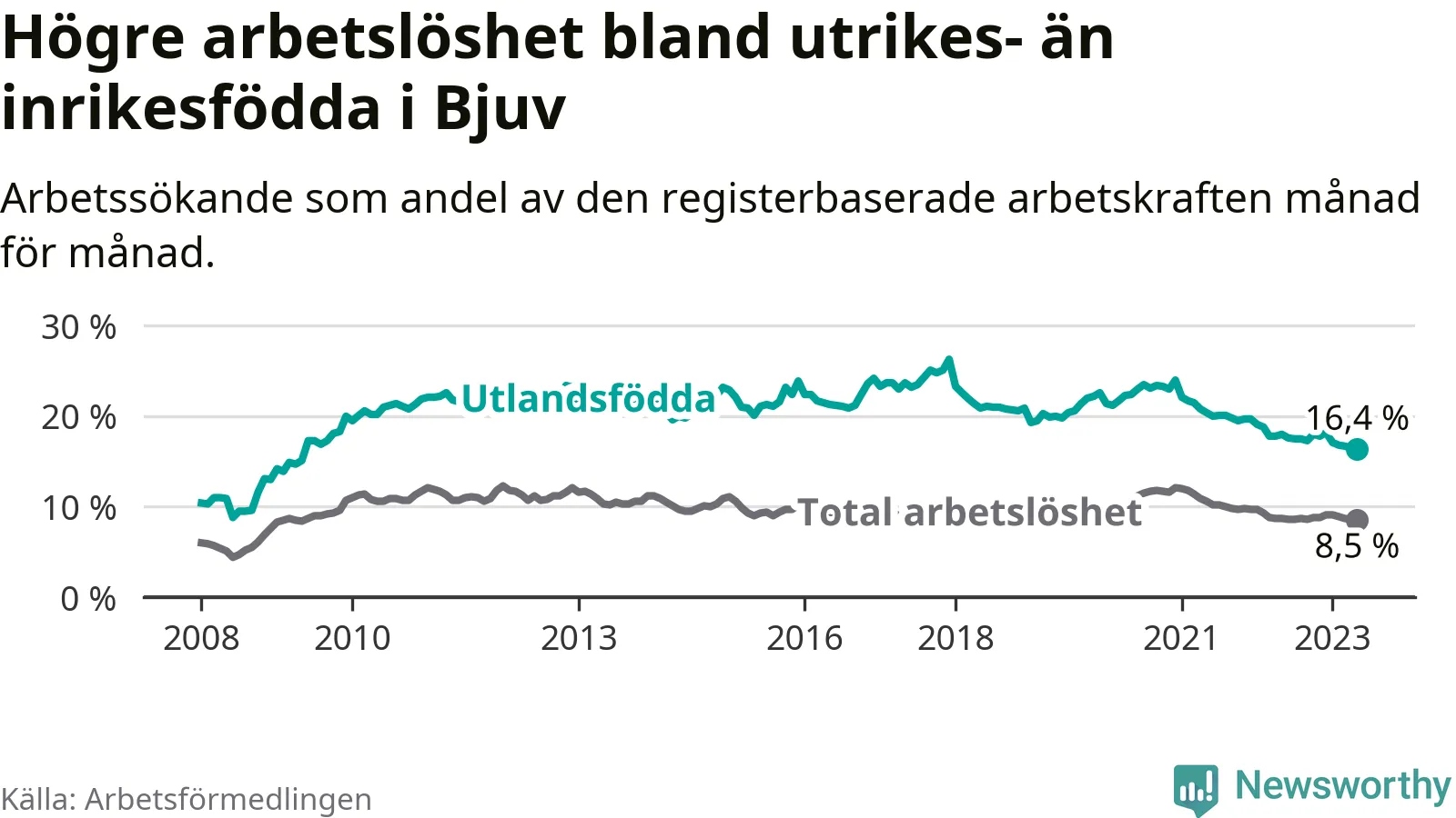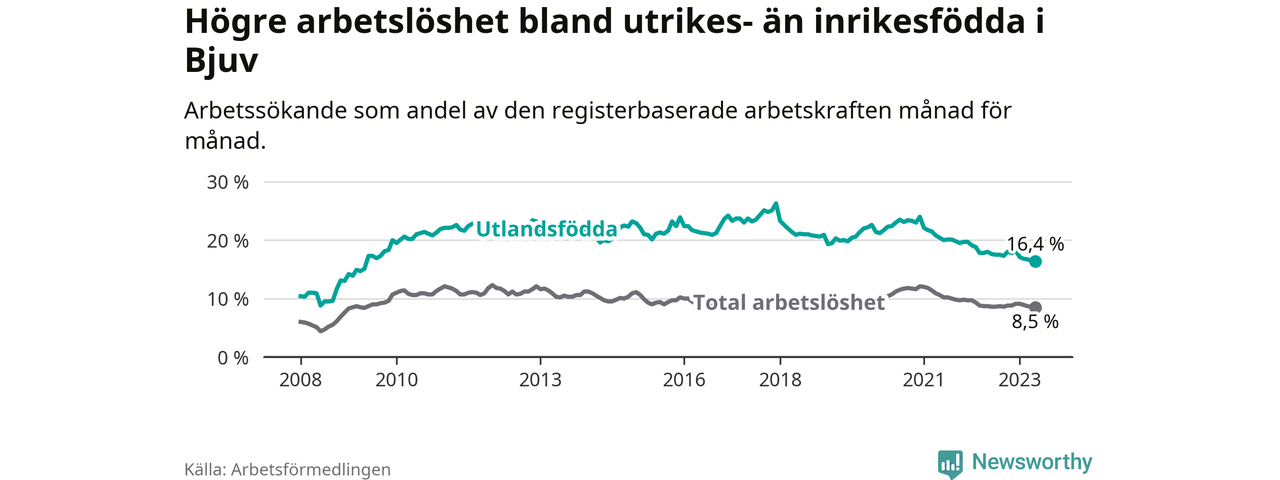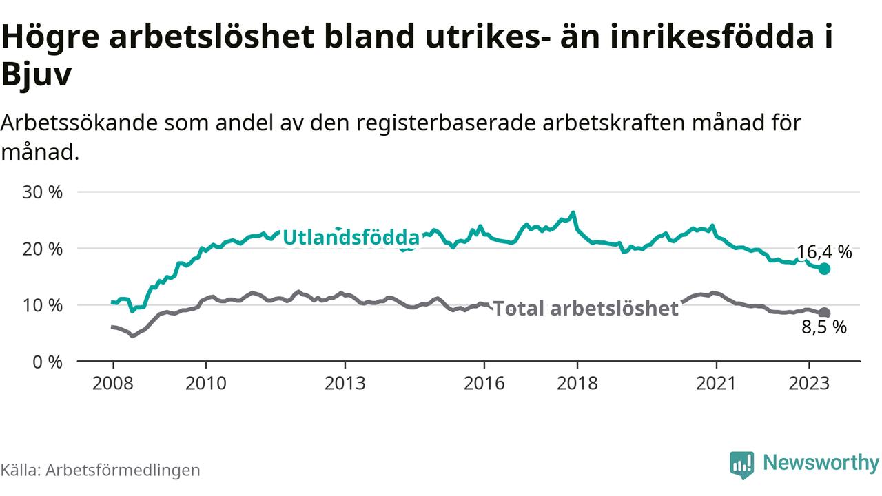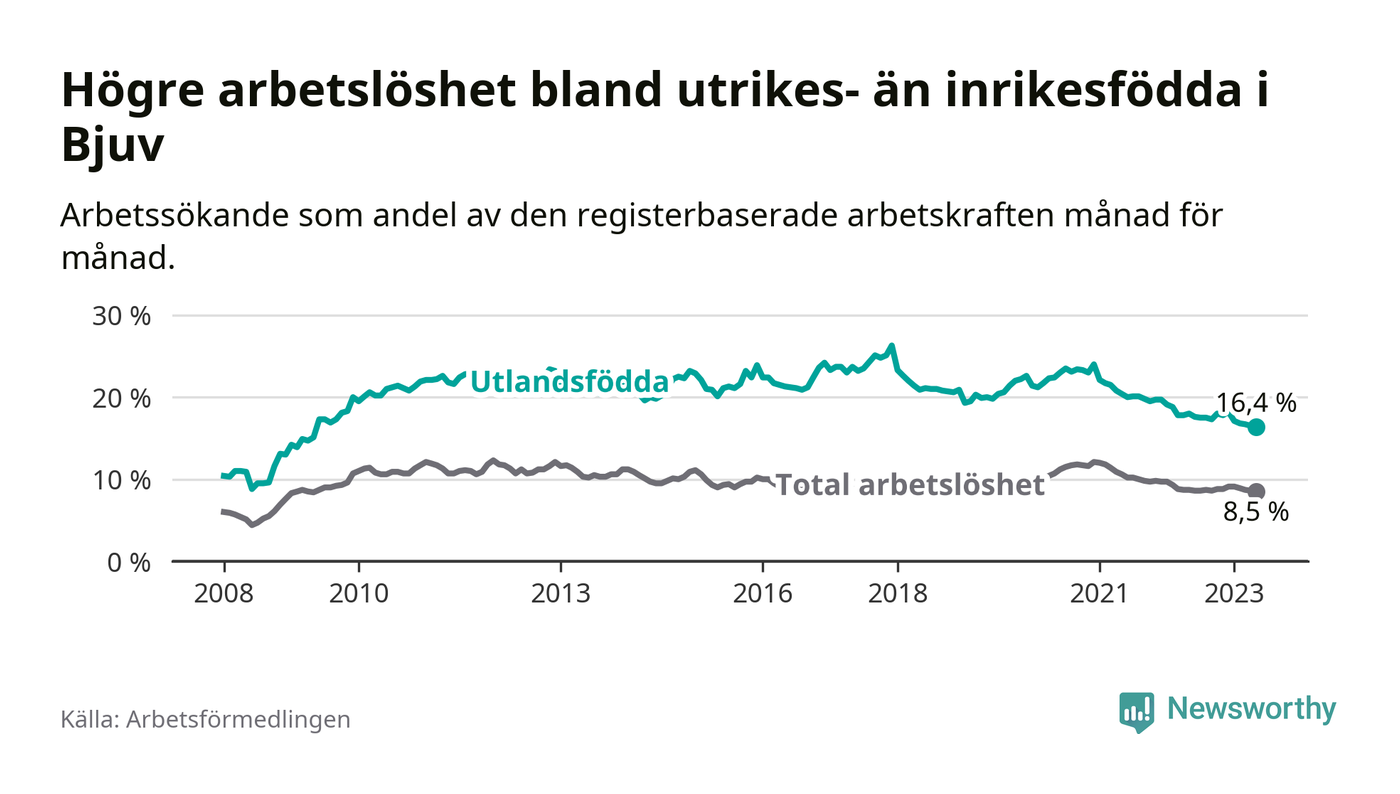 Skillnaden i arbetslöshet mellan utrikesfödda och hela befolkningen är 7,9 procentenheter i Bjuv. Det är en mindre skillnad än för ett år sedan (−1,4 procentenheter).
