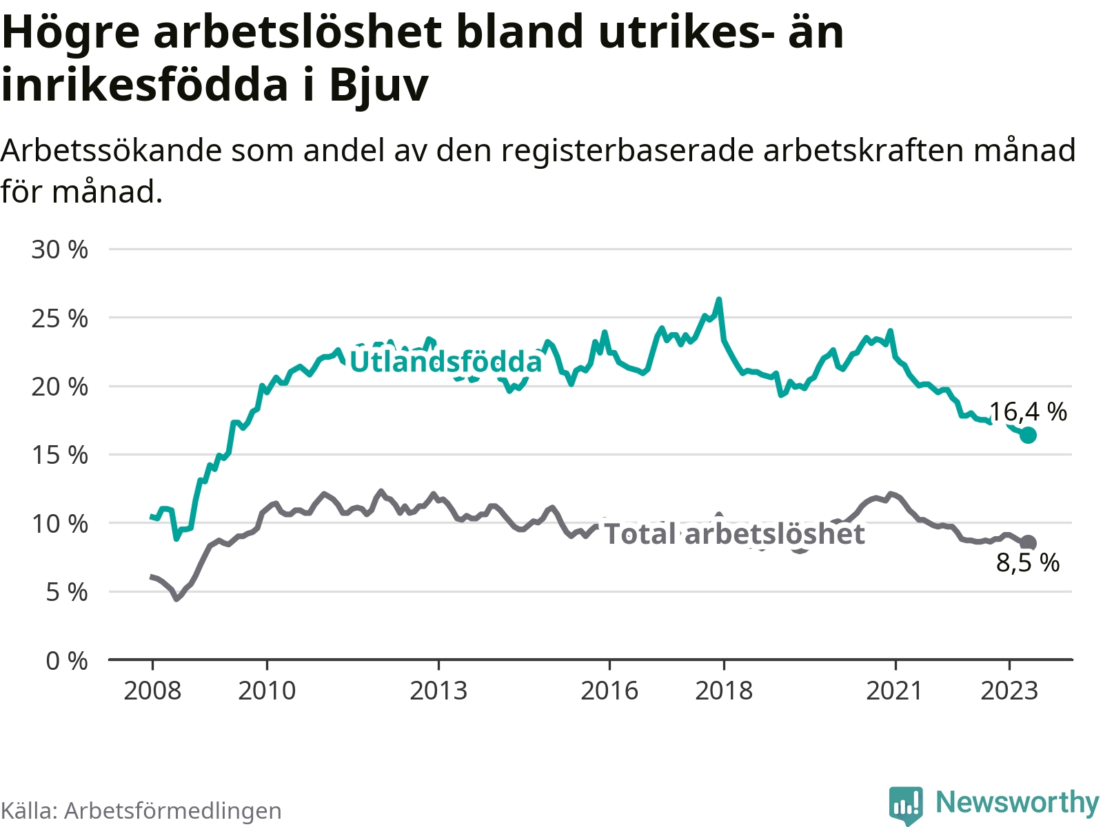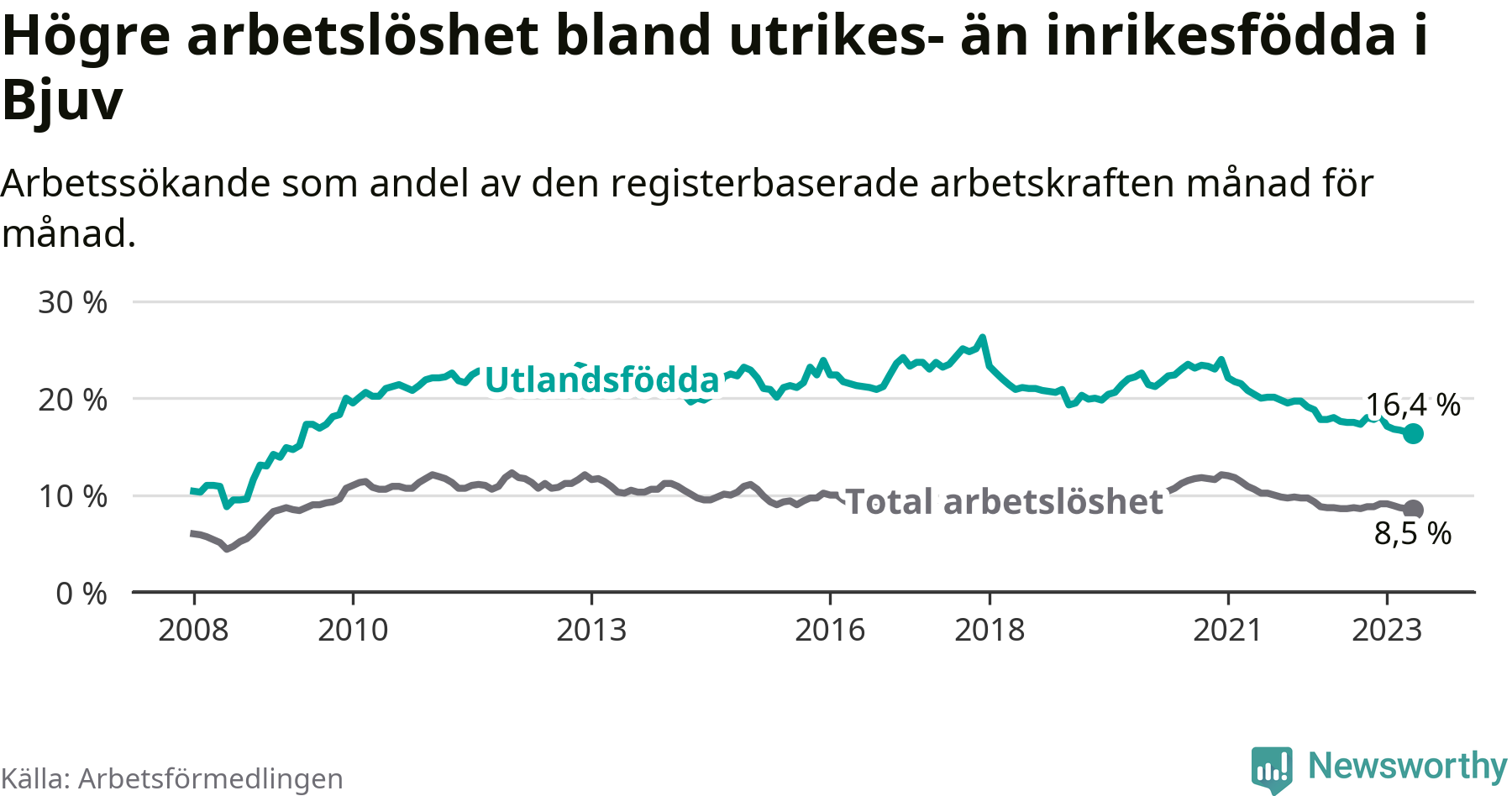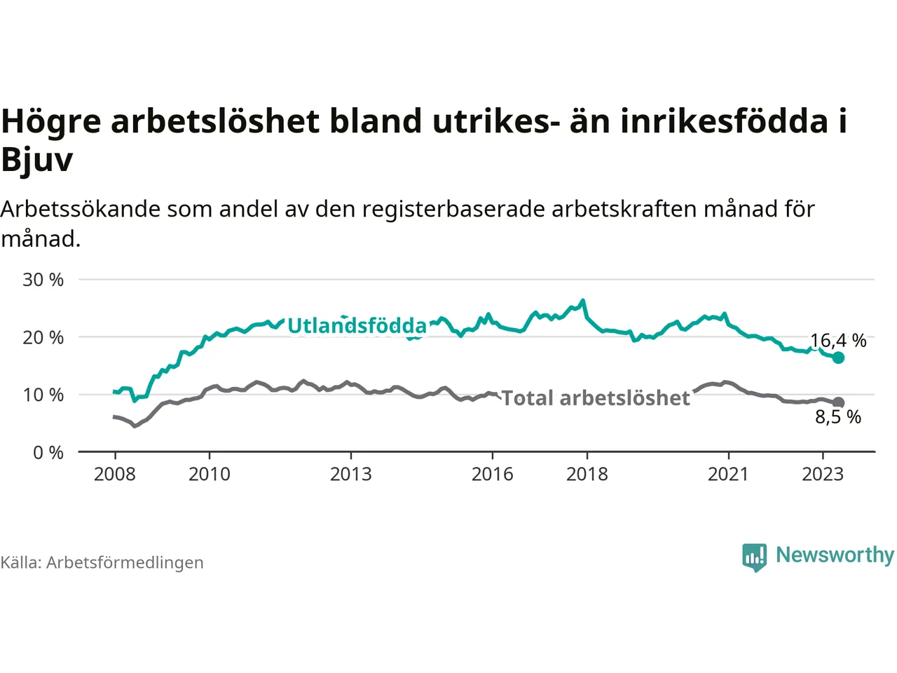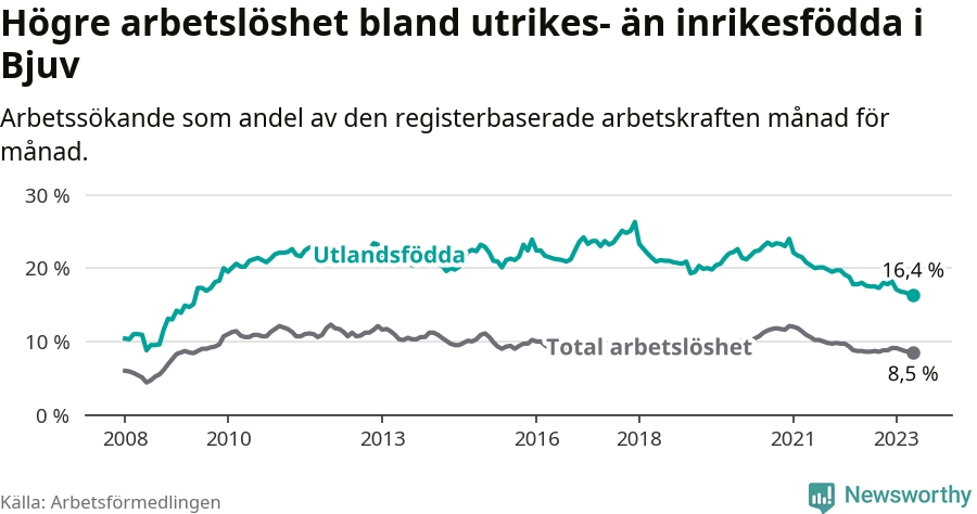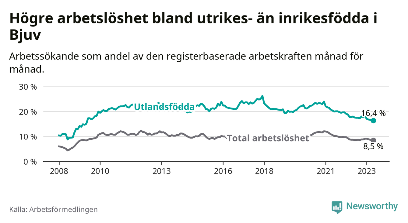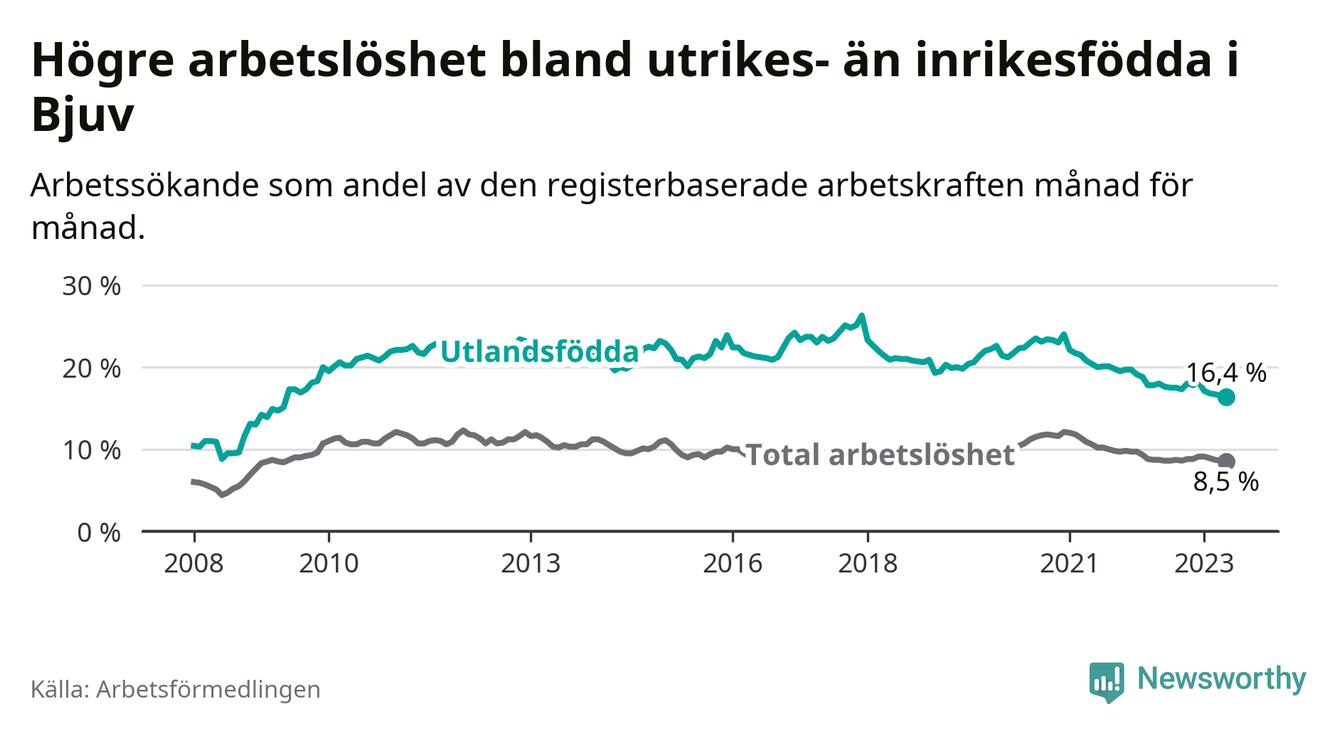 Arbetslösheten bland utlandsfödda var 16,4 procent i Bjuv under maj månad, motsvarande 384 av 2 341 personer. Det är 1,6 procentenheter färre än vid samma tidpunkt i fjol (+2 om man räknar personer). Därmed har de utlandsföddas arbetslöshet varit lägre än vid samma tidpunkt i fjol i över två år i sträck. Sedan februari 2021 har arbetslösheten bland utlandsfödda minskat från 21,7 till 16,4 procent. Den nuvarande arbetslöshetsnivån är den lägsta sedan maj 2009.