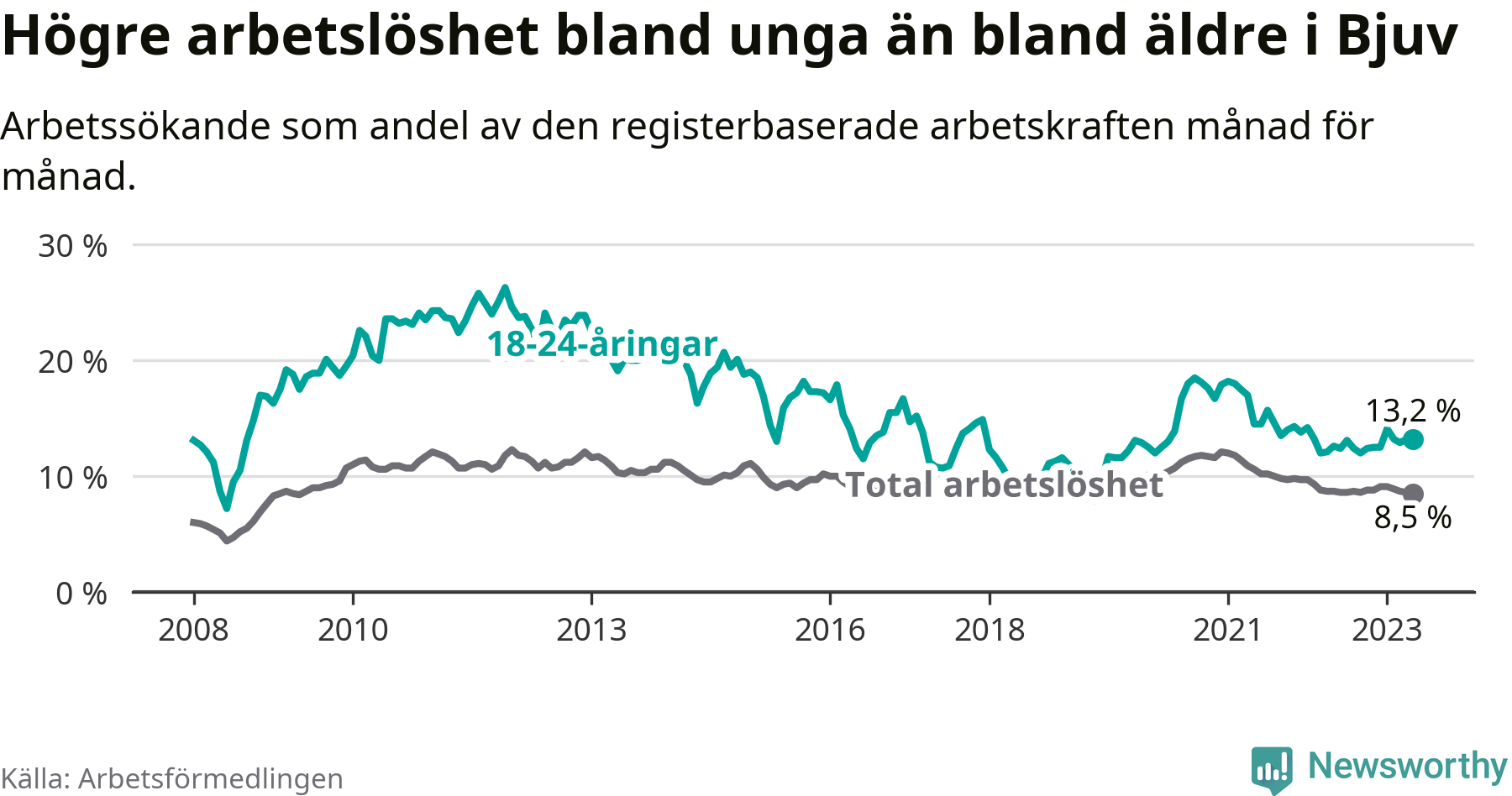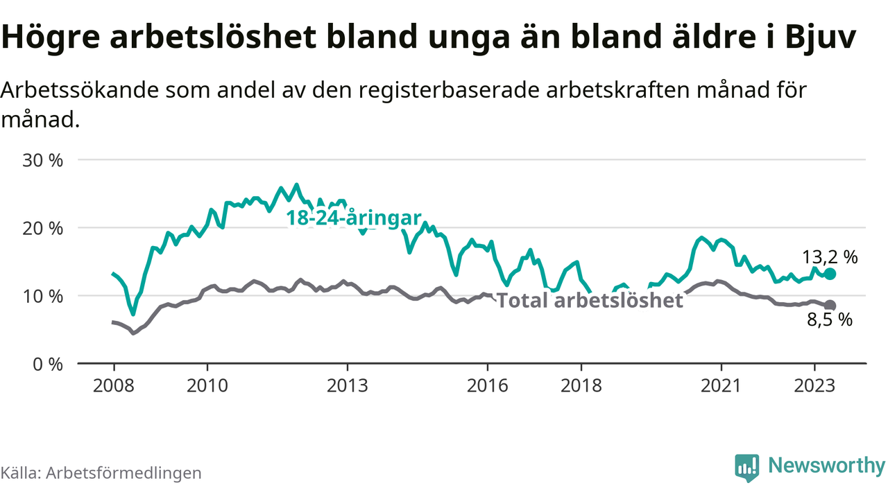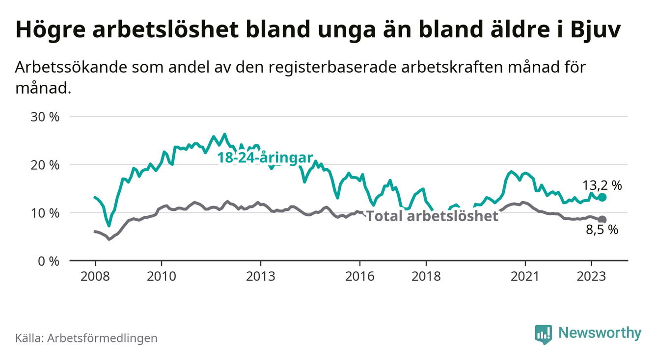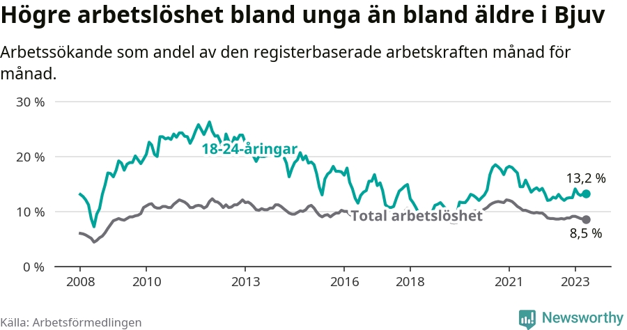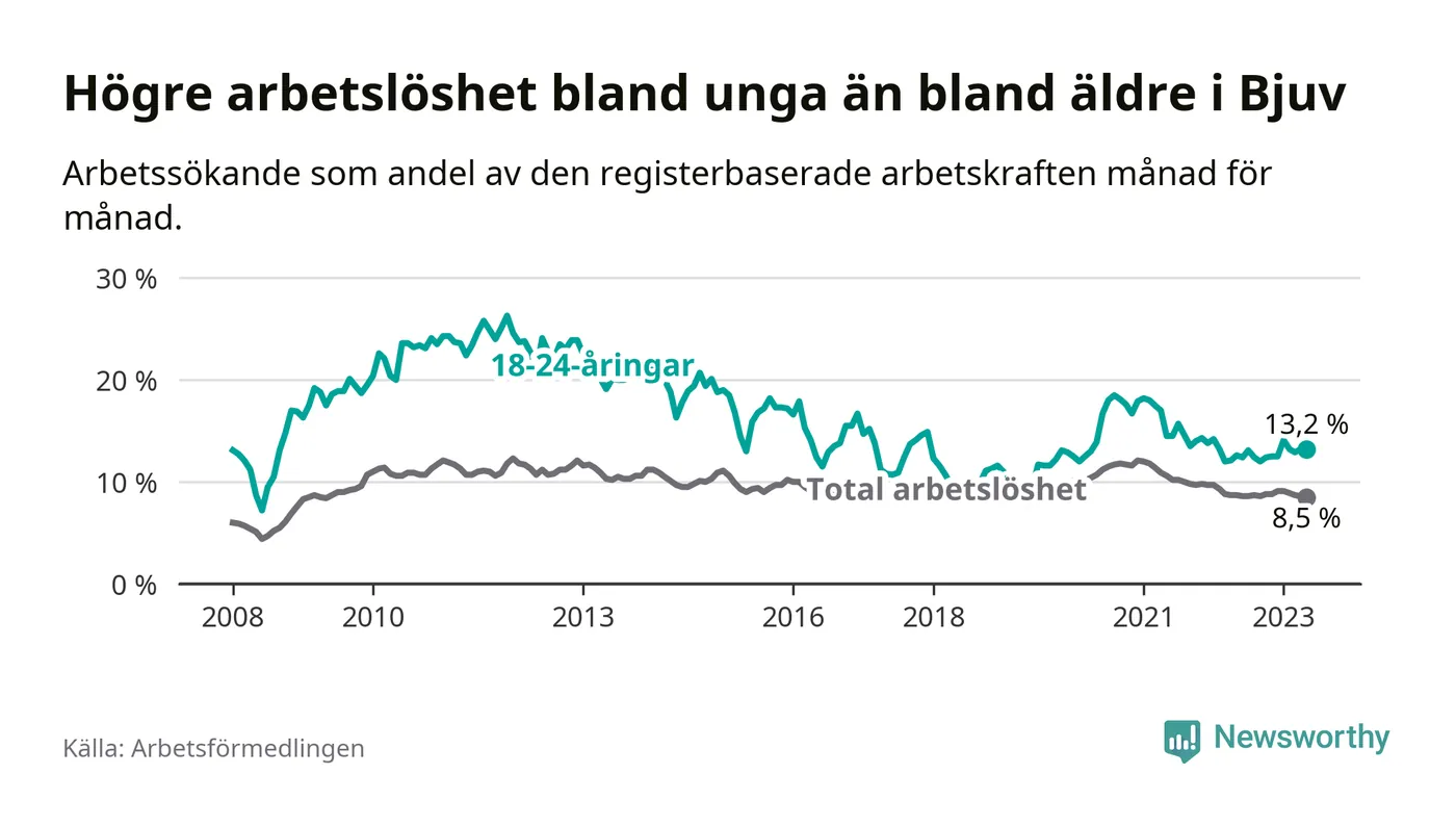 Till skillnad från den totala arbetslösheten stiger arbetslösheten bland unga (+0,6 procentenheter). I maj var 13,2 procent av 18–24-åringarna inskrivna som arbetssökande (motsvarande 101 personer). Mäter vi antalet inskrivna ser vi en ökning med elva personer på ett års sikt.