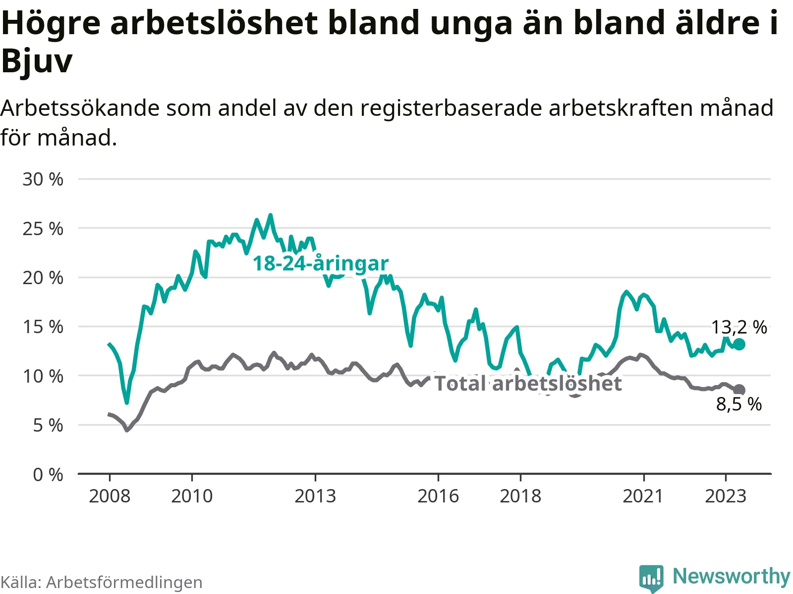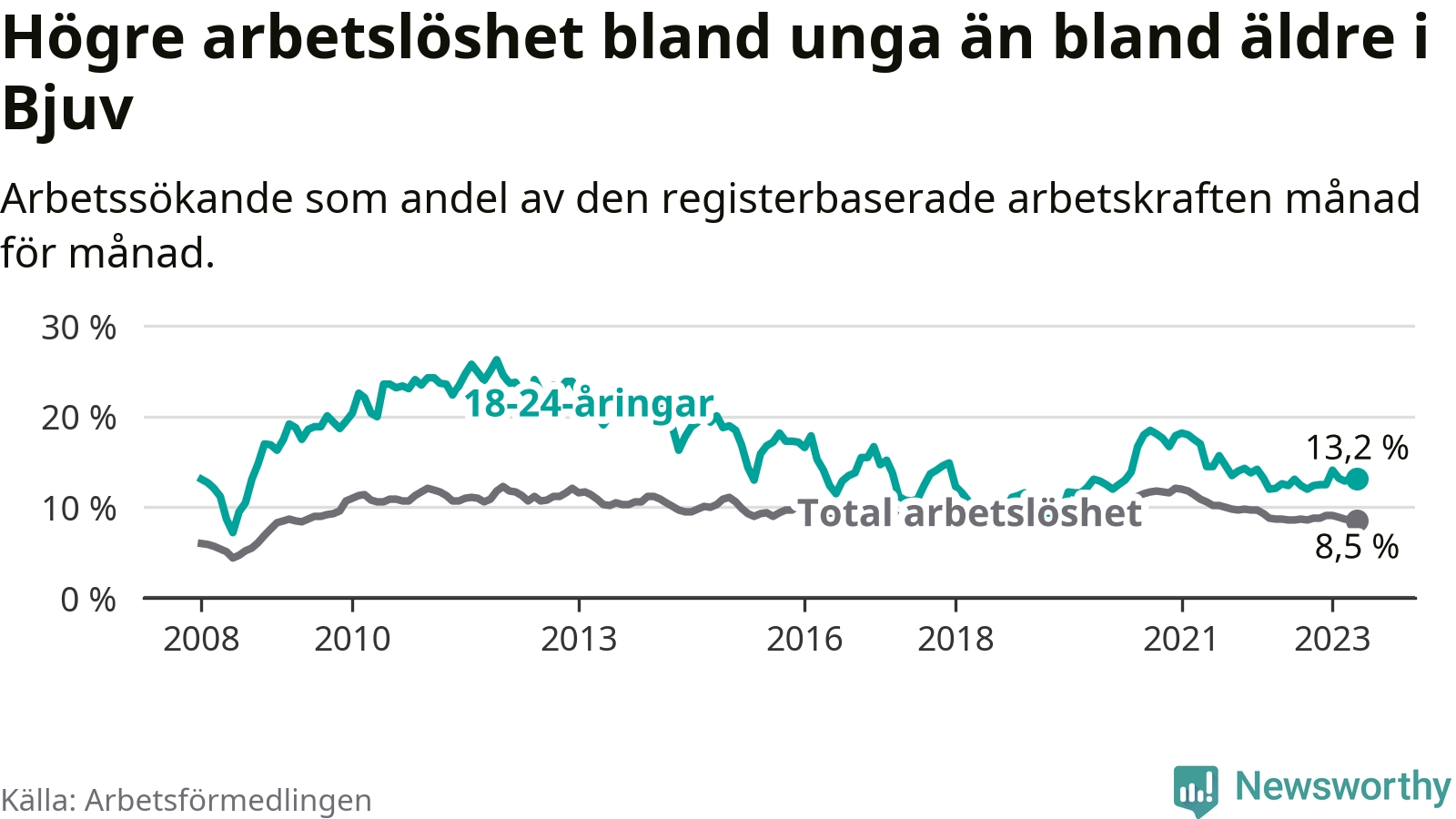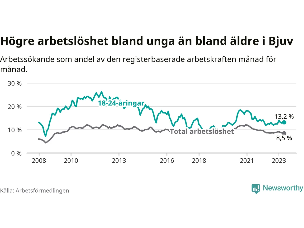 Till skillnad från den totala arbetslösheten stiger arbetslösheten bland unga (+0,6 procentenheter). I maj var 13,2 procent av 18–24-åringarna inskrivna som arbetssökande (motsvarande 101 personer). Mäter vi antalet inskrivna ser vi en ökning med elva personer på ett års sikt.