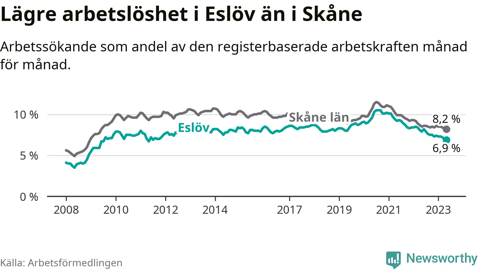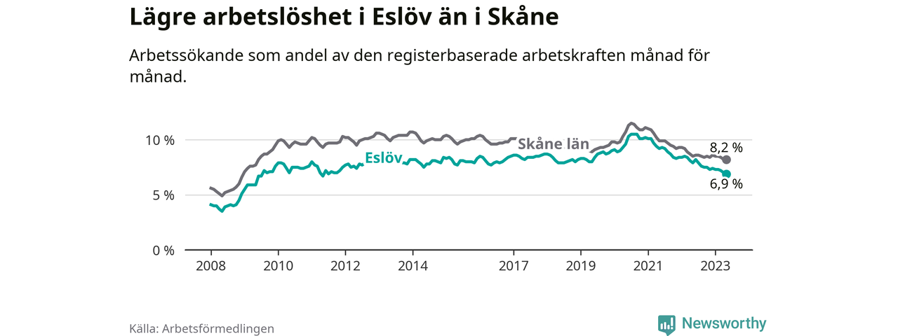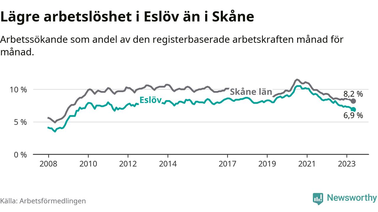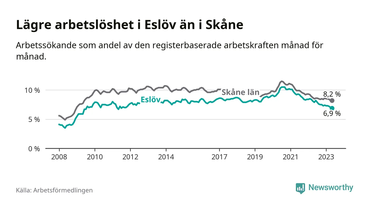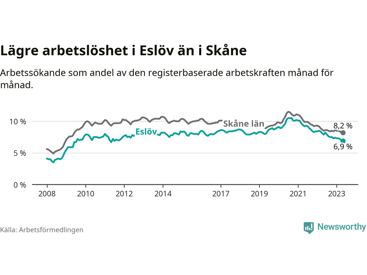 Det är 25:e månaden i följd som arbetslösheten i Eslöv är lägre än den var under samma tidpunkt året innan. Sedan april 2021 har arbetslösheten gått ner från 9,4 till 6,9 procent. Den nuvarande arbetslöshetsnivån är därmed den lägsta sedan juli 2011.